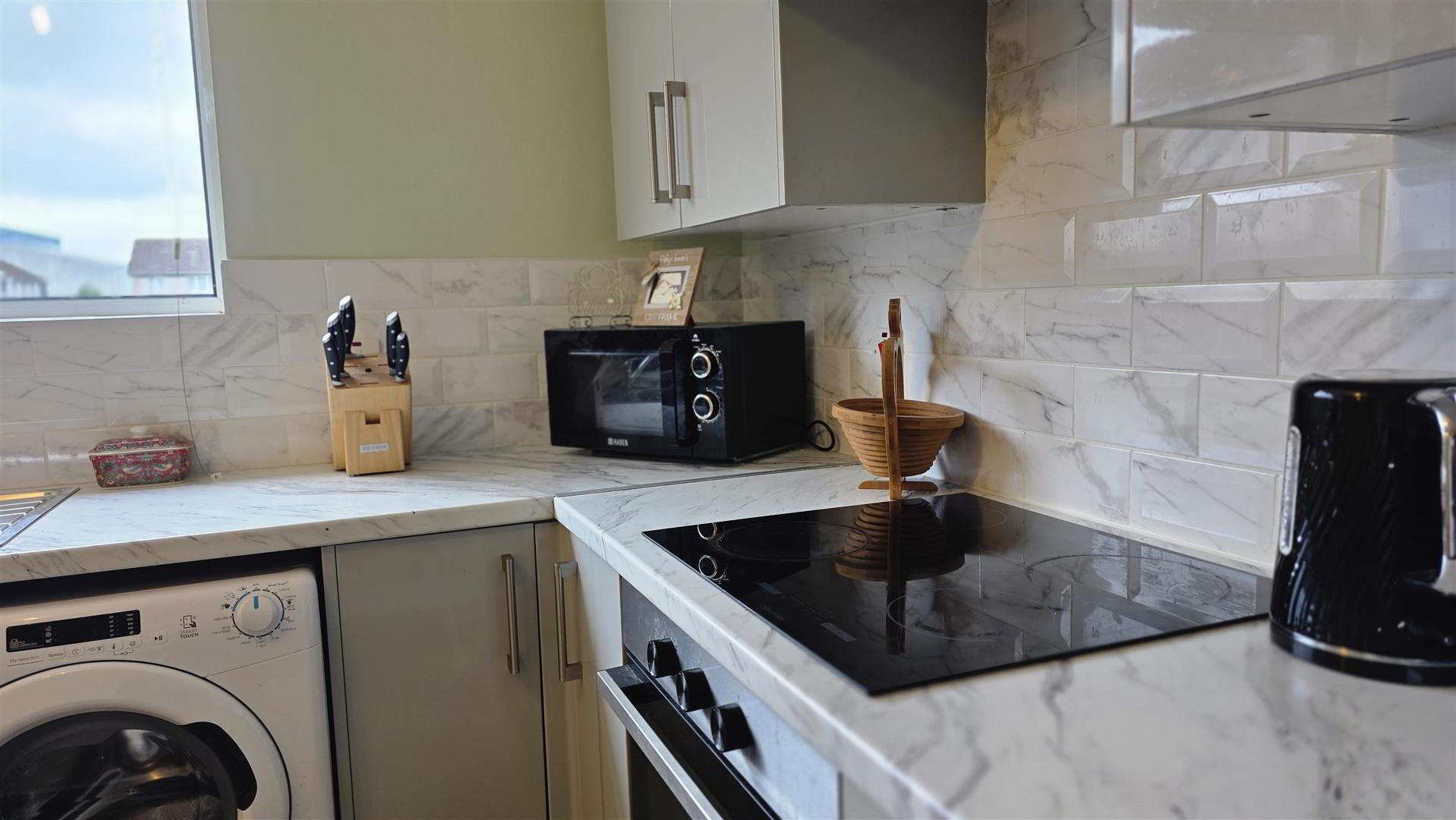 - Full range of contemporary style grey high gloss high and low level units with chrome handles and complimentary work surfaces. One and a quarter bowl single drainer stainless steel sink unit with mixer taps. Integrated four ring halogen hob with stainless steel pyramid style over head extractor fan. Low level combination oven and grill. Plumbed for washing machine. Space for fridge freezer. Plumbed for dish washer. Wood effect fully tiled floor. Part tiled walls to work surfaces. Open to under stair storage. Meter cupboard. Double radiator. Hard wood door to rear with gothic style window.