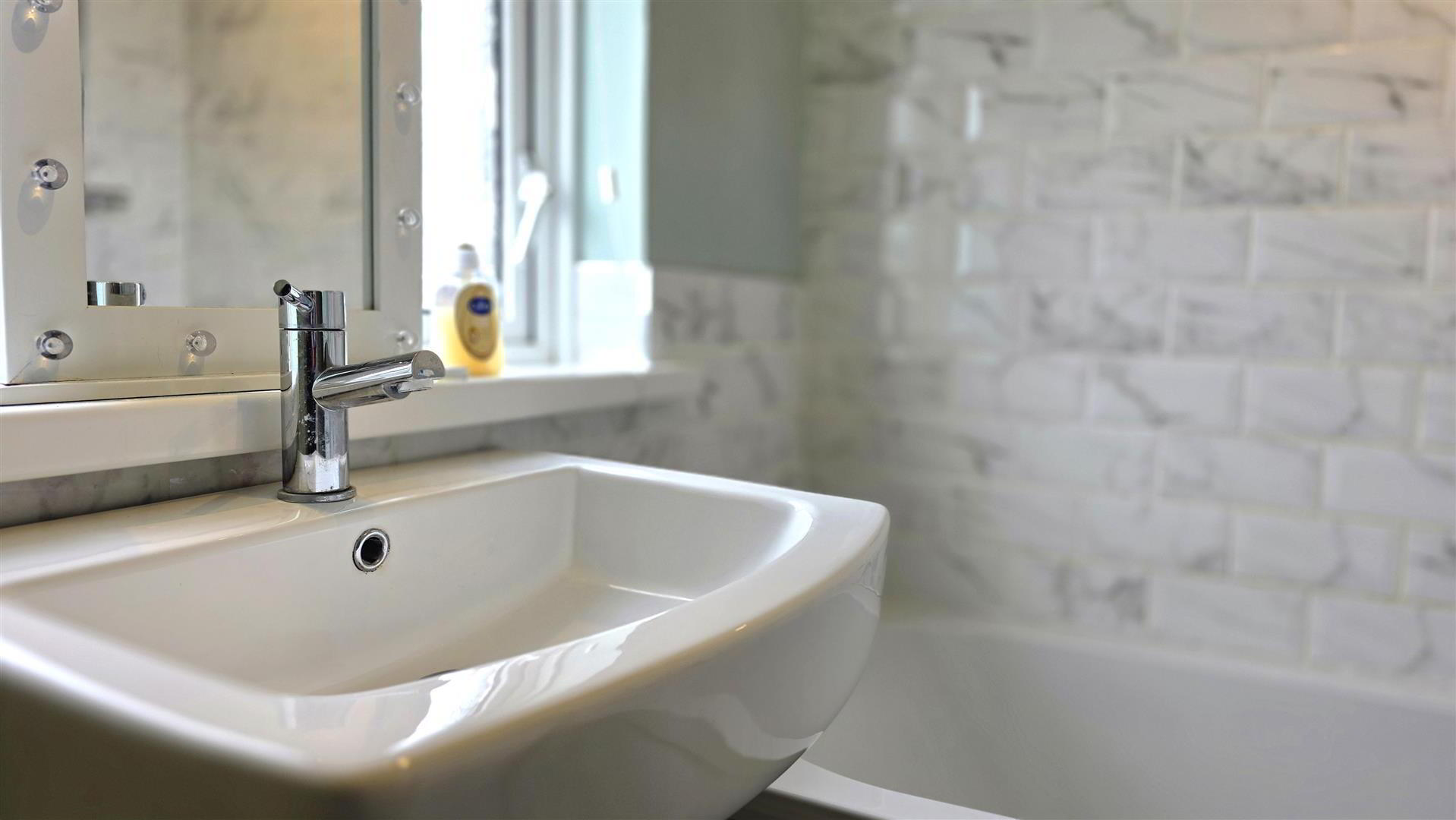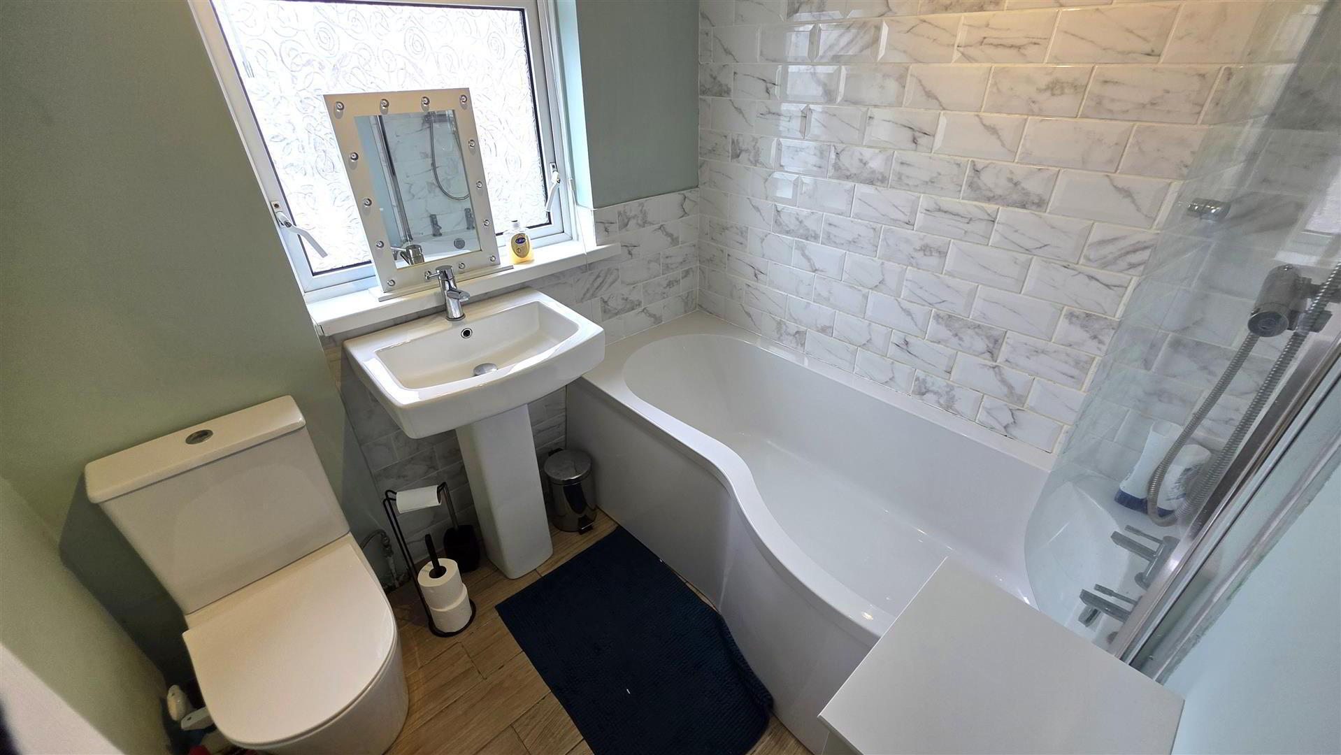 - Modern white suite comprising "P" shaped shower bath with glazed, curved screen and thermostatic shower unit. Push button low flush W/C and pedestal wash hand basin with "monobloc" mixer taps. Part tiled walls to bath area. Wood effect fully tiled floor.