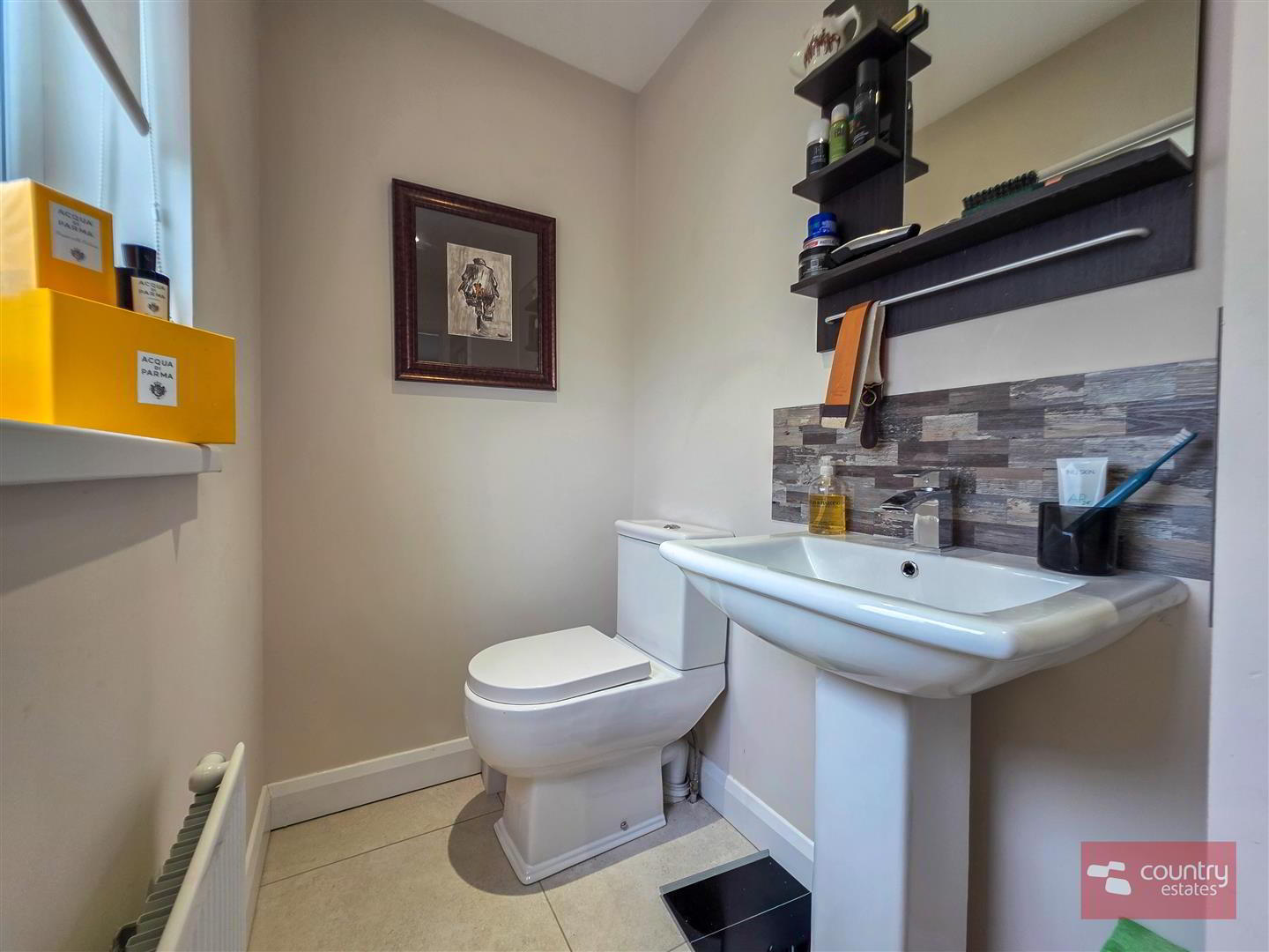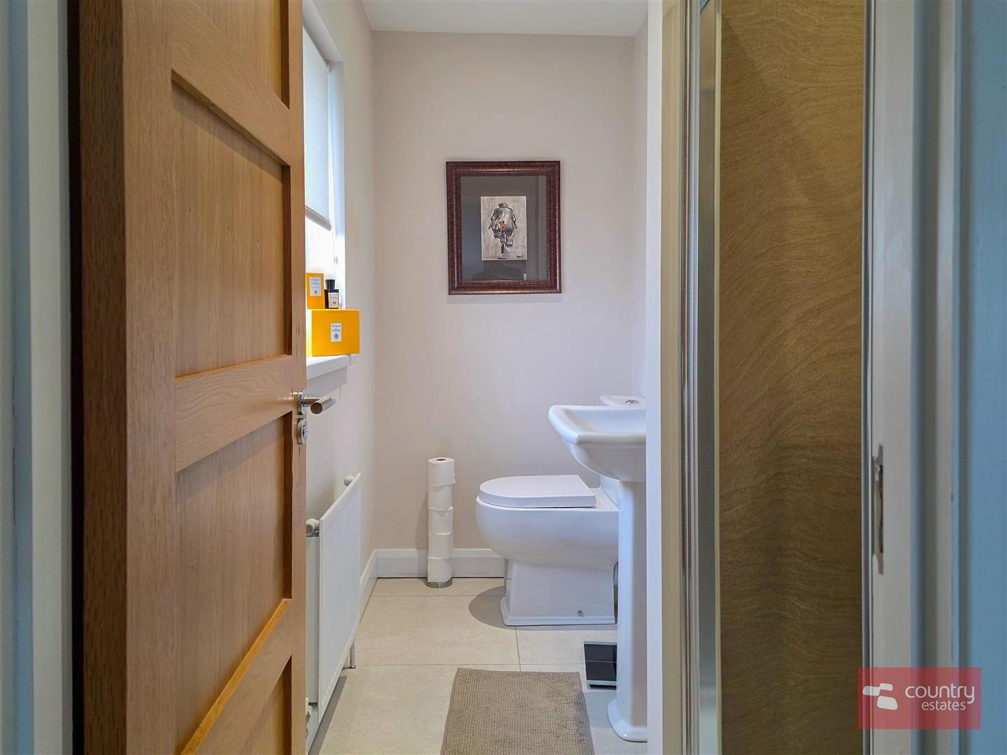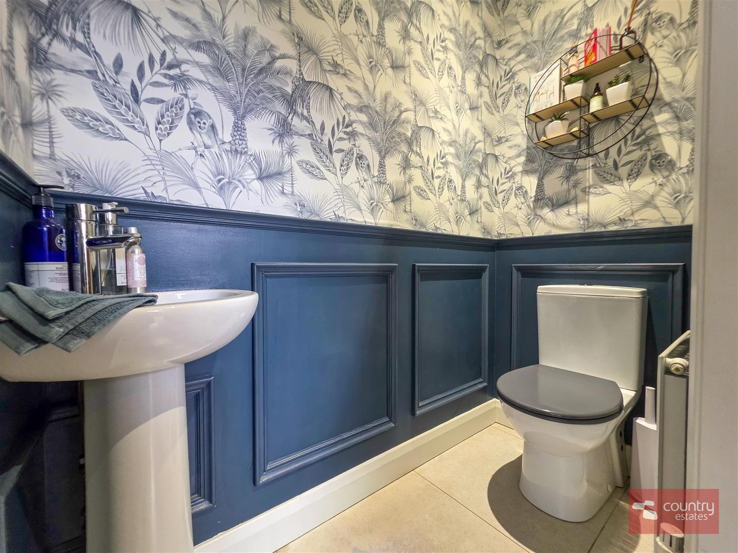 - Comprising pedestal wash hand basin and button flush w.c. Half panelled walls.