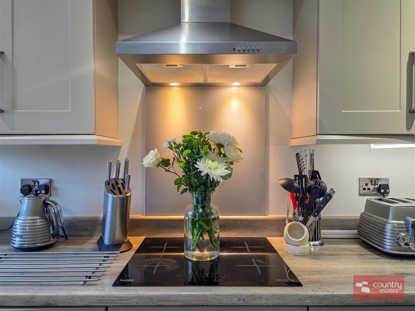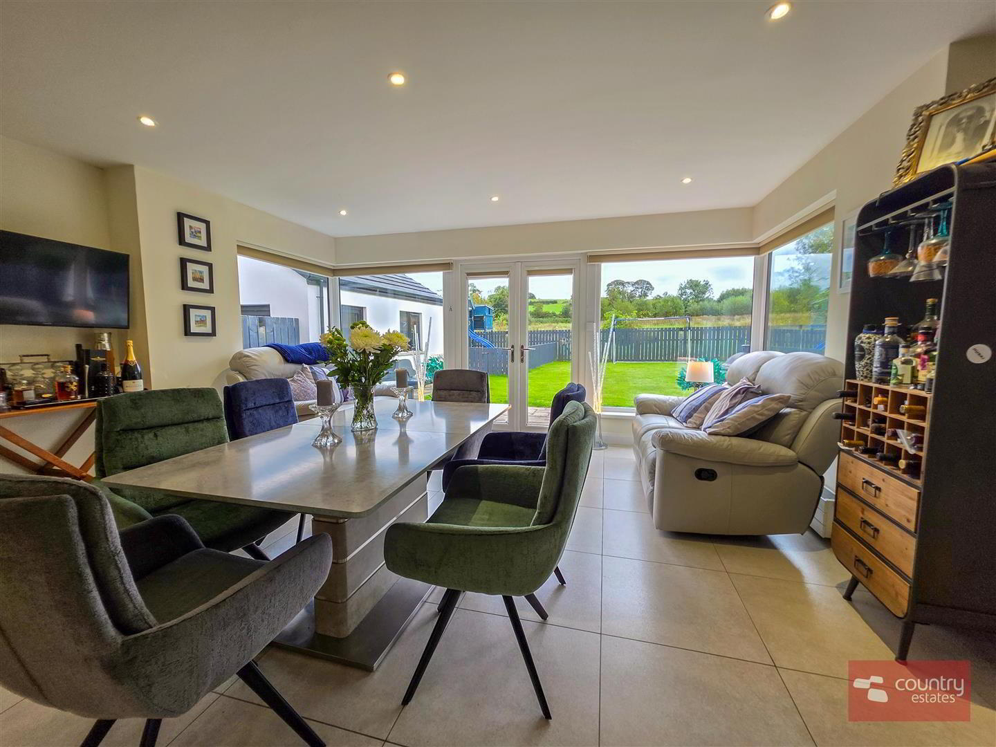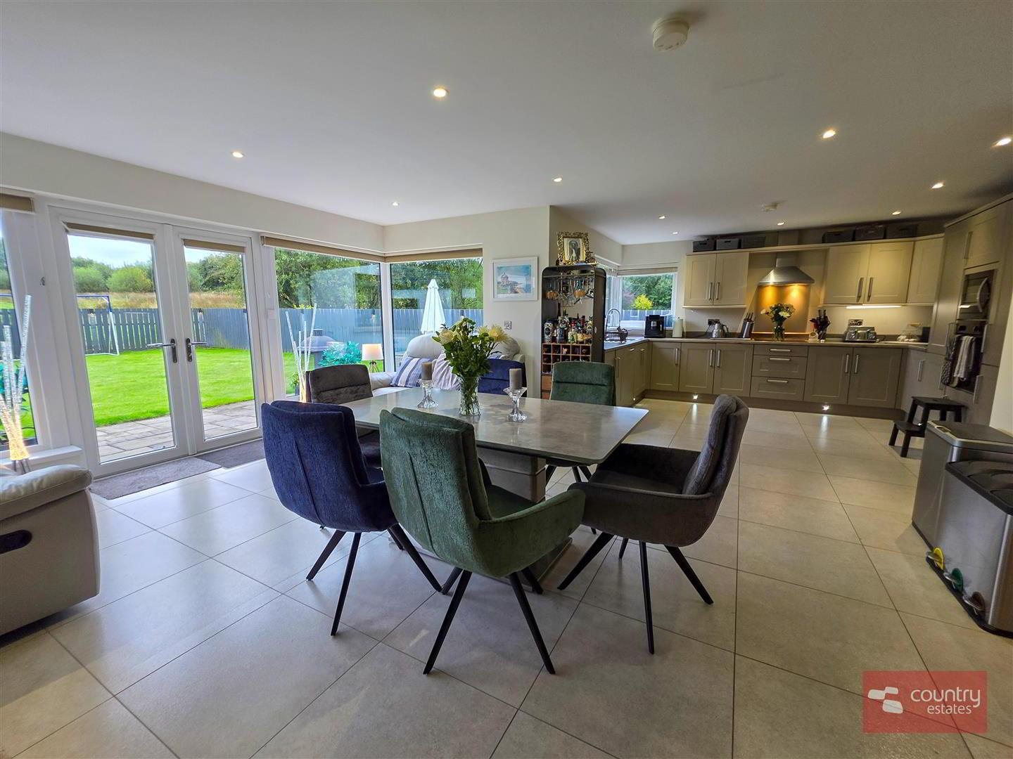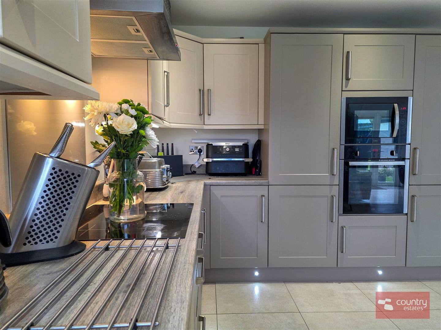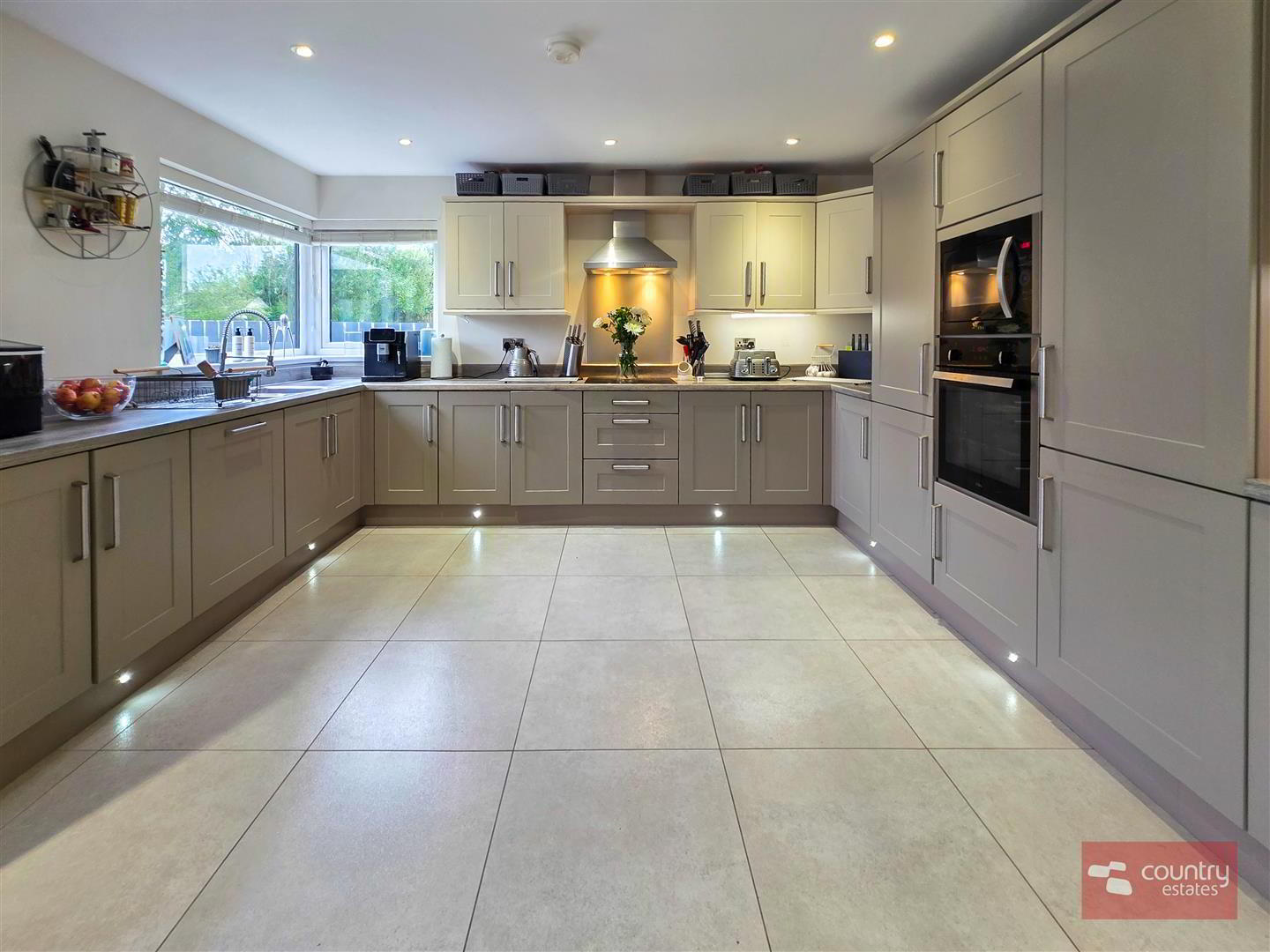 - At max. Incorporating a luxury shaker fitted kitchen in contrasting stone and ivory finish with co-ordinating work surfaces with matching upstands. Single drainer stainless steel sink unit with swan neck flexible hose tap. A host of integrated appliances including eye level oven, full height freezer, full height fridge, dishwasher and 4 ring induction hob with overhead extractor fan housed in stainless steel canopy. Feature corner window. Casual living/ dining aspect with sun lounge extension with twin PVC double glazed French doors to patio and gardens. Tiled floor. Recessed low voltage lighting.