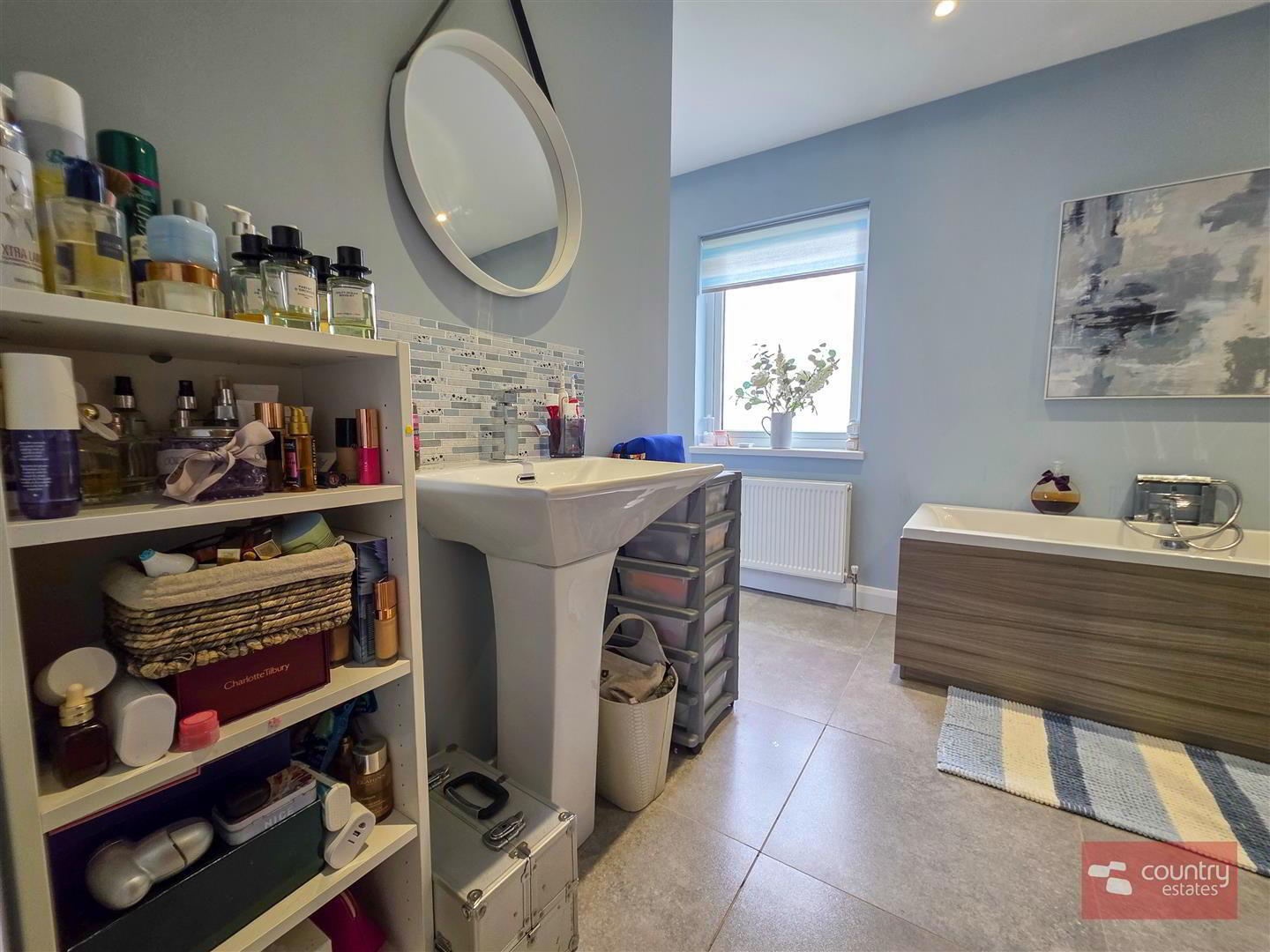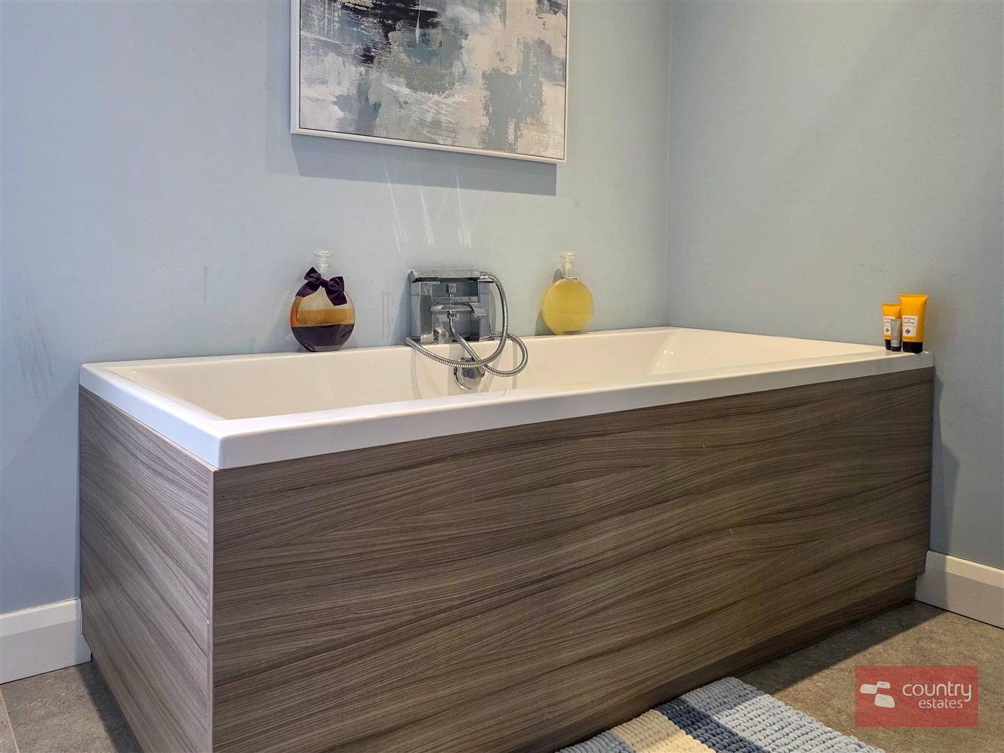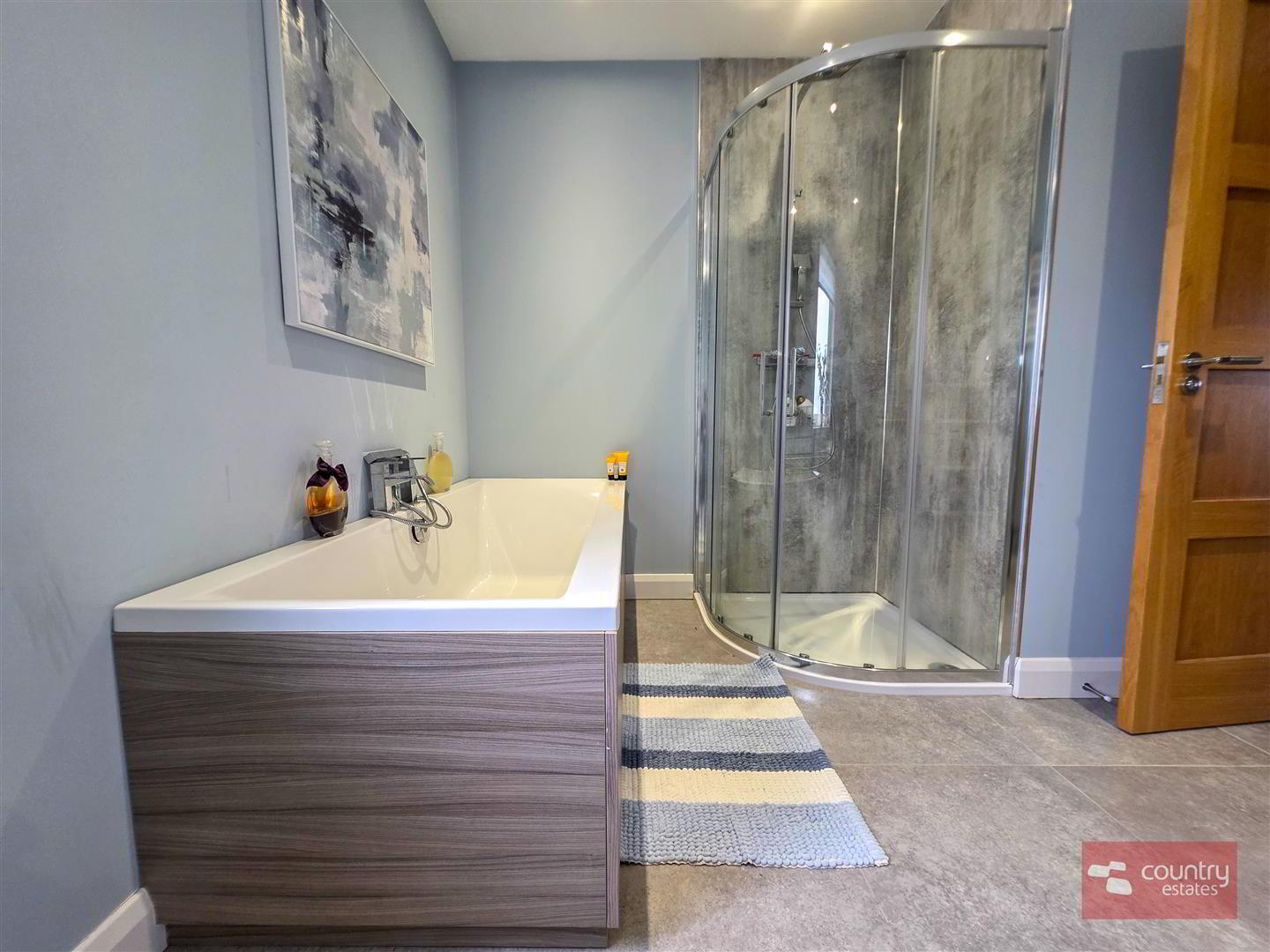 - Comprising pedestal wash hand basin with monobloc tap, panelled bath with hand shower attachment, quarter rounded shower cubicle with drench style shower and hand shower attachment. Button flush w.c. Tiled floor.