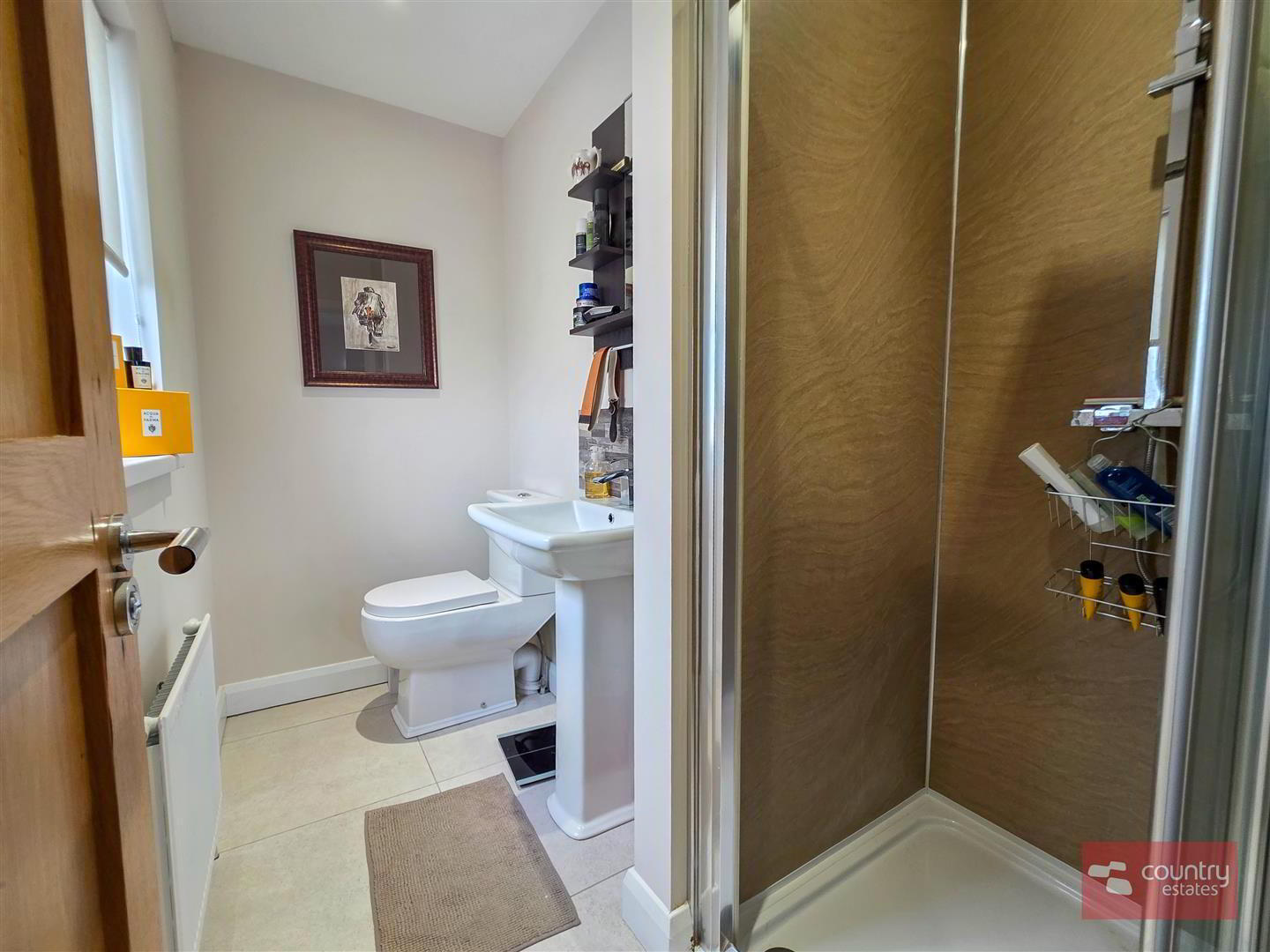 - Comprising button flush w.c, pedestal wash hand basin with monobloc tap and shower enclosure with drench style shower and hand held shower attachment. Tiled floor.