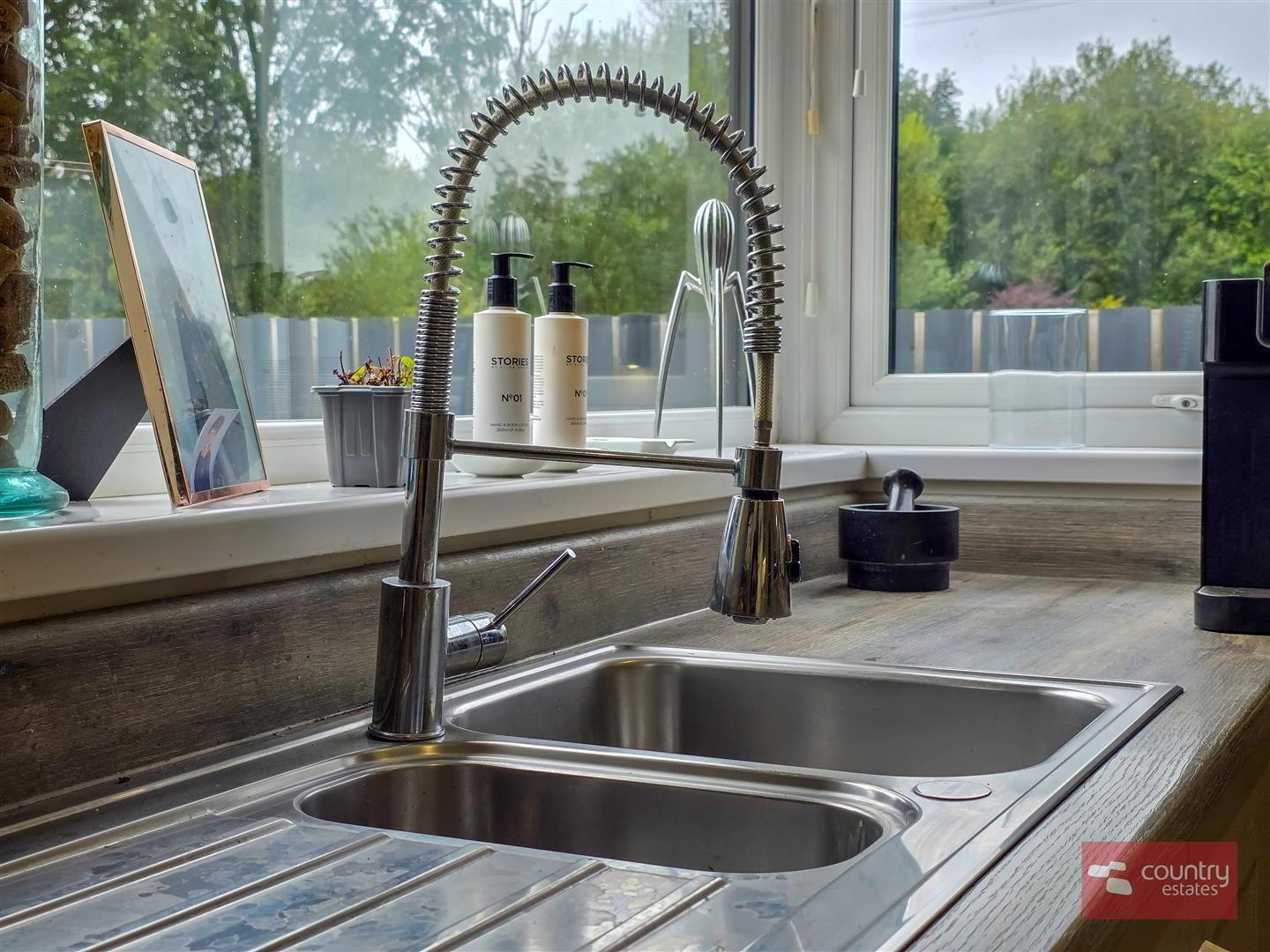 - Low level shaker units with single drainer stainless steel sink unit with mixer tap. PVC double glazed door to garden.