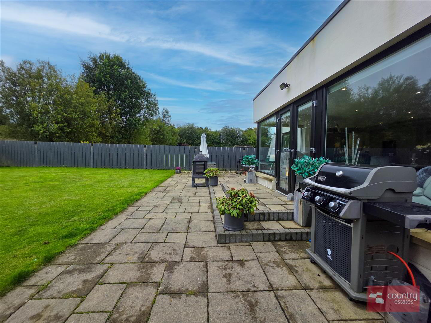 Extensive private patio / terrace area to rear with paved walkways perfect for family barbeques or evening entertaining with fixed outside lighting points.