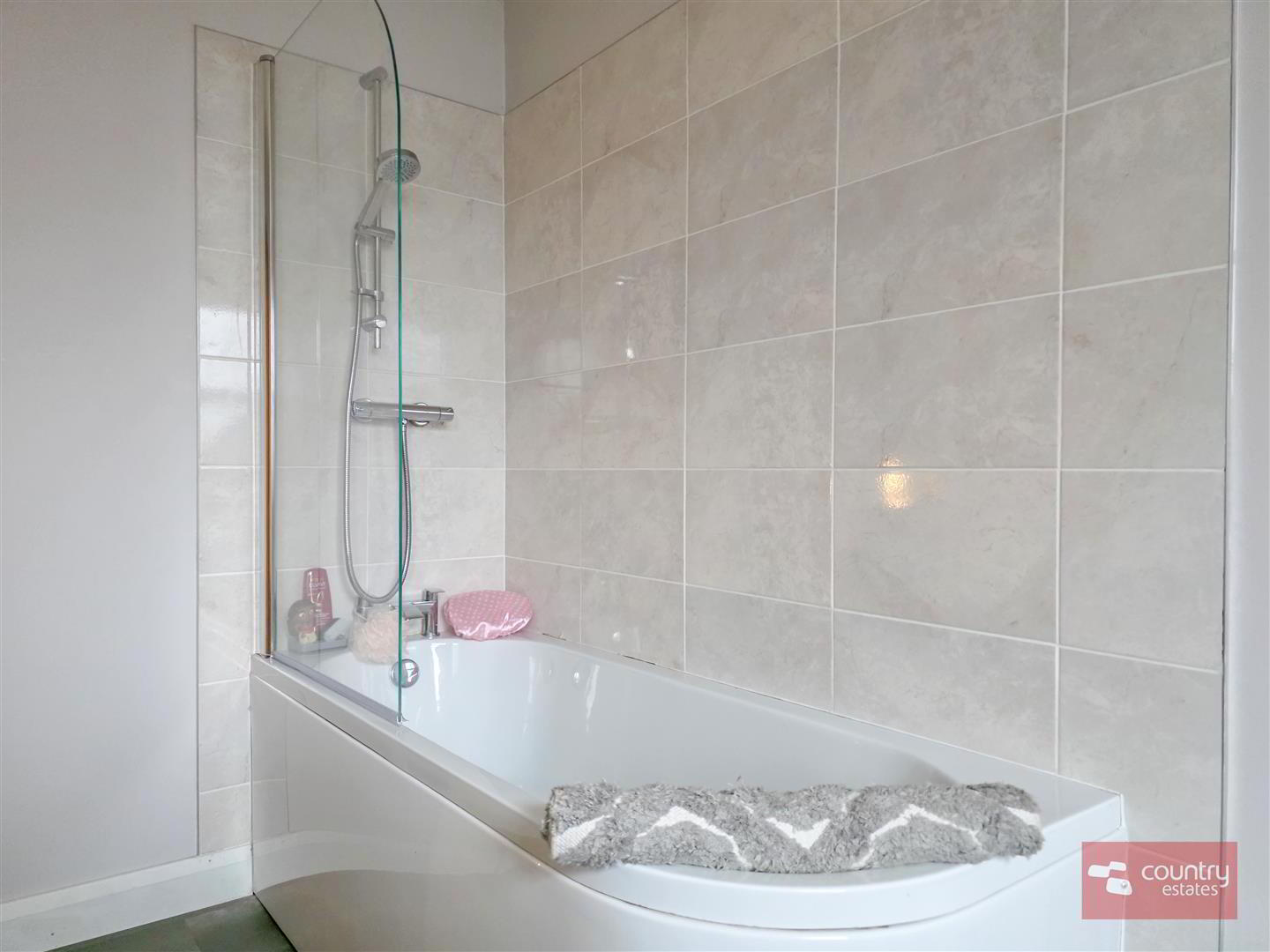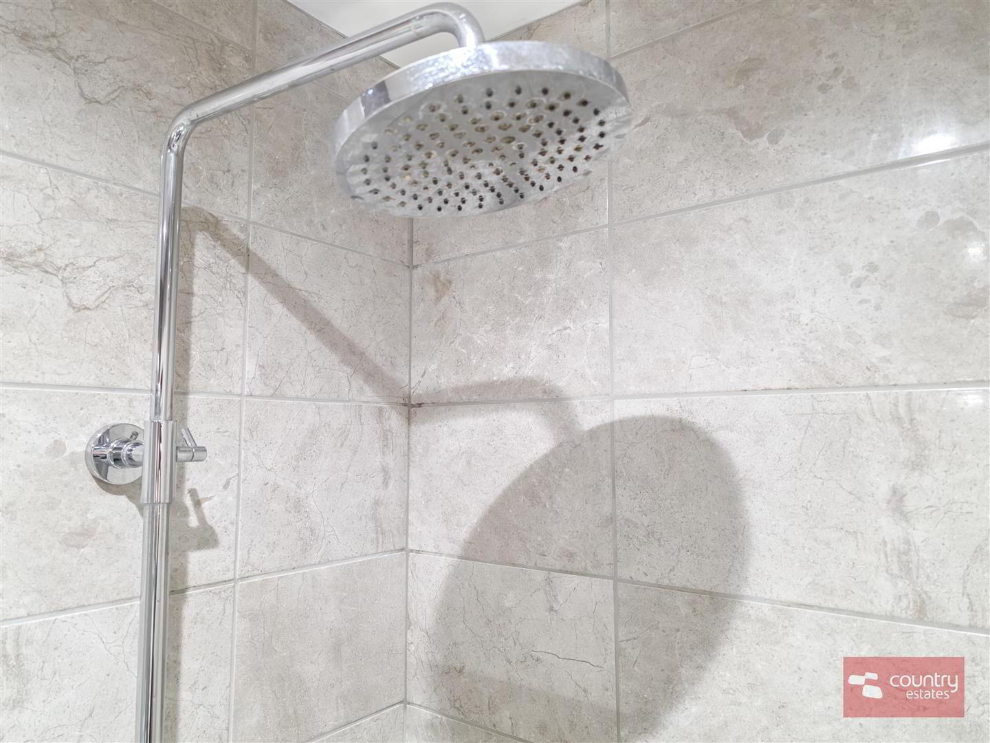 - Comprising fully tiled shower cubicle with thermostatically controlled drench style shower and hand shower attachment, semi pedestal wash hand basin with monobloc tap and tiled splashback and a button flush WC. Recessed downlighting.