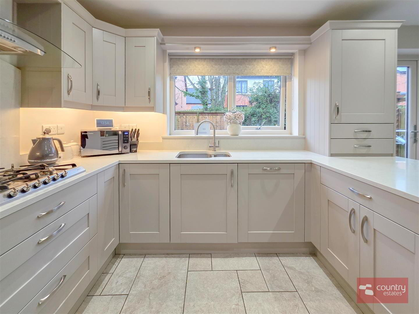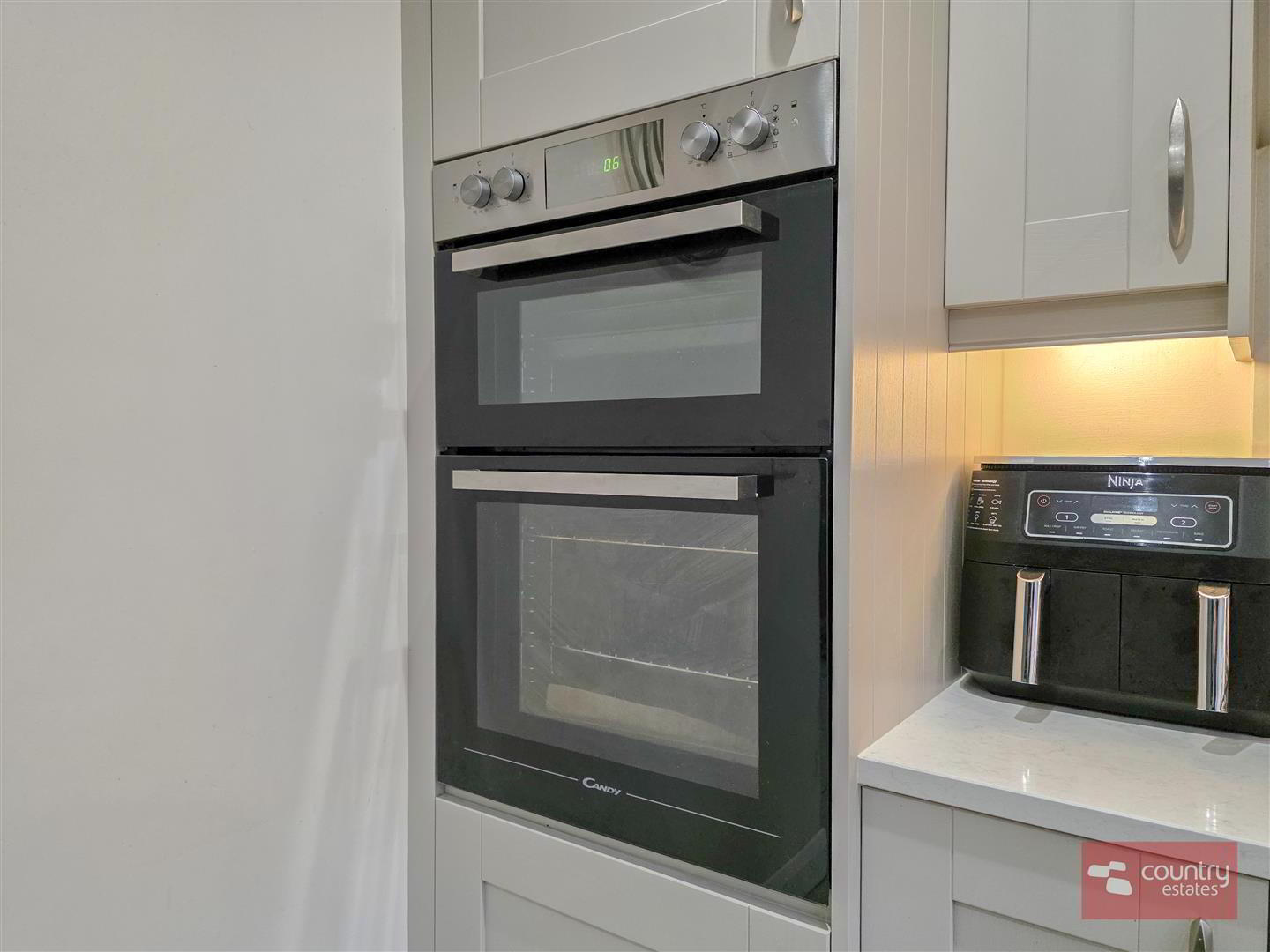 - Equipped with a comprehensive range of high and low level shaker style fitted units and contrasting granite work surfaces and upstands. One and a half bowl stainless steel undermount sink unit with swan neck mixer tap. Integrated eye level ovens, separate five ring gas hob with overhead extractor housed in stainless steel chimney with glass hood, and a dishwasher. Breakfast bar style return. Recessed downlighting. Ample space for dining. PVC double glazed French doors to rear garden. Tiled floor.