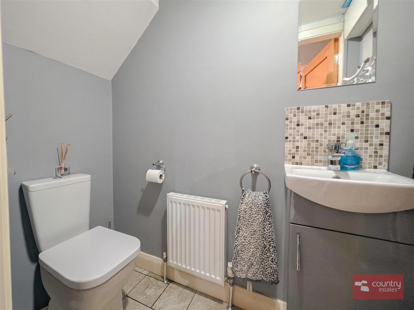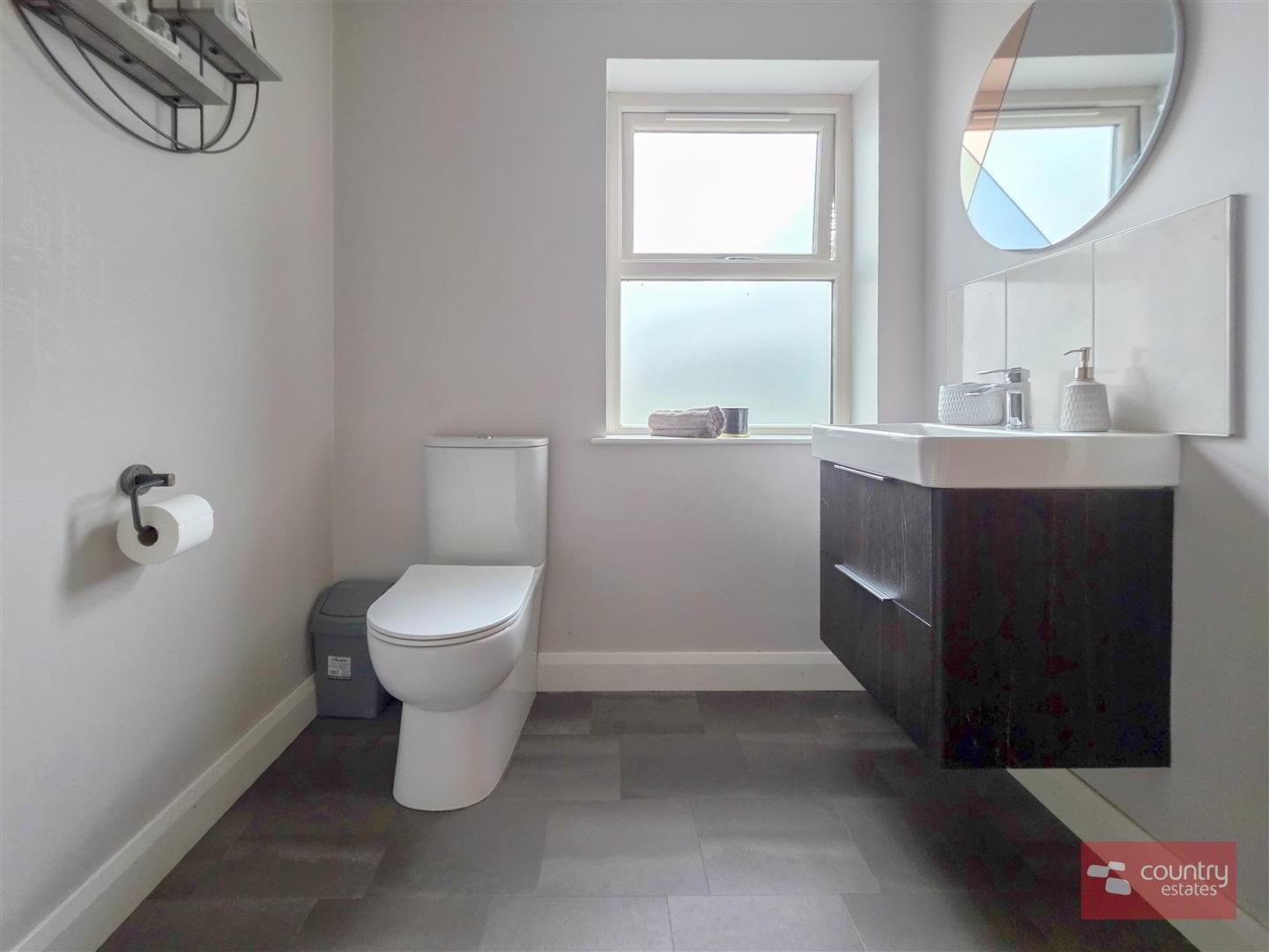 - Comprising vanity wash hand basin with monobloc tap and a button flush WC. Tiled floor.