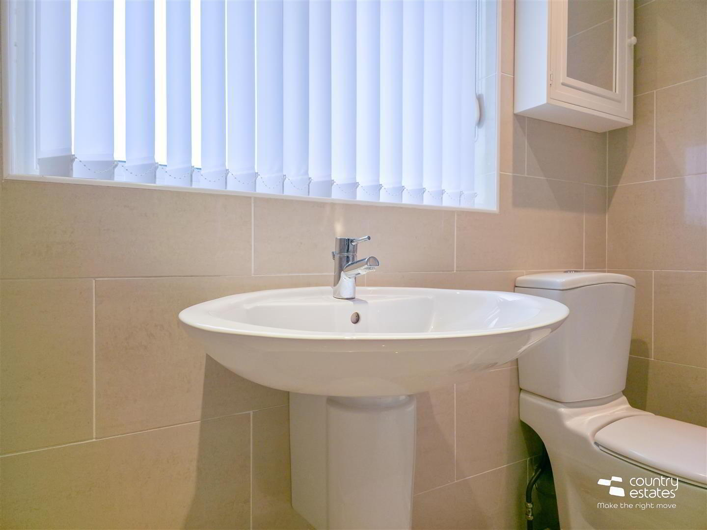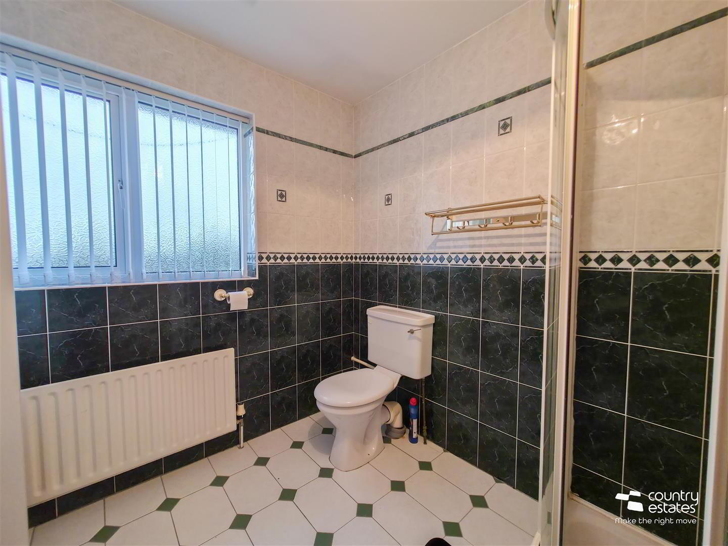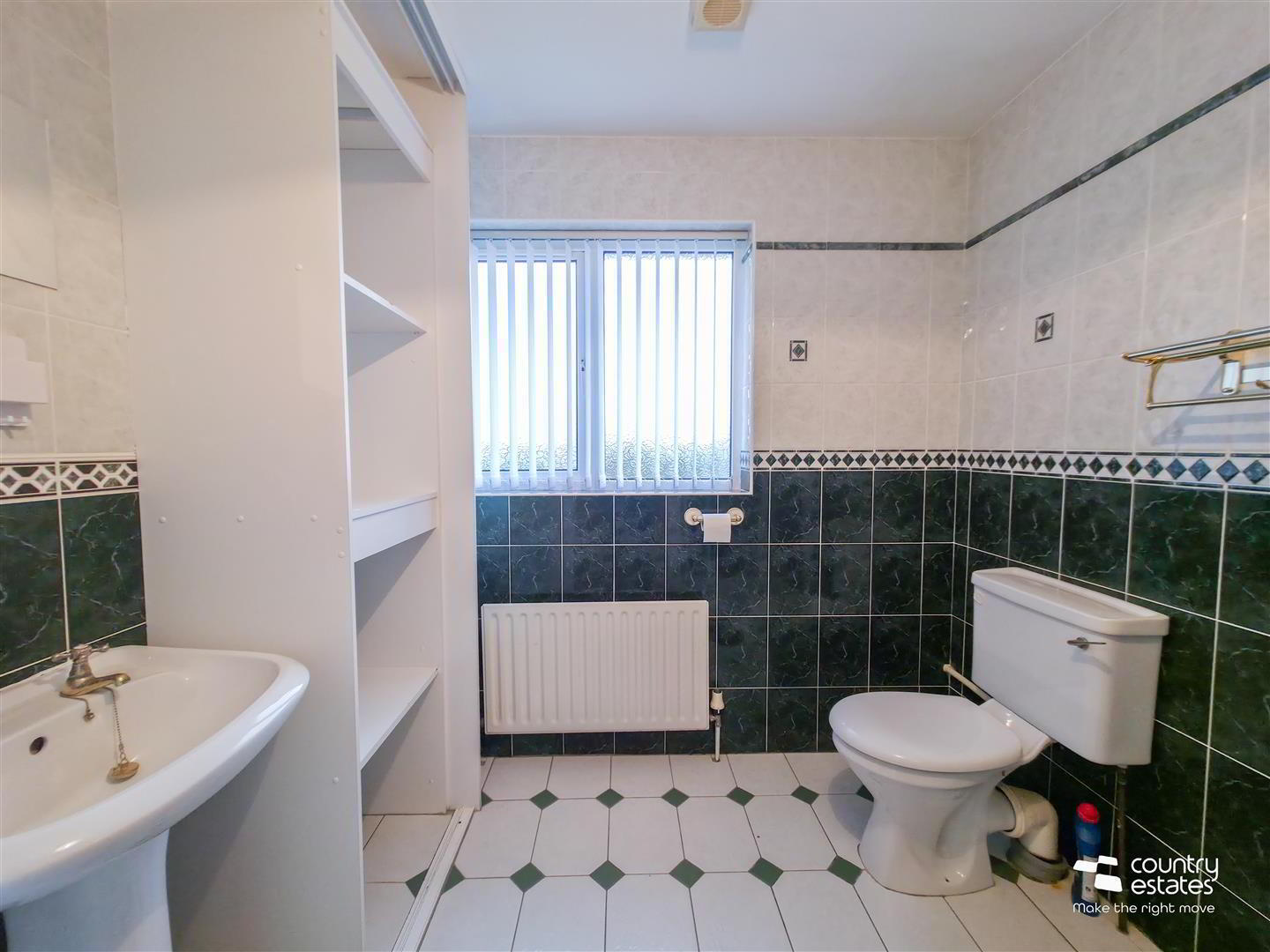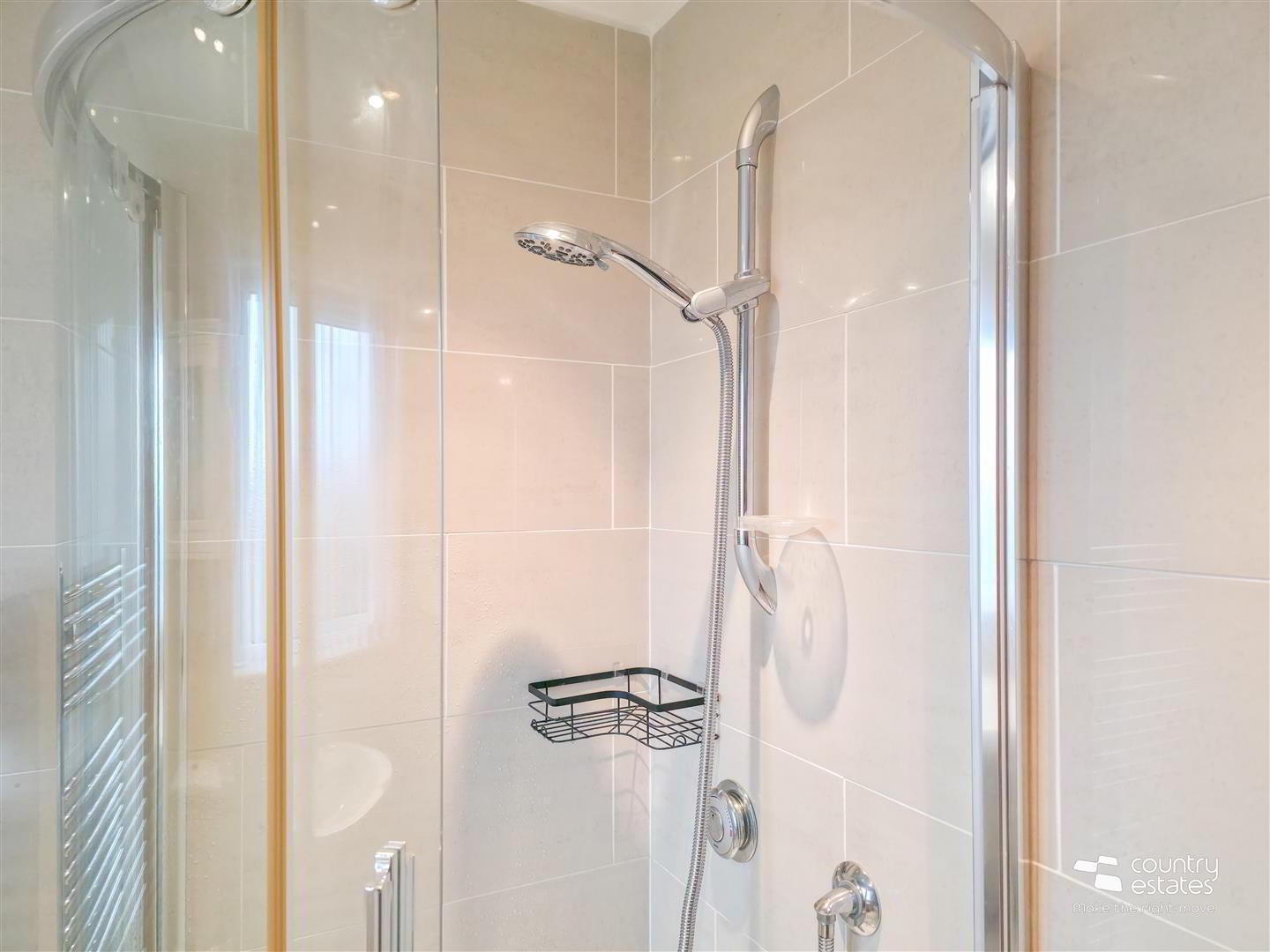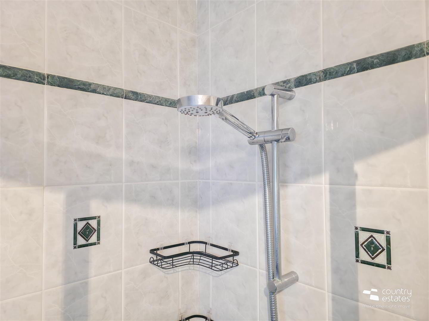 - Comprising fully tiled quadrant shower cubicle with electric shower unit, pedestal wash hand basin and a low flush WC. Fitted open shelved storage units.