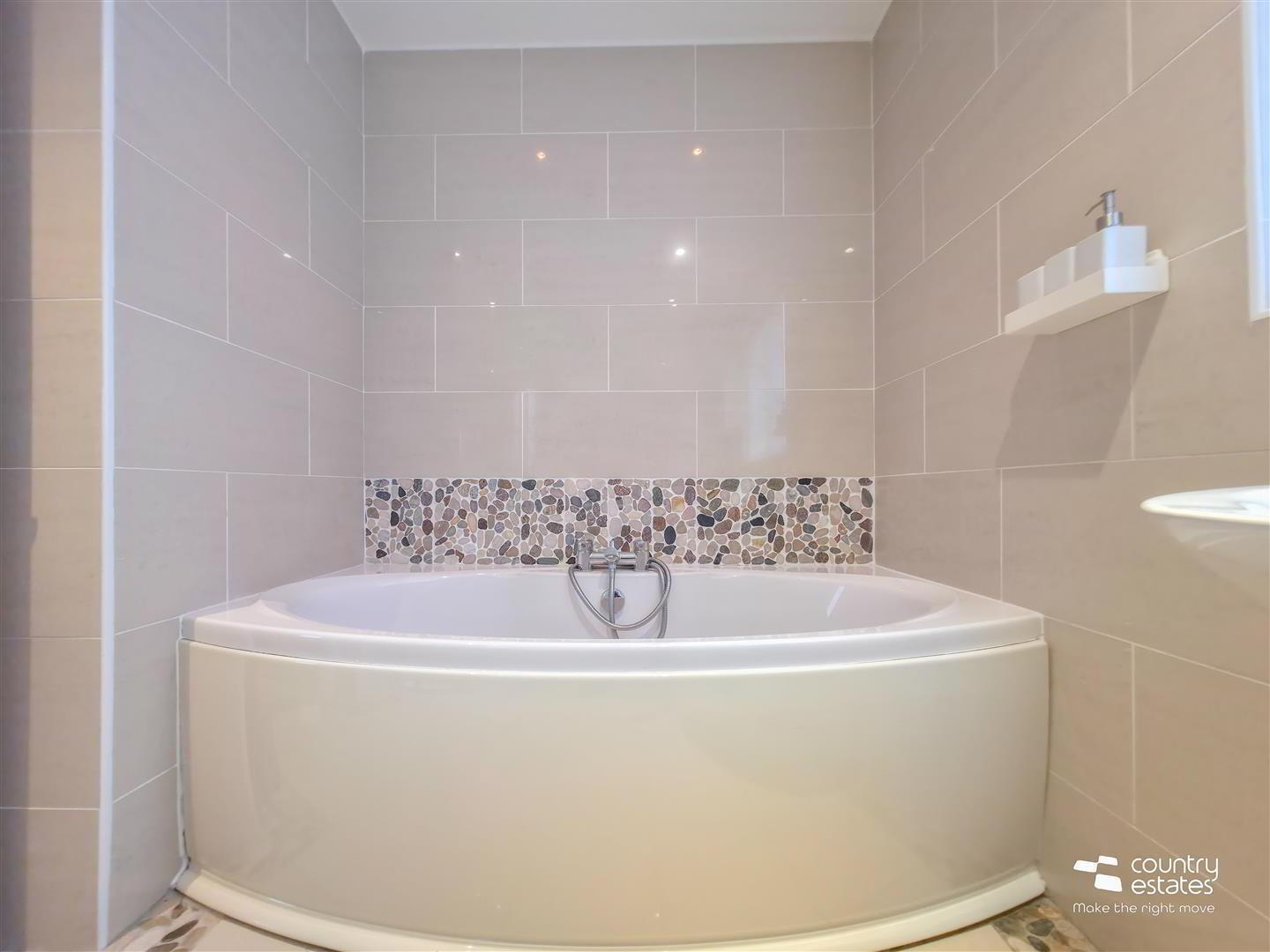 - Comprising double ended panel bath with hand shower attachment, quadrant shower cubicle, semi pedestal wash hand basin, and a button flush WC. Chrome towel radiator. Recessed down lighting. Tiled walls. tiled floor.
