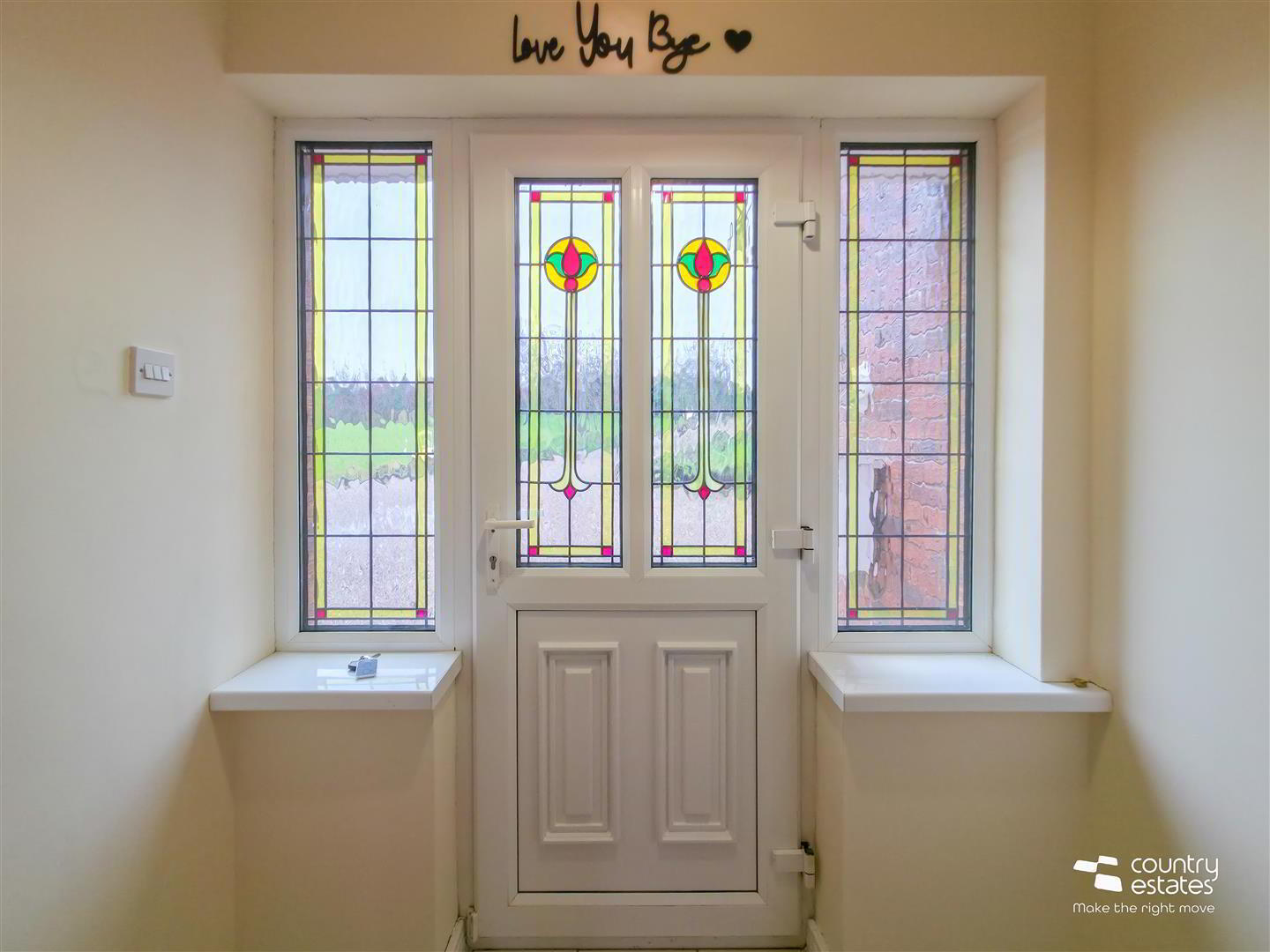 - PVC double glazed front door with stained glass insets and matching side screens into entrance porch with tiled floor. Hard wood door and side screens into: