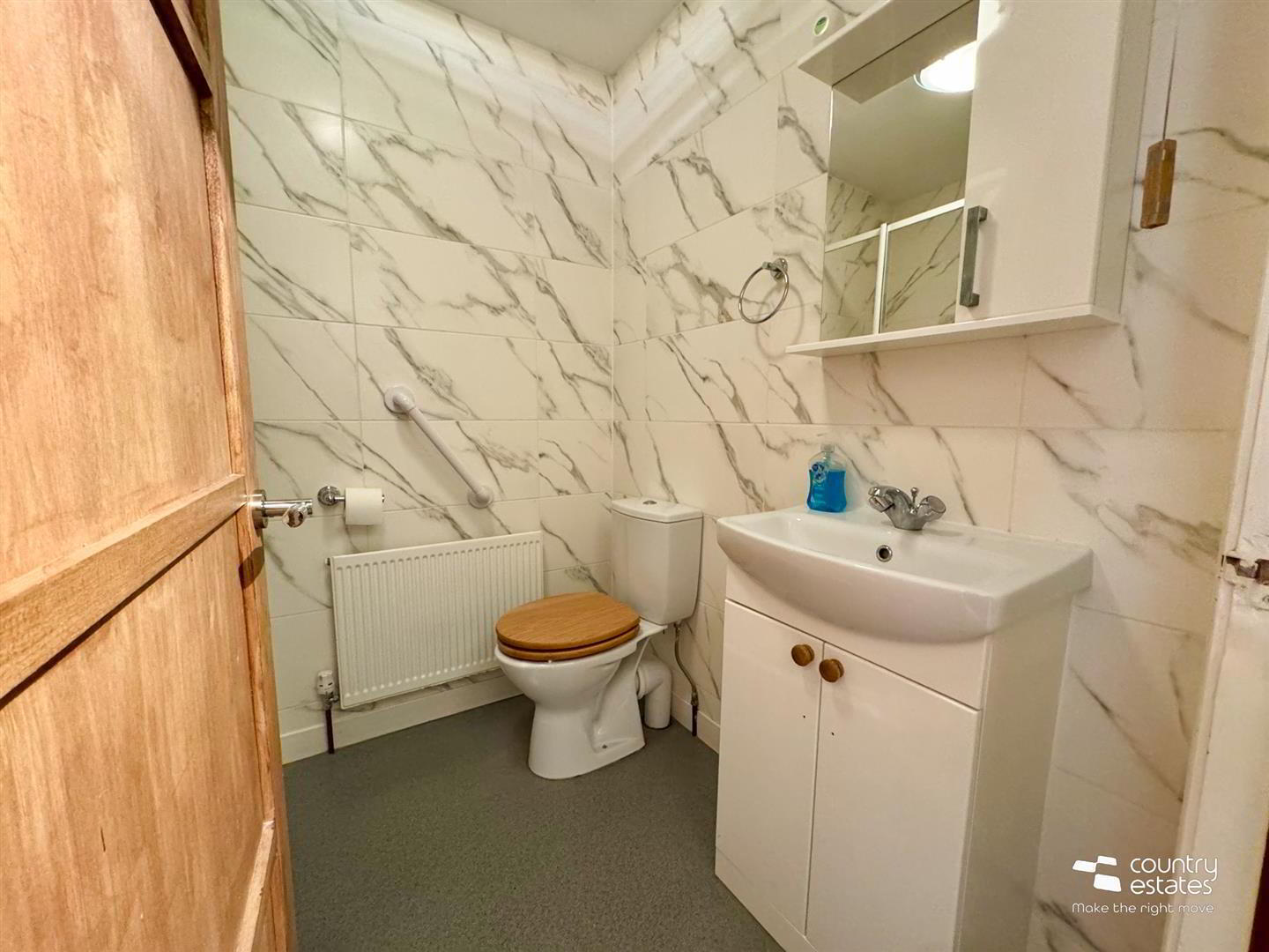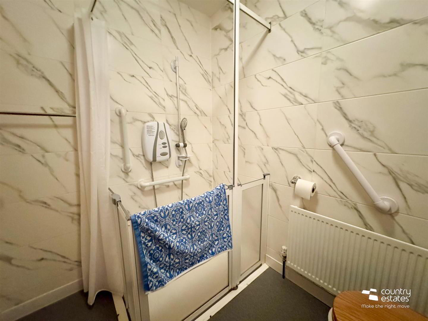 Comprising button flush w.c, modern vanity unit and open wet room style shower with fixed half screen with mid height electric shower unit. Fully tiled walls.