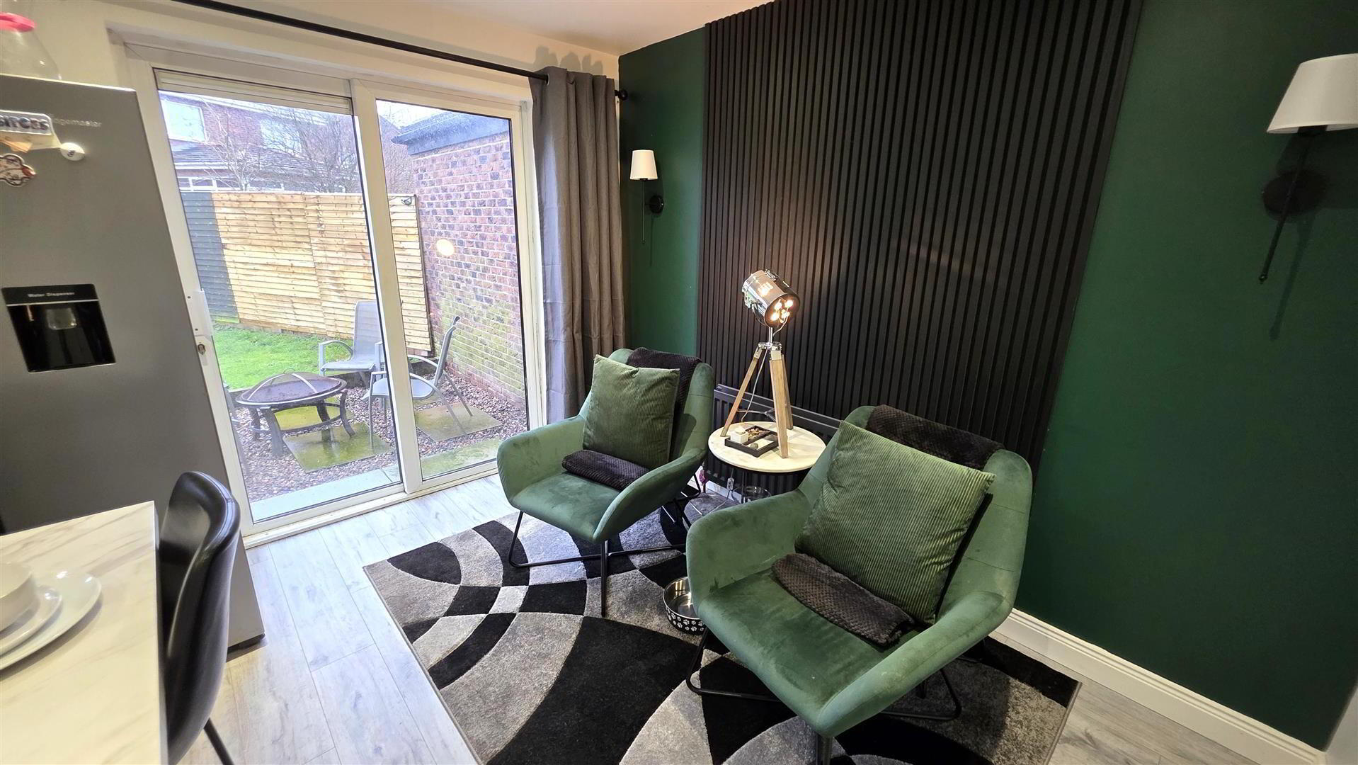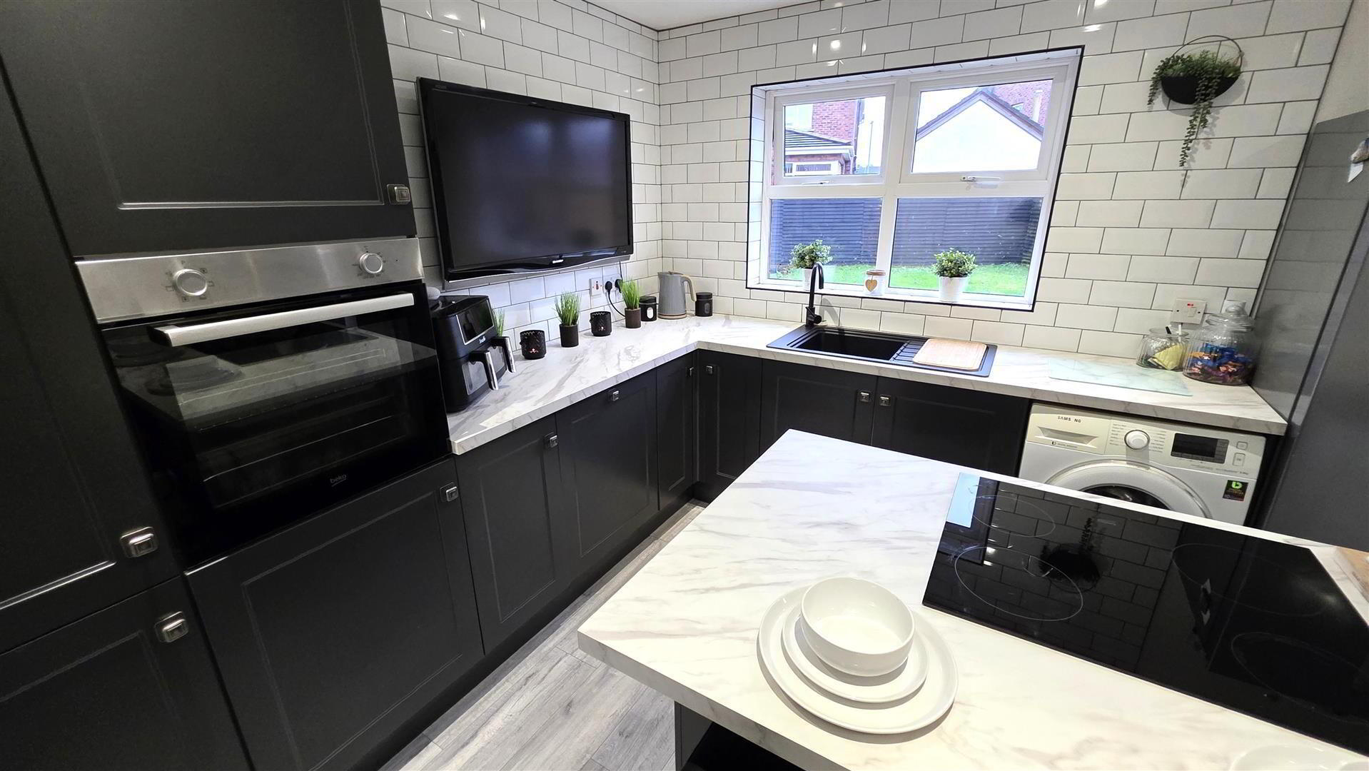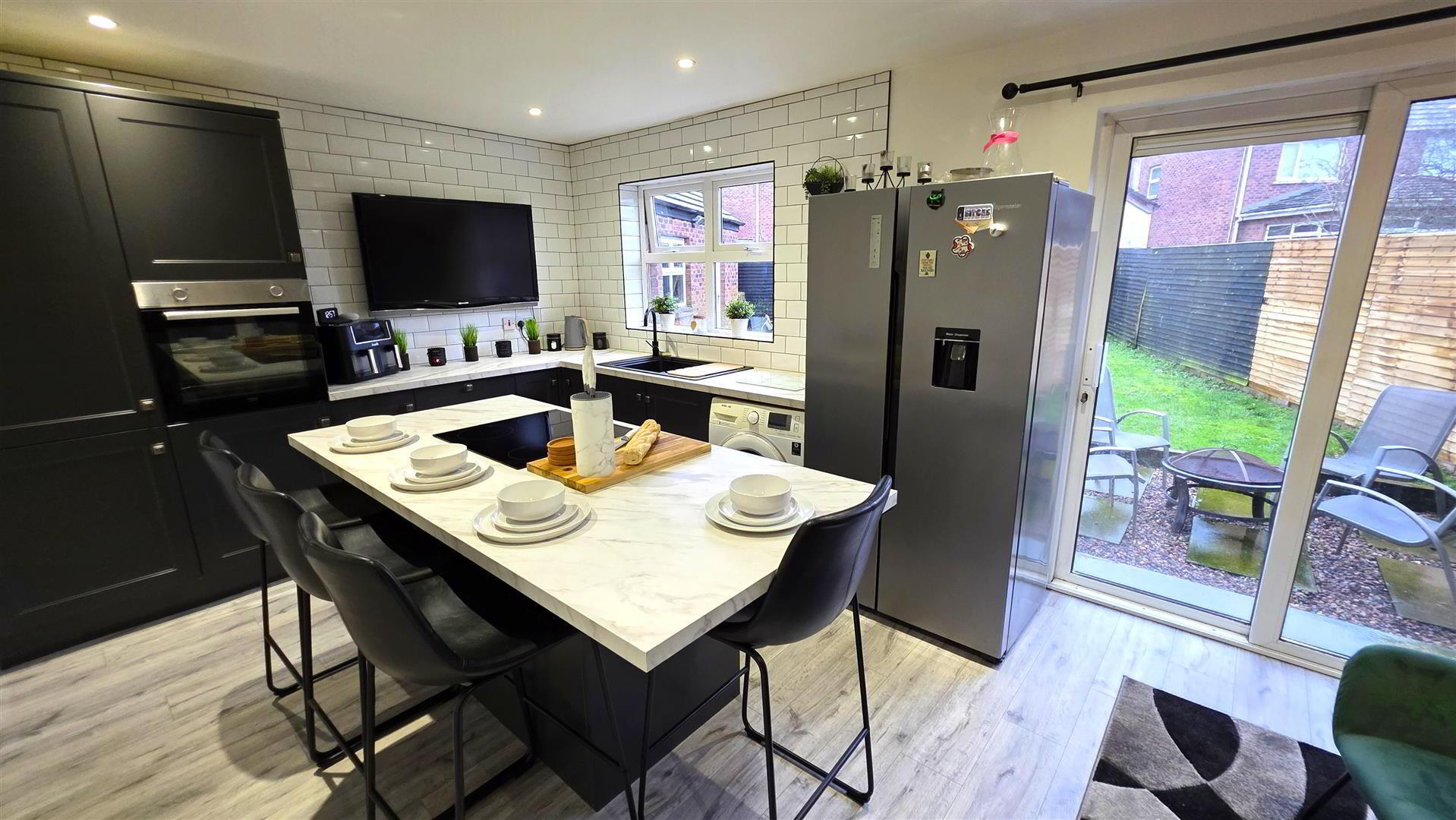 - Full range of dark blue double 'Shaker' style low level kitchen units with contrasting work surfaces and bevelled white subway style splashback tiling. Black sink unit with black mixer tap. Large matching kitchen island with additional storage in addition to breakfast bar style seating. Integrated appliances to include a four ring halogen hob, mid level combination oven and grill and dishwasher. Space for 'American' style fridge freezer and washing machine. Low voltage down lighting. Twin wall lights and acoustic wall panelling. Double radiator. PVC double glazed sliding patio door to rear.
