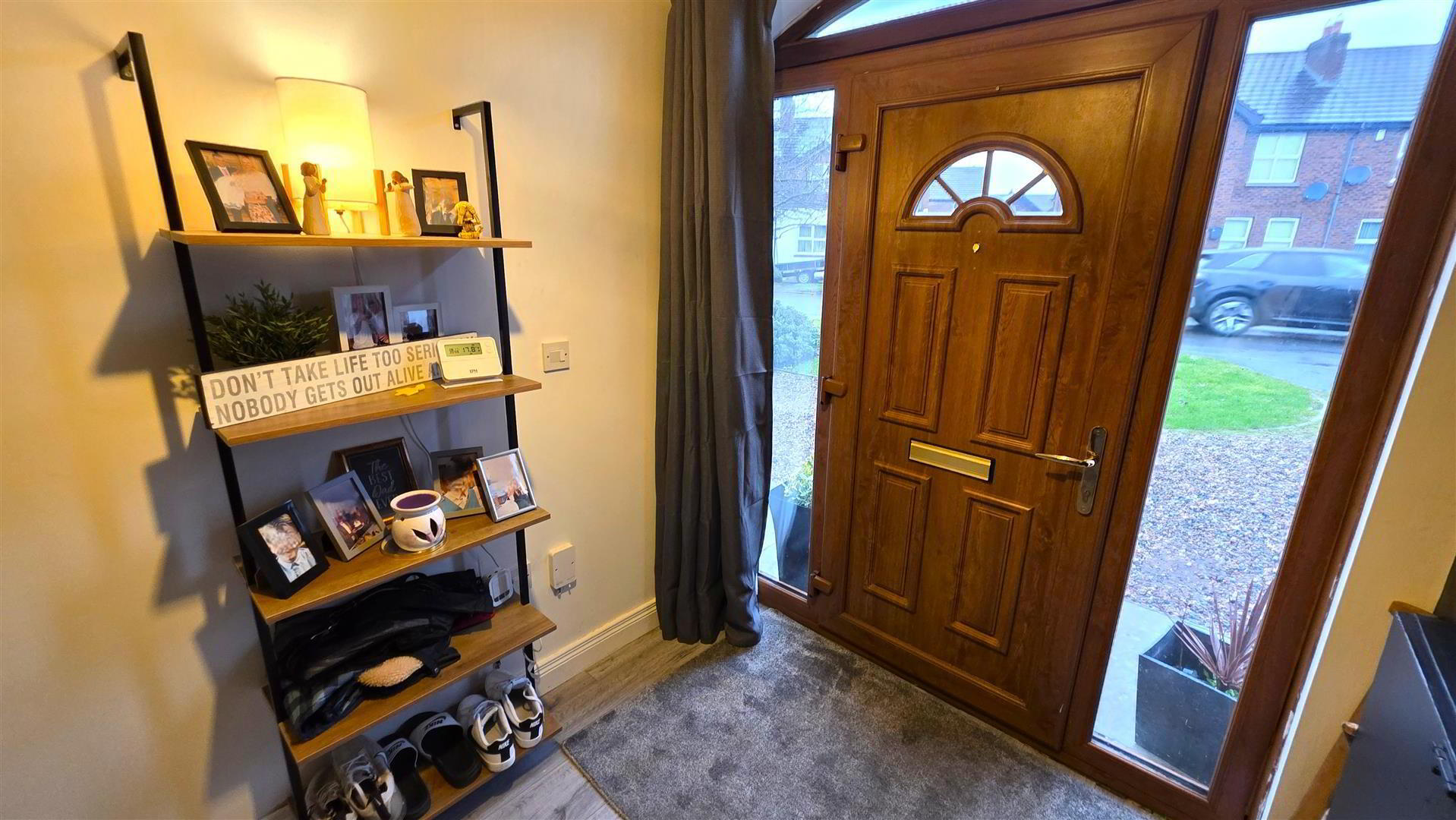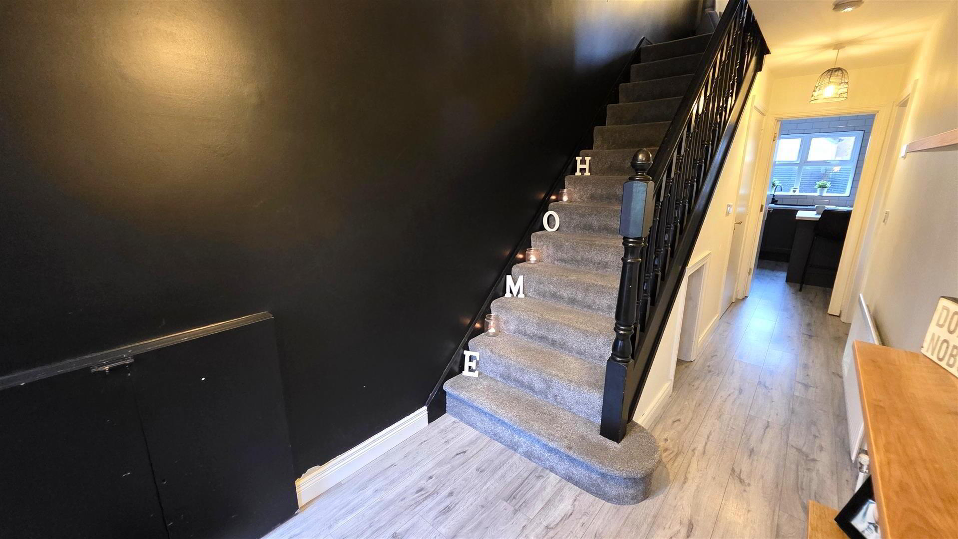 - PVC door with sidelights to a large welcoming entrance hall with staircase to first floor, moulded handrail and turned balustrading. Wood laminate flooring. Understairs storage covered. Single radiator.