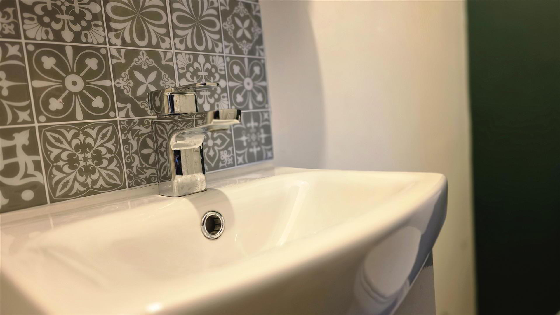 - Modern white suite comprising a panel bath with feature chrome mixer tap and tiled splashback. Pedestal wash hand basin with 'Monobloc' chrome mixer tap and tiled splashback. Low flush push button WC. Extractor fan. Single radiator.
