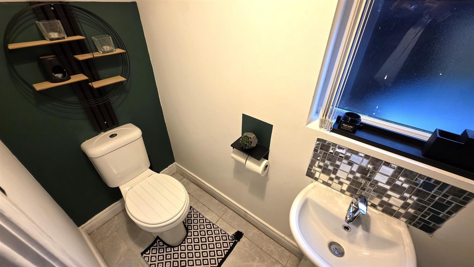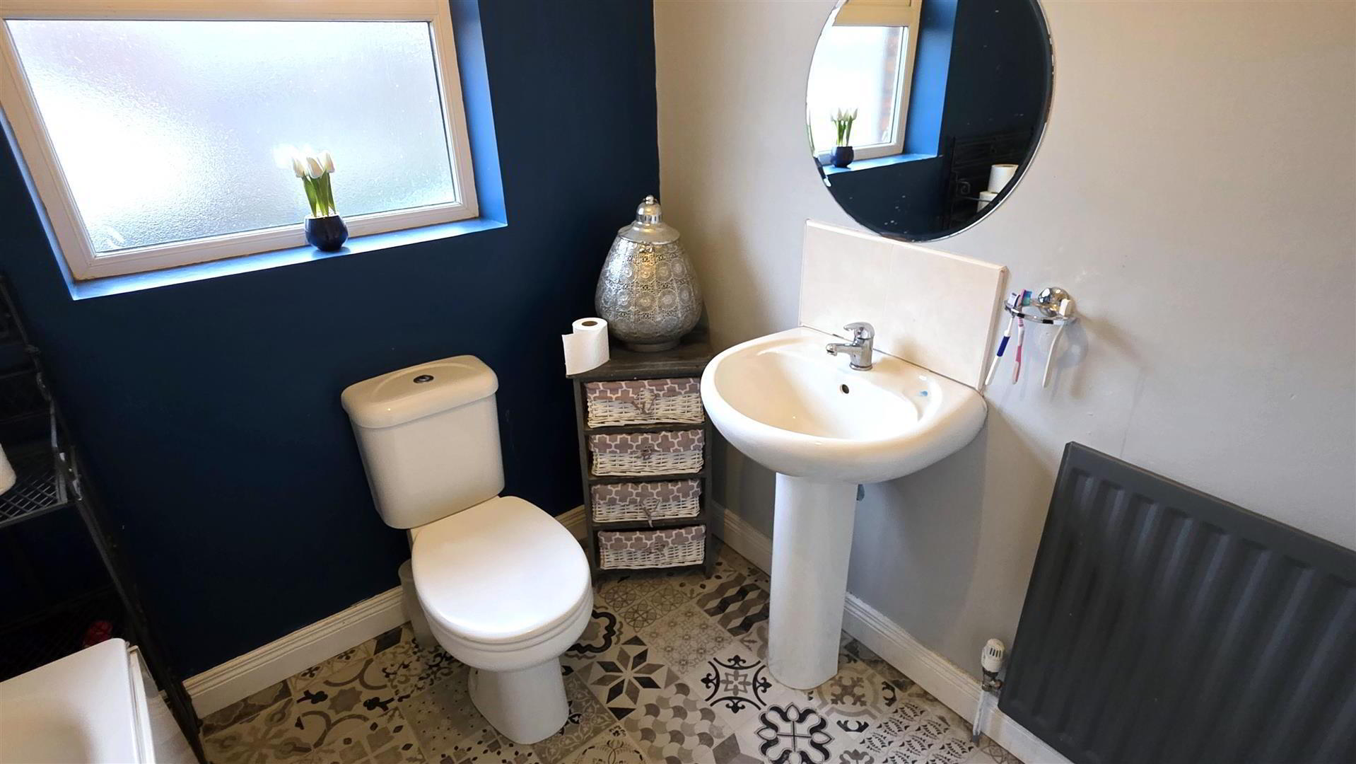 - Modern white suite comprising a pedestal wash hand basin with chrome 'Monobloc' mixer tap. Low flush push button WC. Fully tiled flooring. Extractor fan. Single radiator.
