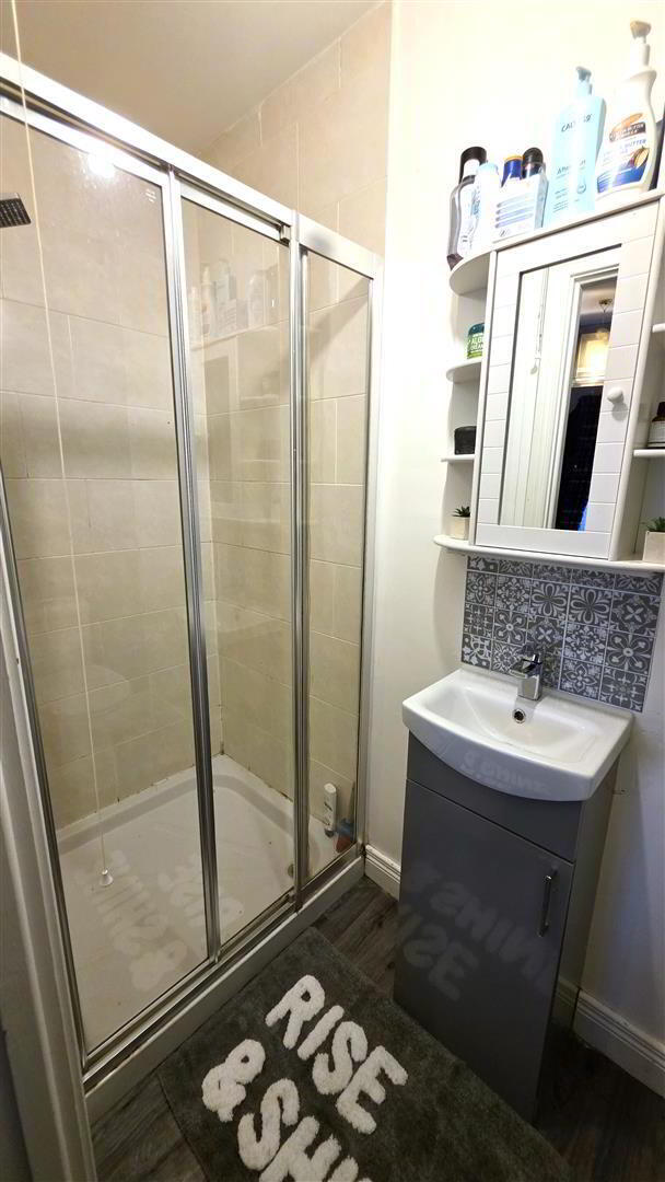 - Modern white suite comprising a wall to wall enclosed shower with fully tiled splashback, 'Mira sport' electric shower and partially glazed folding door. 'Vanity' slimline wash hand basin with 'Monobloc' chrome mixer tap and storage below. Low flush push button WC. Extractor fan. Single radiator.