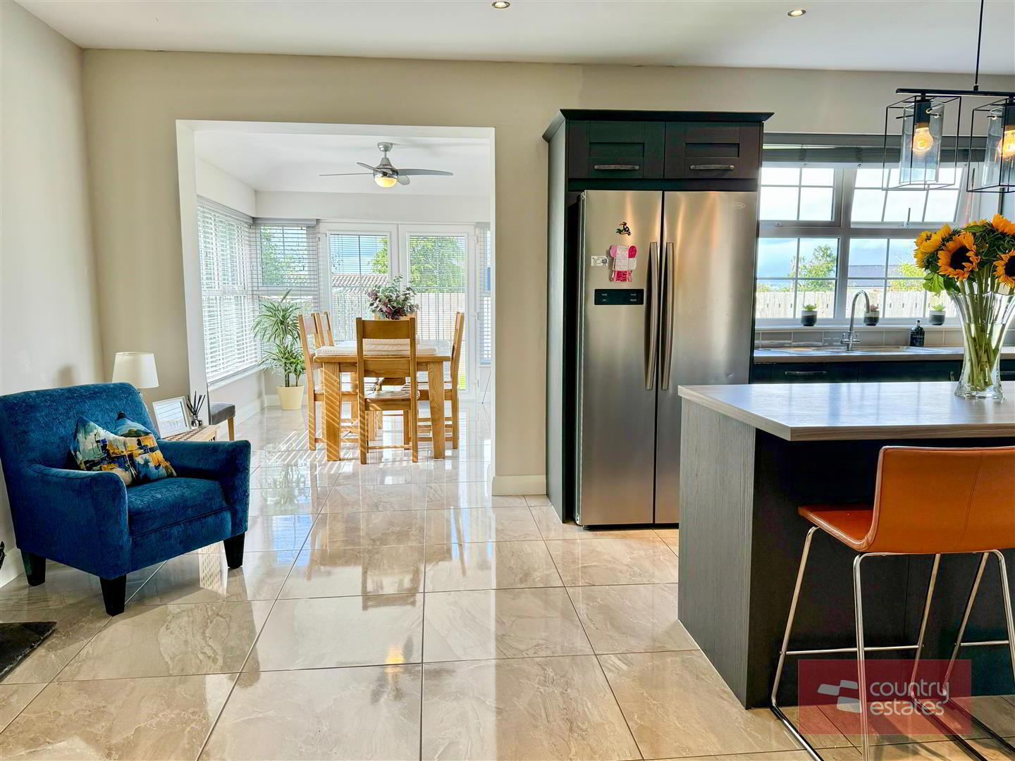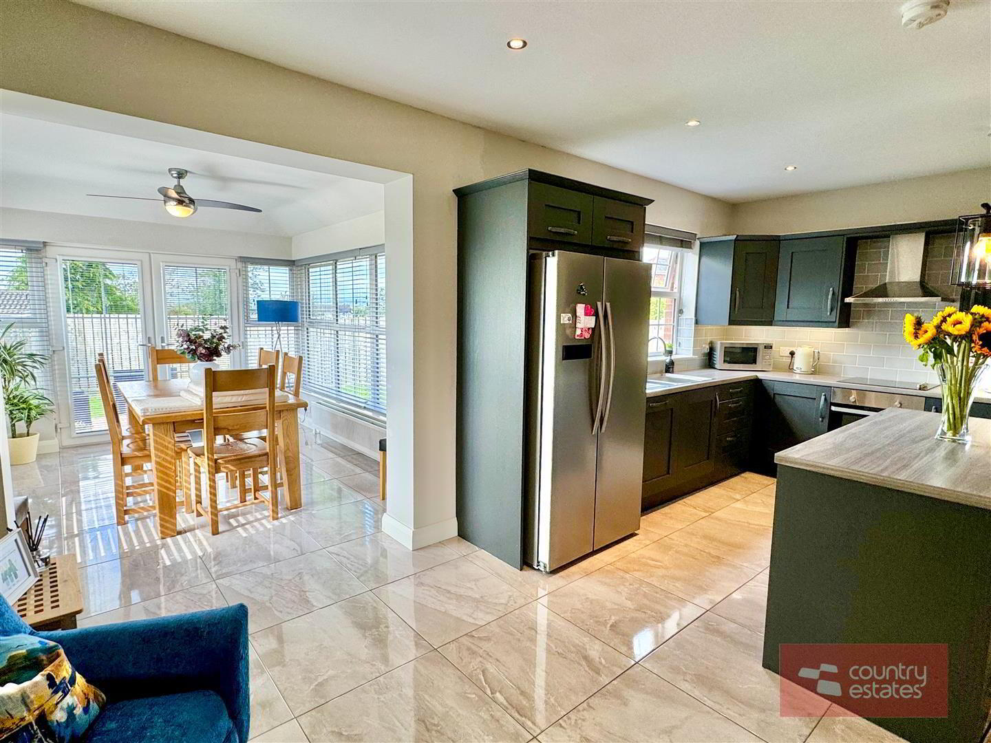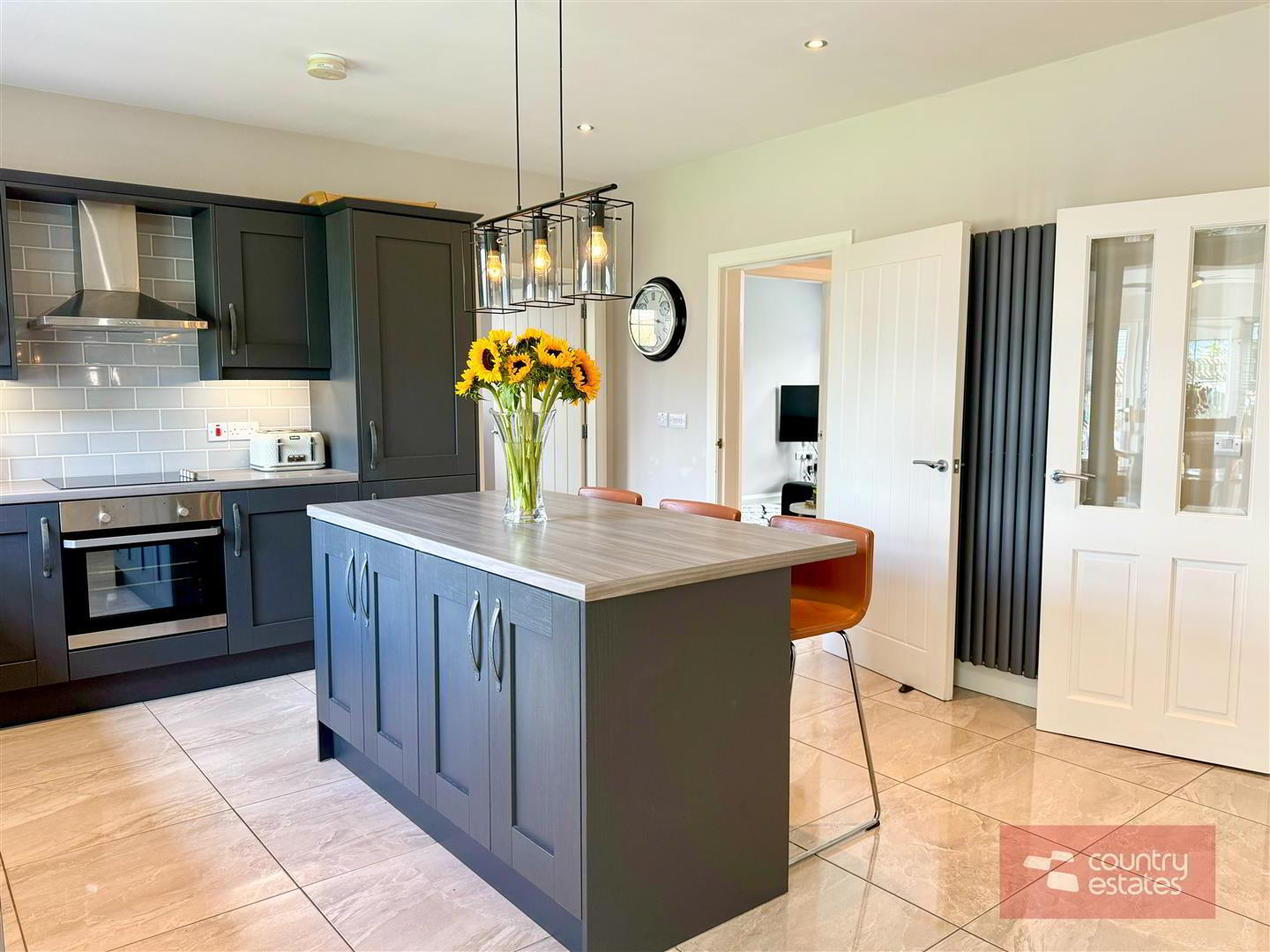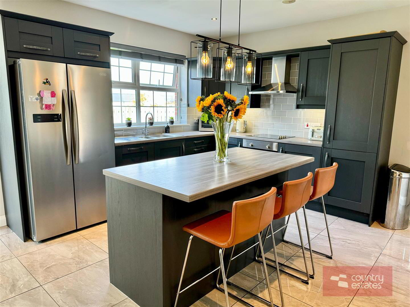 - Luxury shaker fitted kitchen in matt grey finish equipped with a comprehensive range of high and low level fitted units with contrasting wood grain effect melamine work surfaces. Matching centre island with breakfast bar style return. Inlaid Stainless steel 1.5 bowl sink unit with swan neck mixer tap. Integrated oven with 4 ring ceramic hob with extractor housed in stainless steel canopy. Integrated dishwasher. Space for free standing American style fridge freezer. Part tiled walls in metro style brick tile. Tiled floor extending into sun room. Inset Cast iron wood burning stove on slate hearth in living / dining area. Open arch leading into: