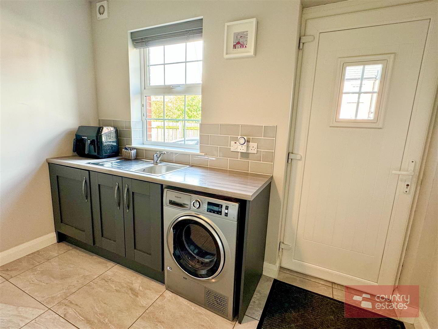 - Modern range of fitted low level shaker style matching units. Integrated washing machine. Space for tumble dryer. Splash back tiling to walls in metro style brick. Tiled floor. PVC double glazed back door.