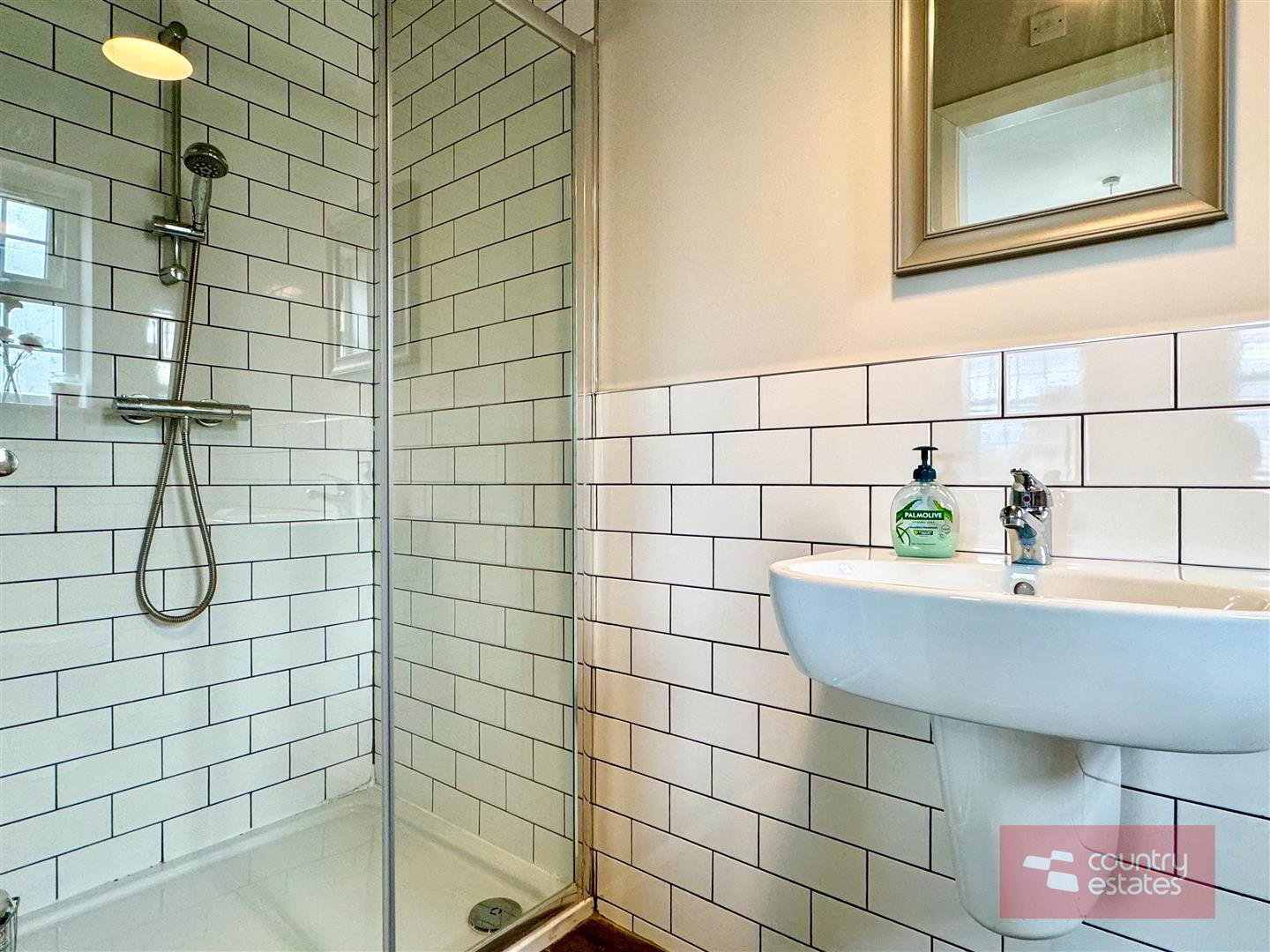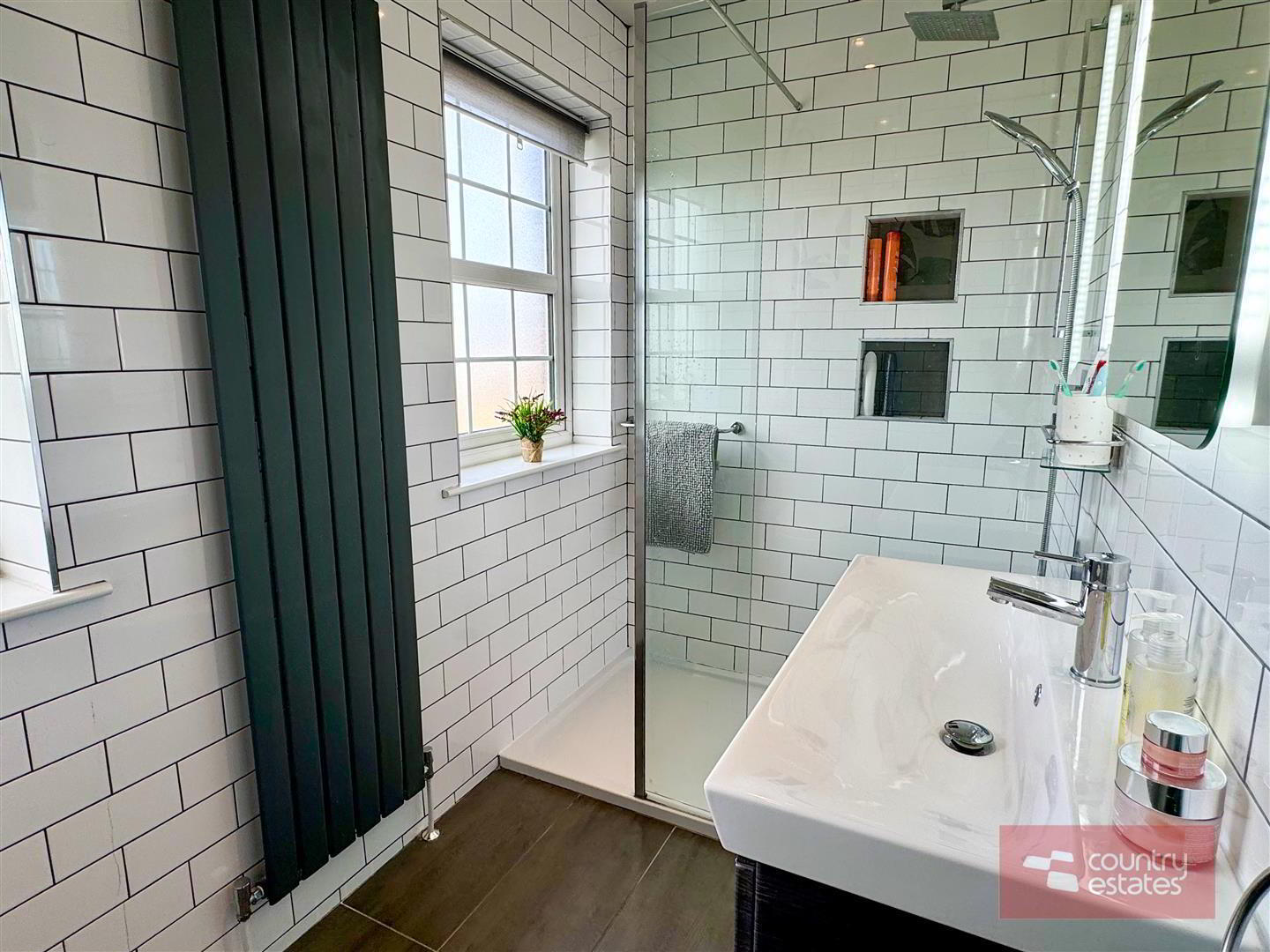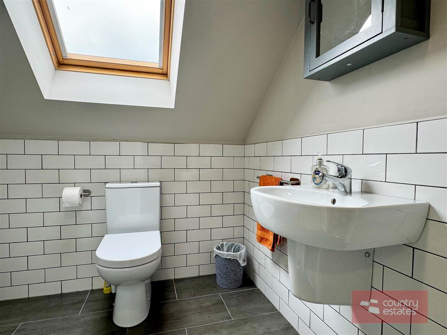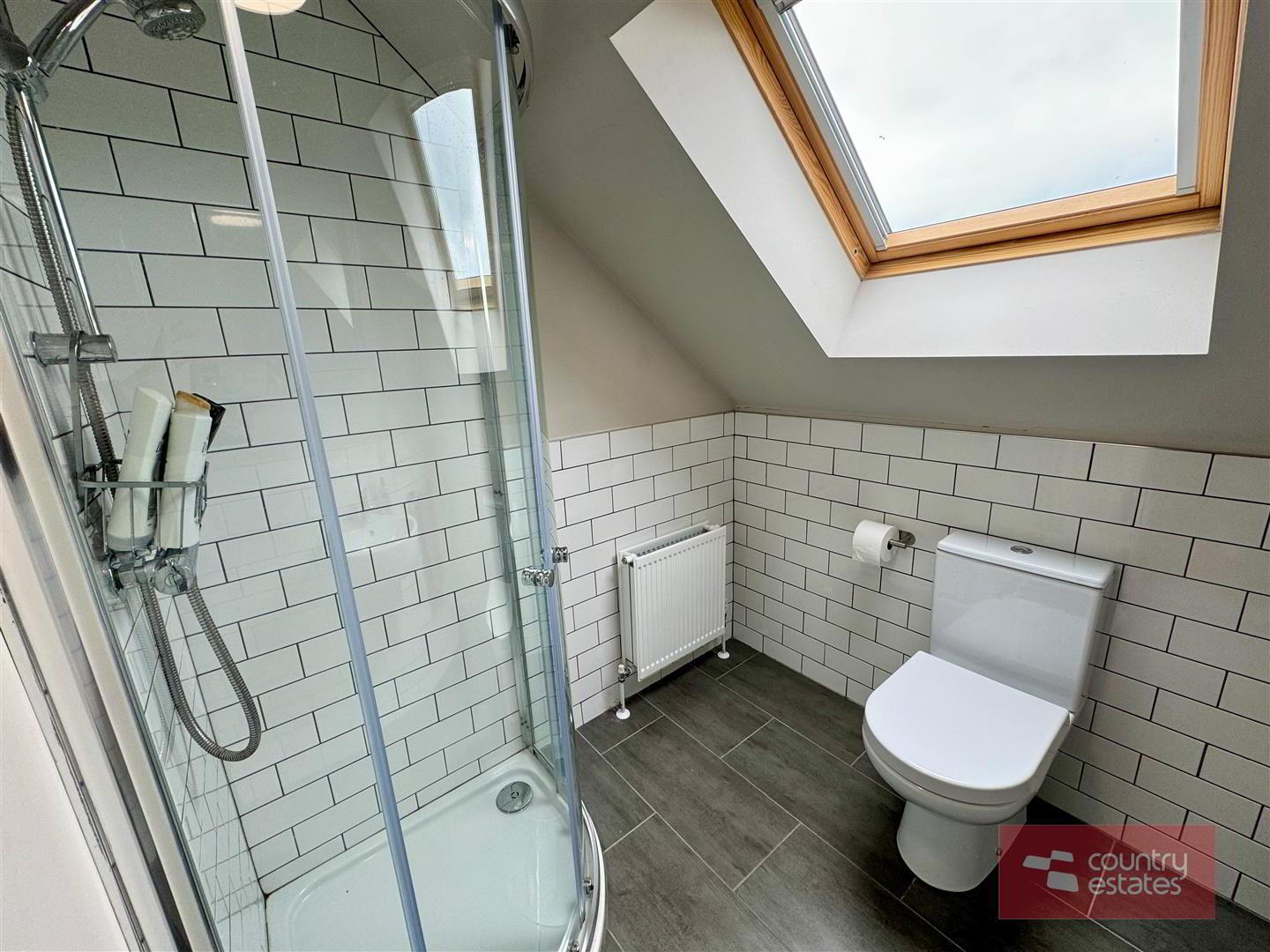 - Contemporary white three piece suite comprising fully tiled quarter rounded shower enclosure, semi pedestal wash hand basin and WC. Thermostatically controlled shower (pressurised system). Half tiling to walls in metro brick tile. Tiled floor. Keylite skylight.