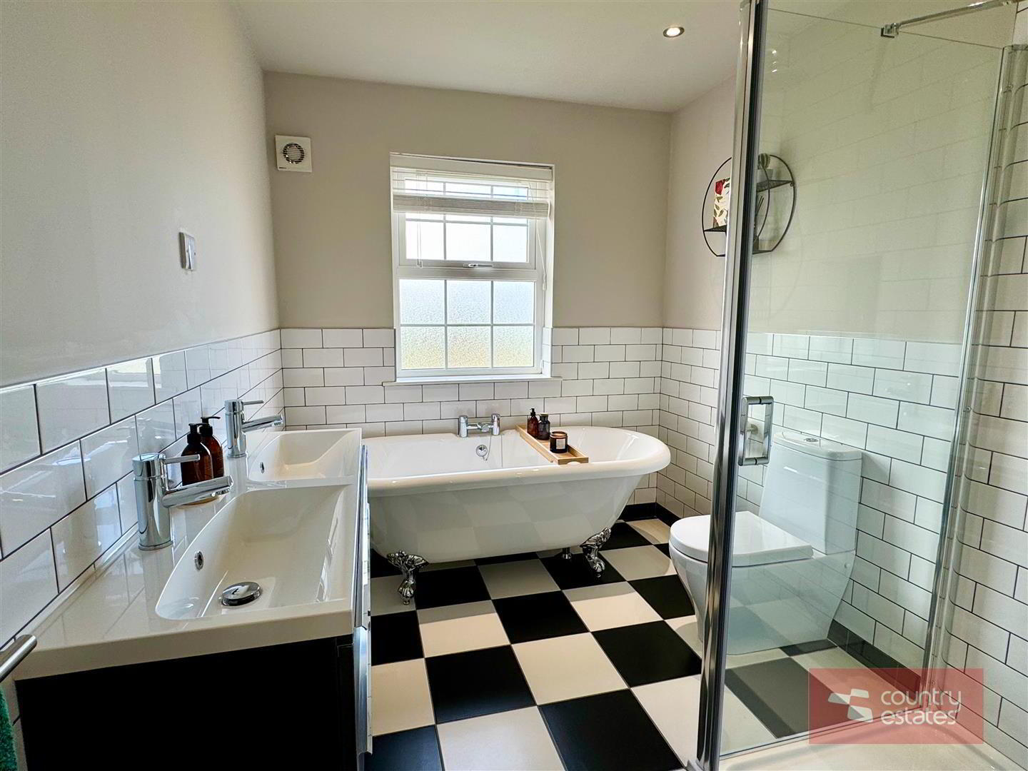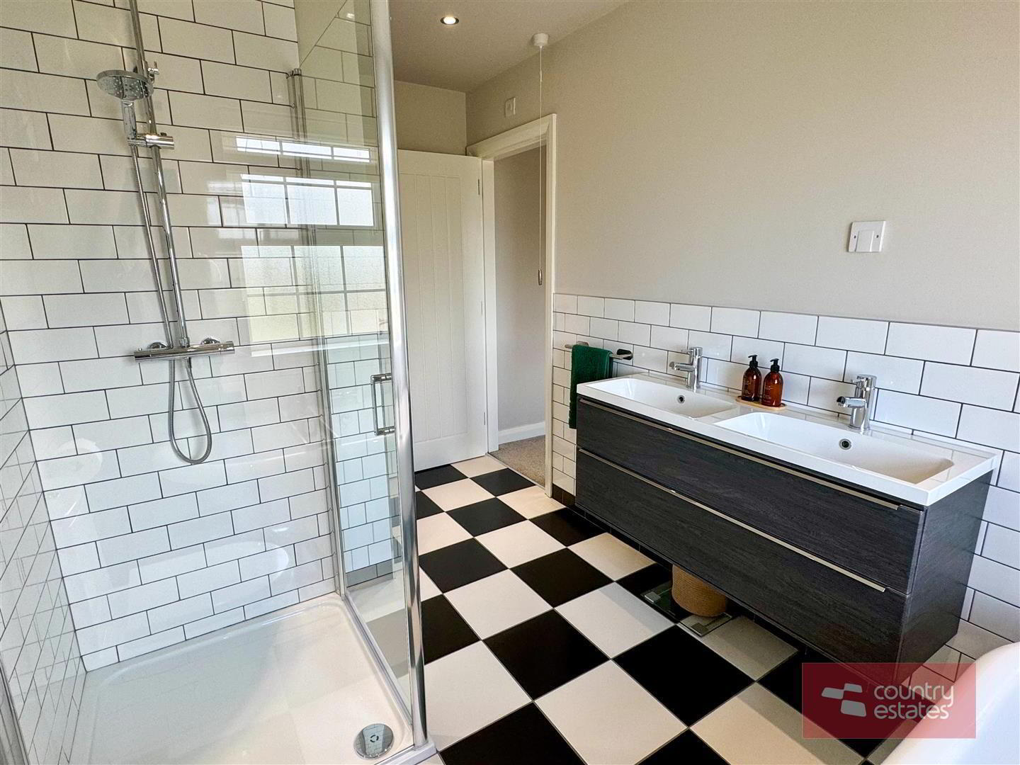 - White four piece suite comprising freestanding roll top ball and claw bath, separate fully tiled shower enclosure with drench style shower, floating vanity unit with twin 'his and hers' sinks and WC. Thermostat controlled mains shower unit (pressurised system). Checker board tiled floor. Half tiling to walls. Access to hot press.