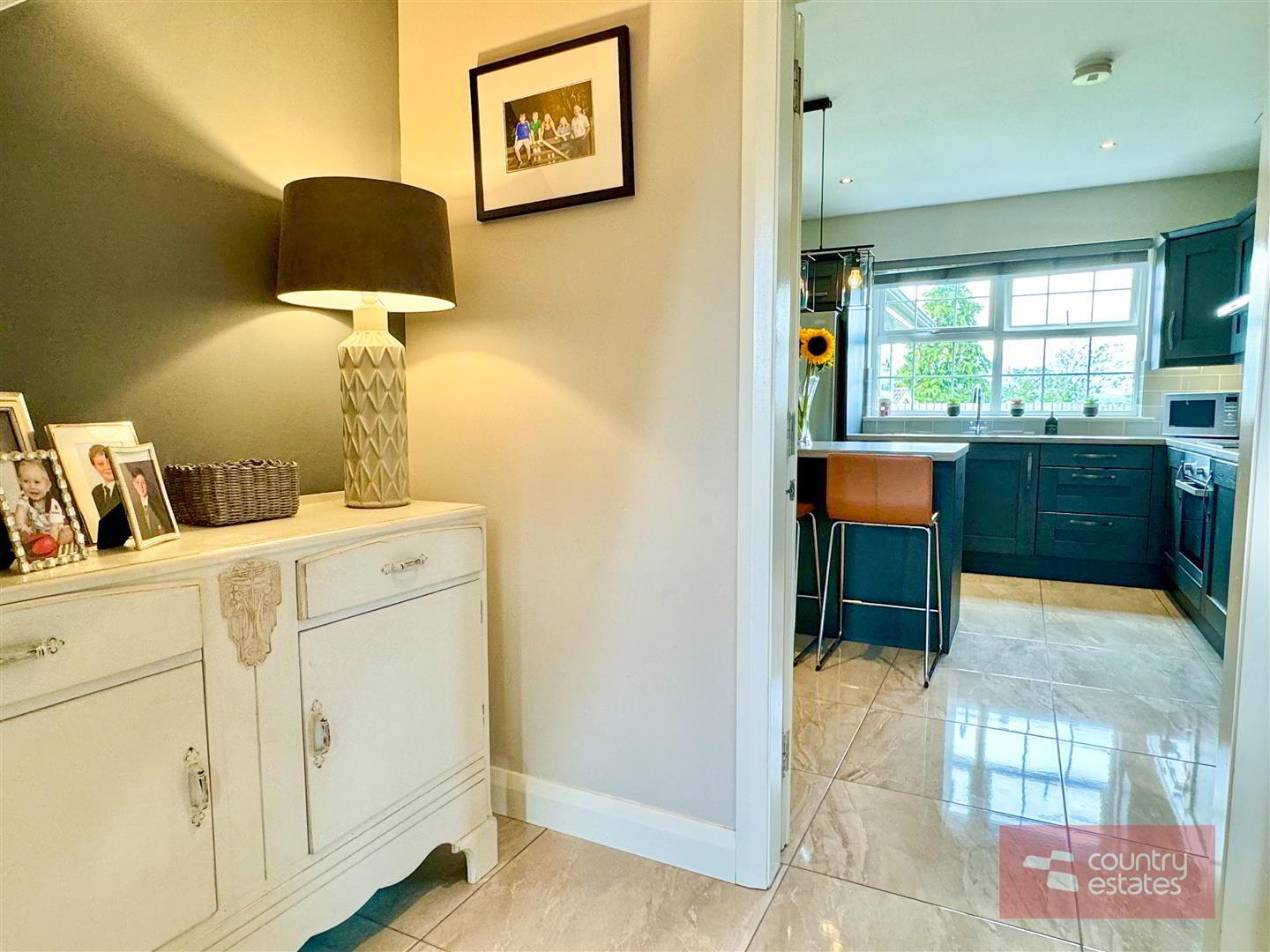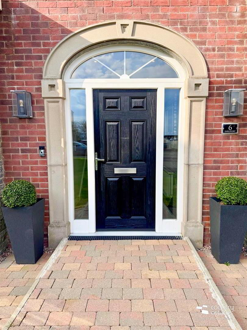 - Composite panelled front door with hardwood double glazed sidelights and fan light over. Tiled floor. Feature height ceilings.