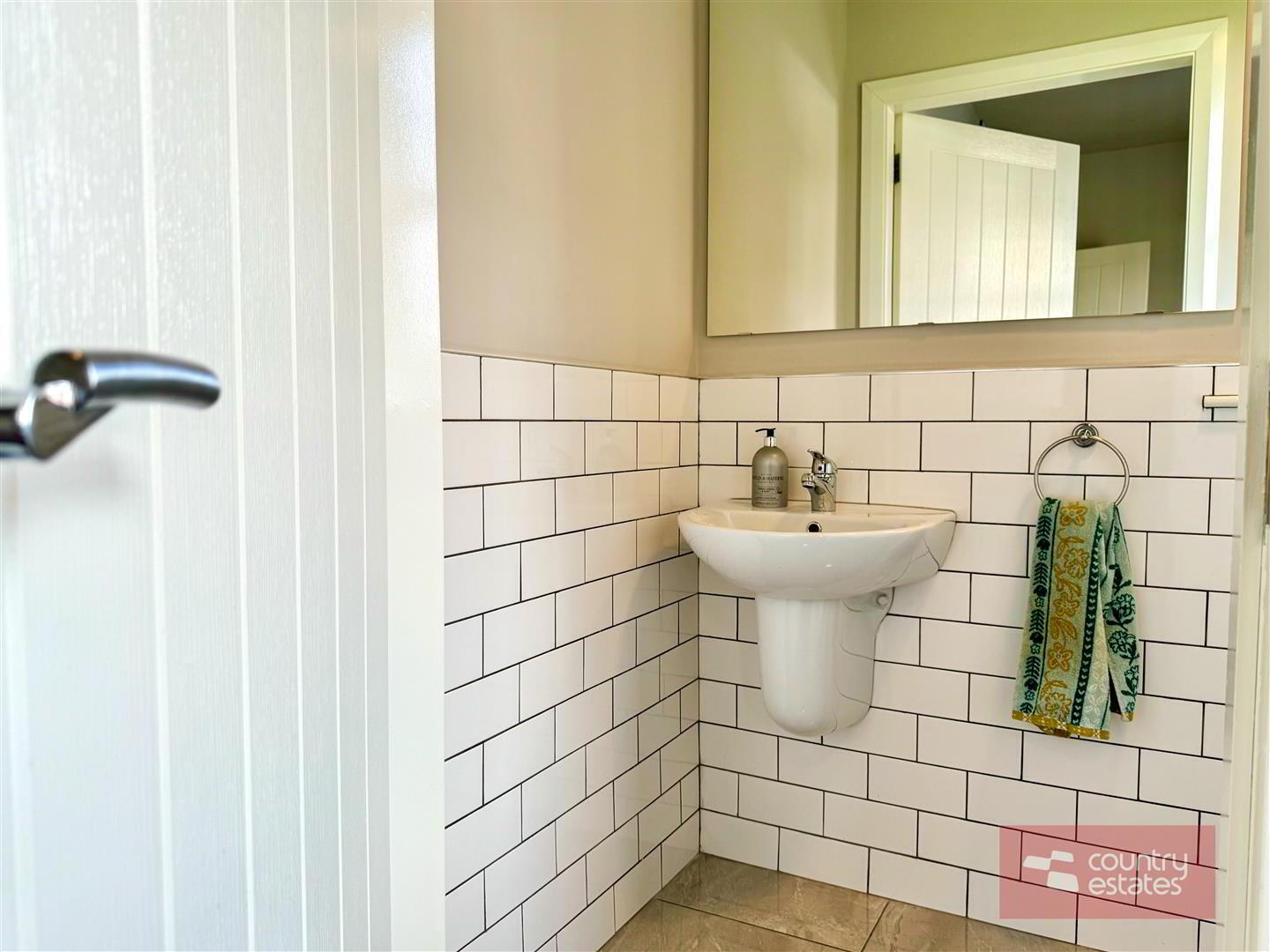 - Contemporary white two piece suite comprising semi pedestal wash hand basin and WC. Half tiling to walls in metro brick. Tiled floor.