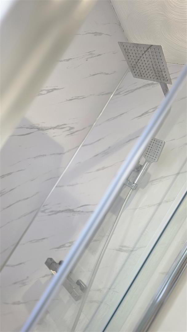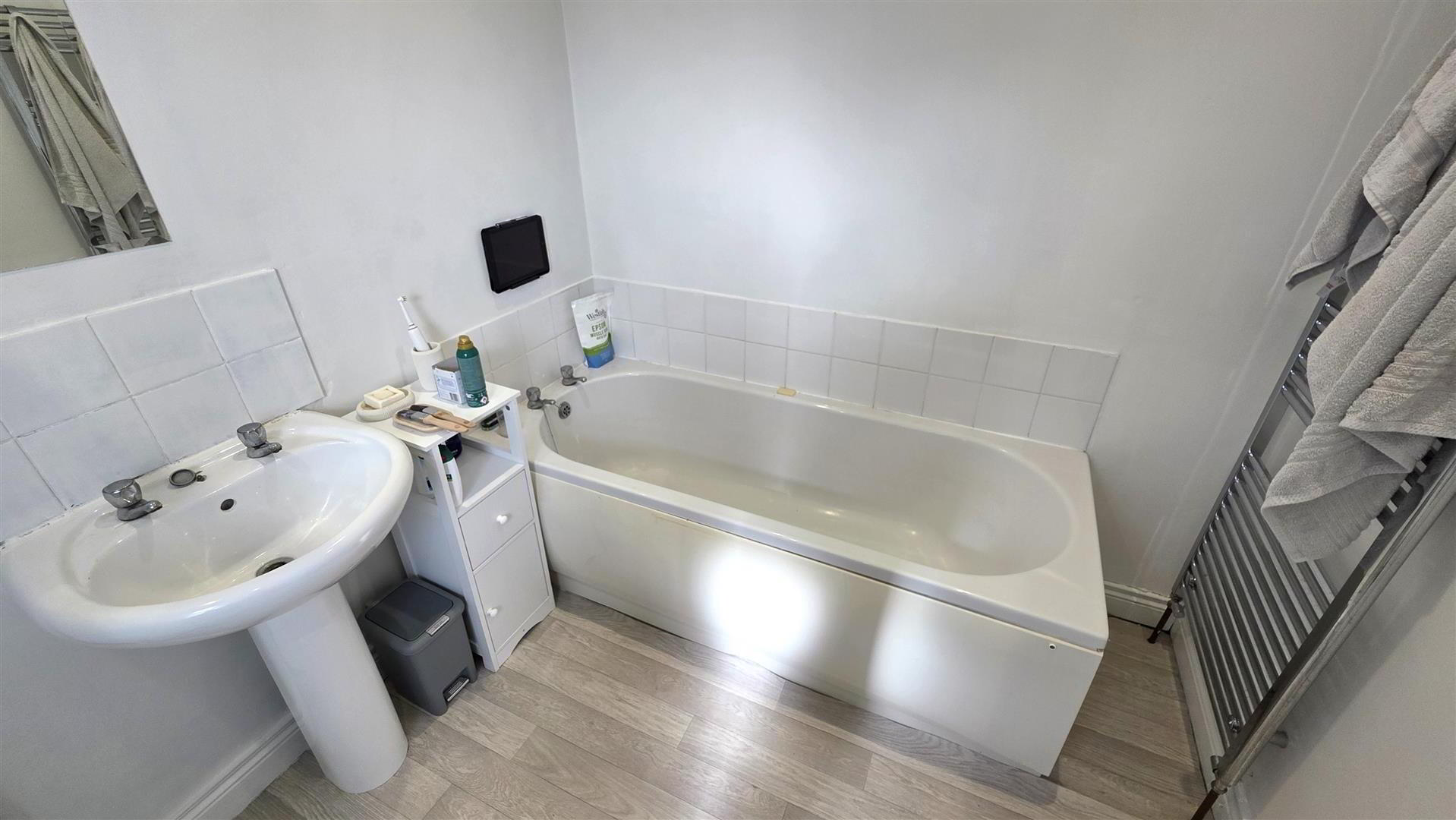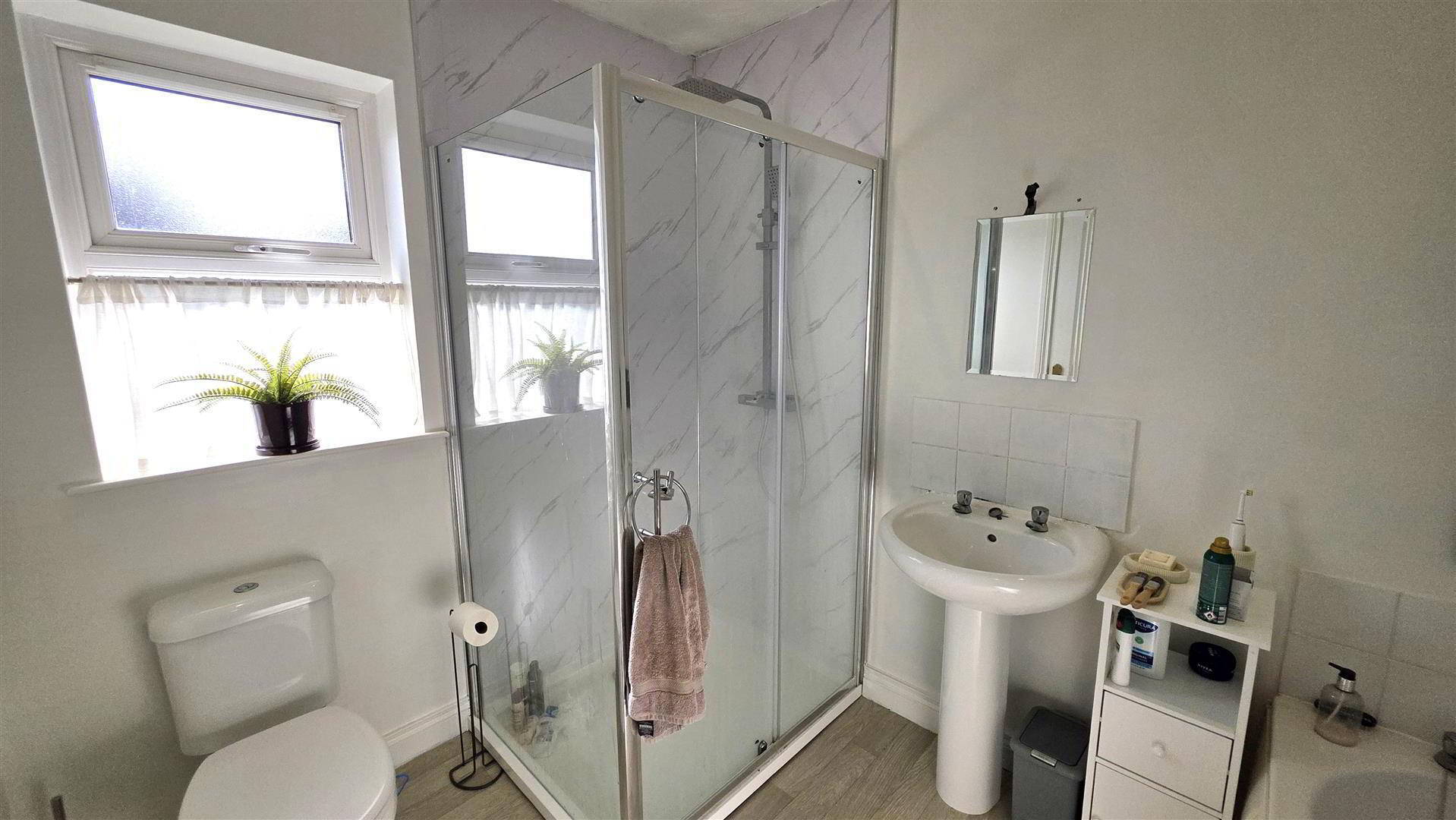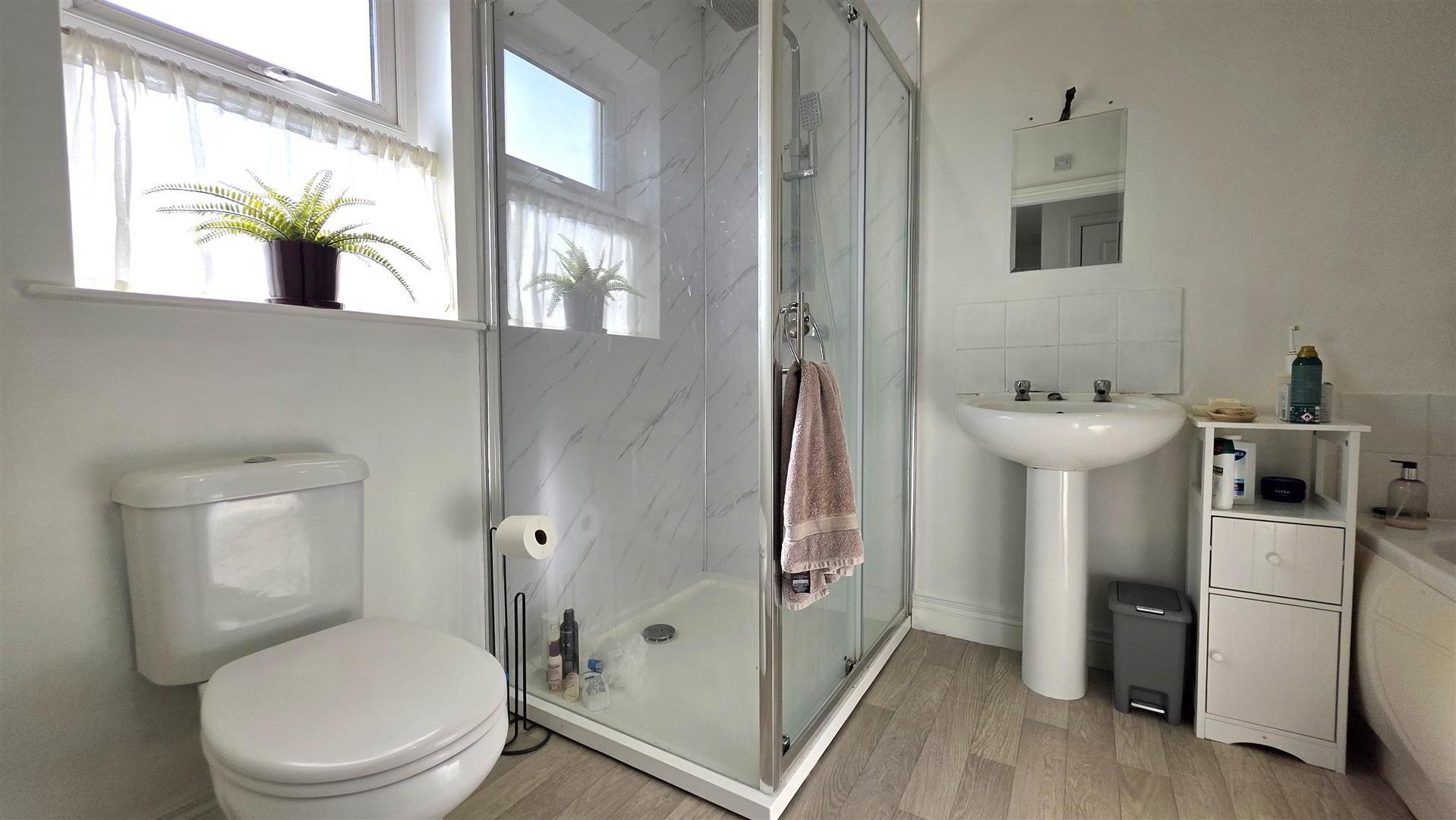 - Modern white suite comprising panel bath with tiled splash back. Push button low flush W/C and pedestal wash hand basin with tiled splash back. PVC clad shower cubicle with pivot and slide doors, 'Rainfall' shower head and secondary attachment. Chrome towel radiator.