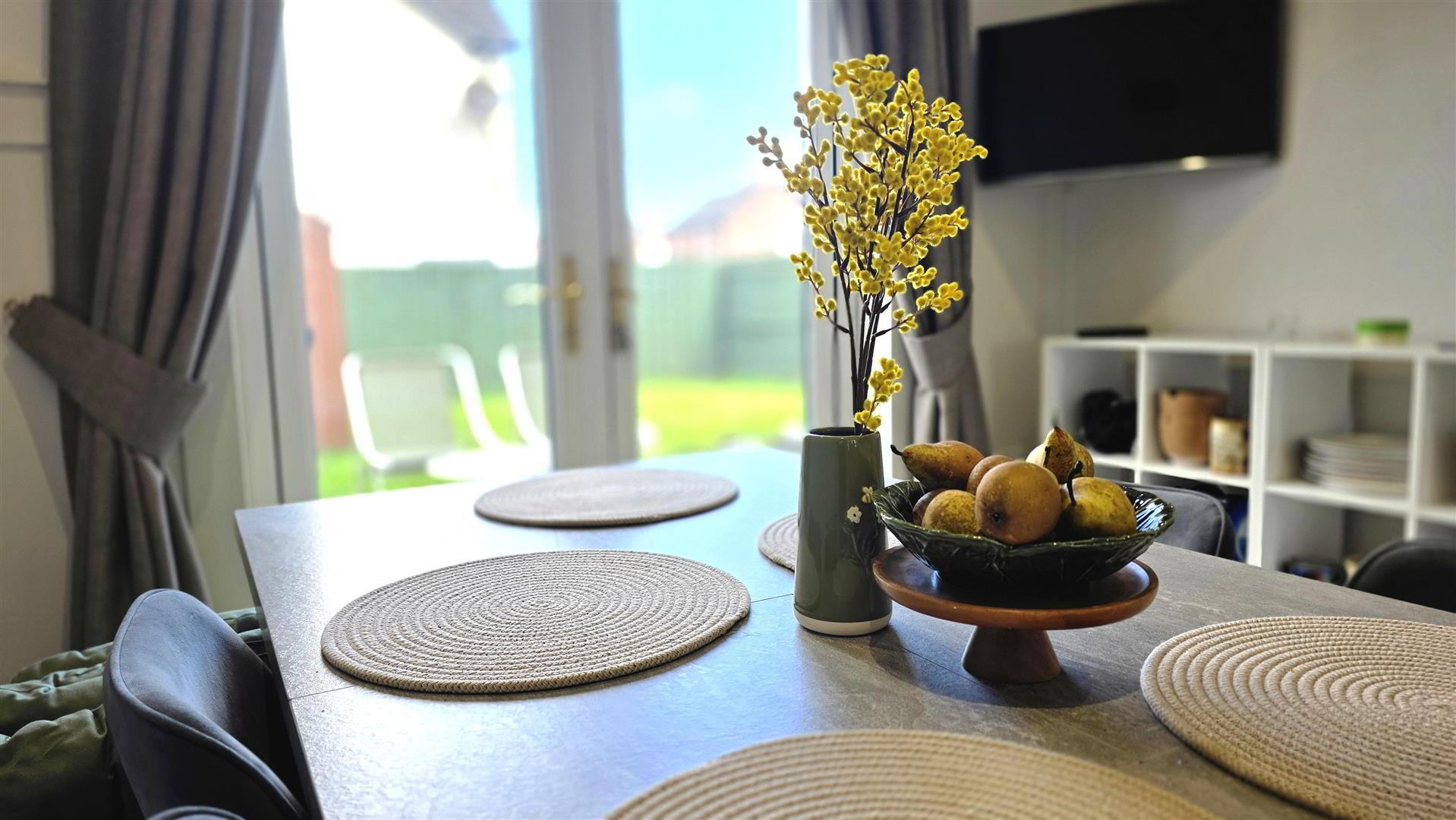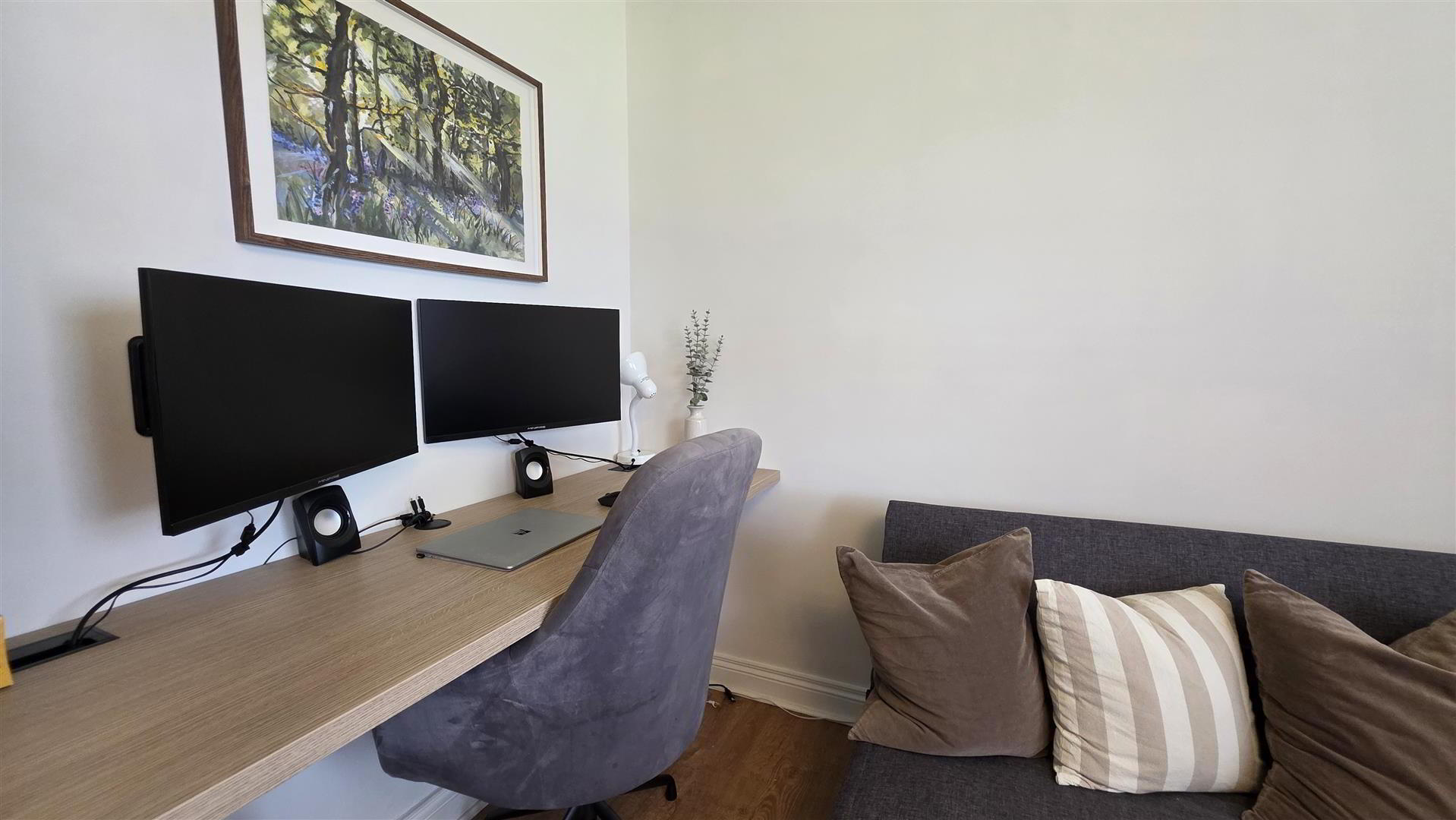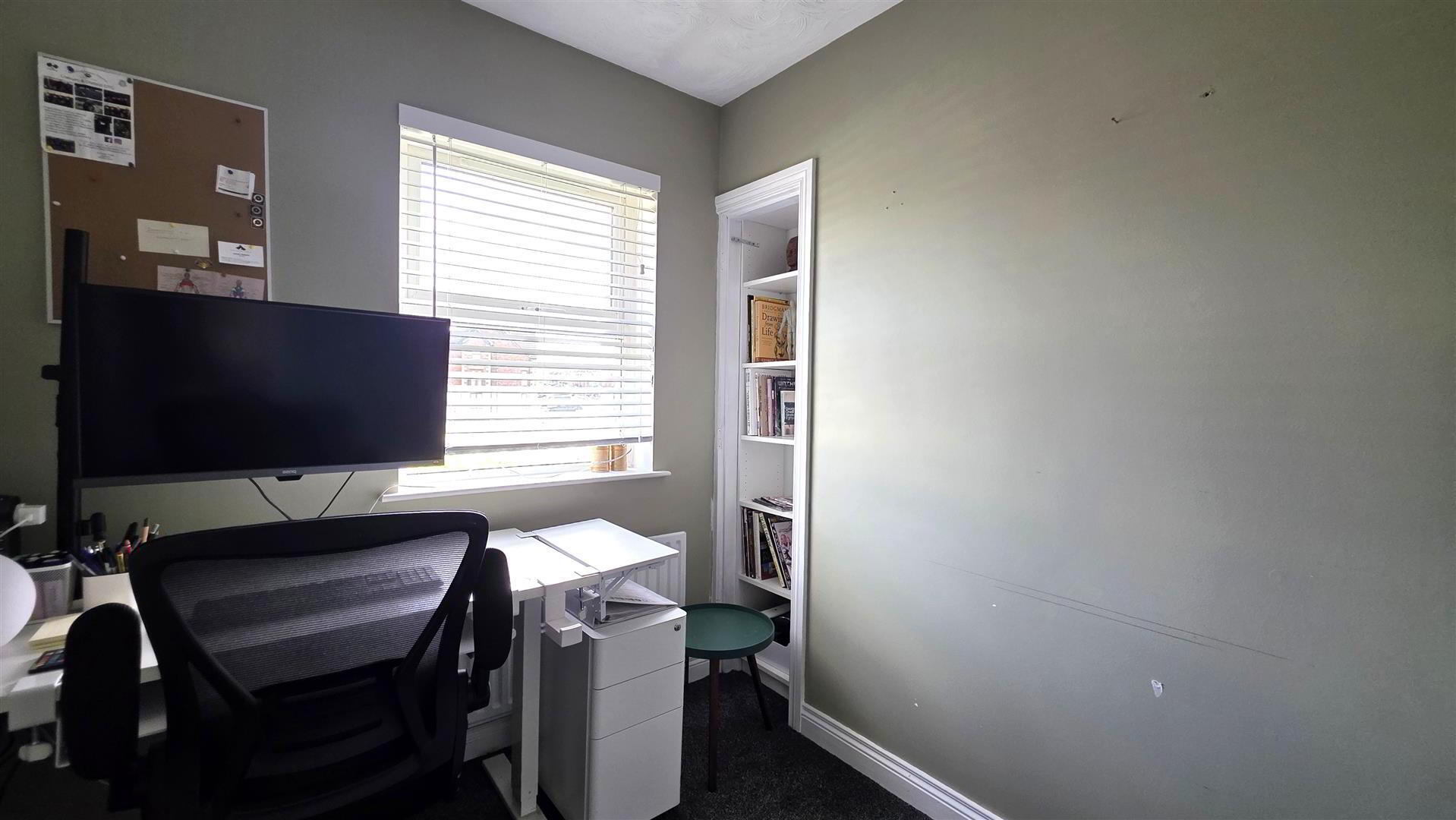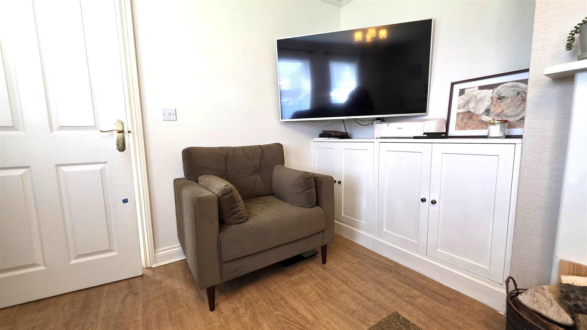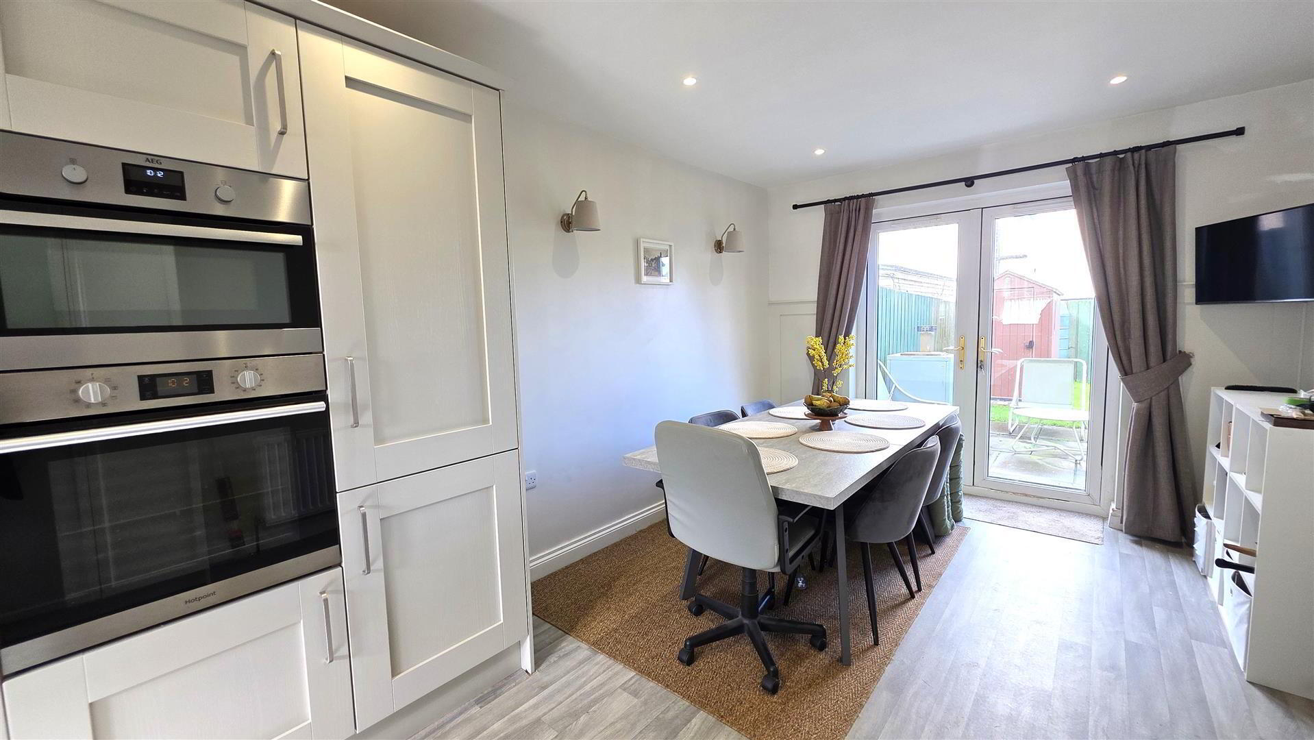 The spacious living room has been thoughtfully designed with bespoke built-in storage and an integrated desk, creating the perfect space for working from home. Upstairs, the property boasts three well-proportioned bedrooms, two enhanced with stylish feature wall panelling, alongside a contemporary four-piece family bathroom incorporating a panel bath and enclosed shower with rainfall shower head.