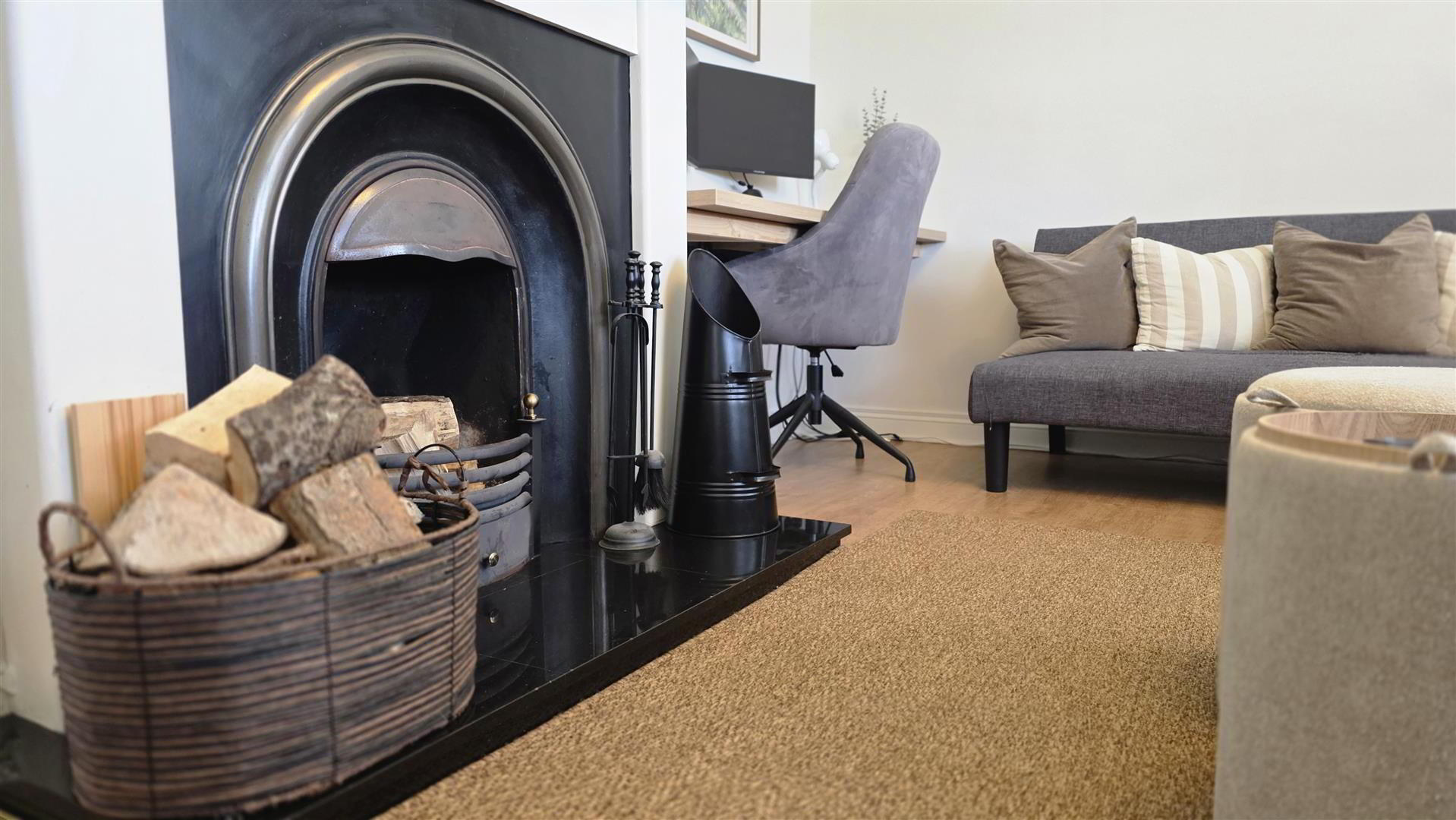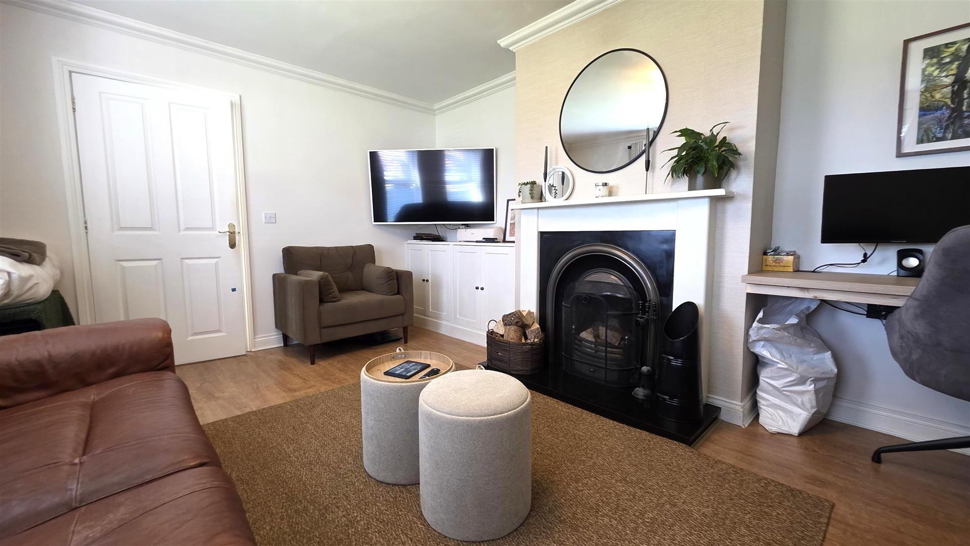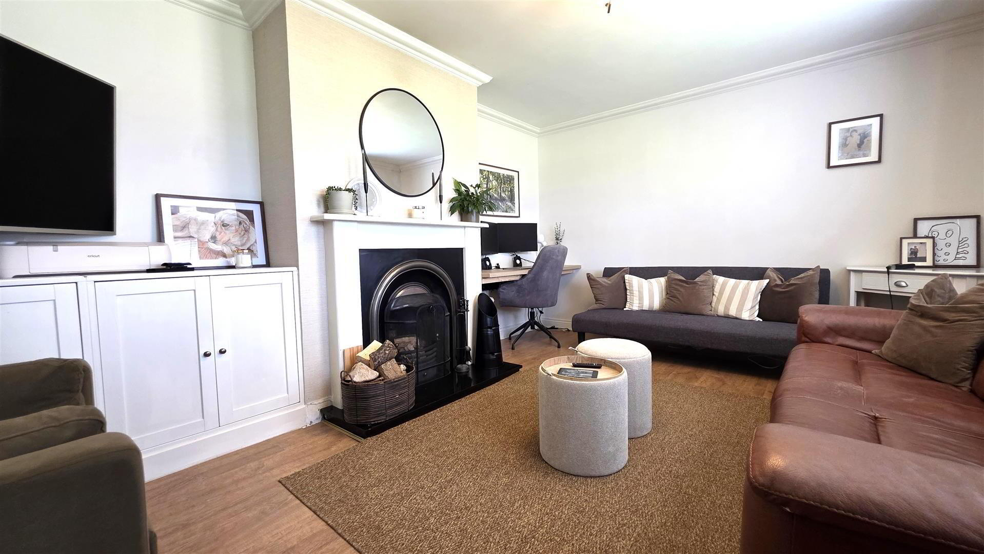 - Open fire with feature wooden surround and part polished cast iron inset. Integrated storage. Integrated desk suitable for home working. Wood laminate floor. Double radiator.