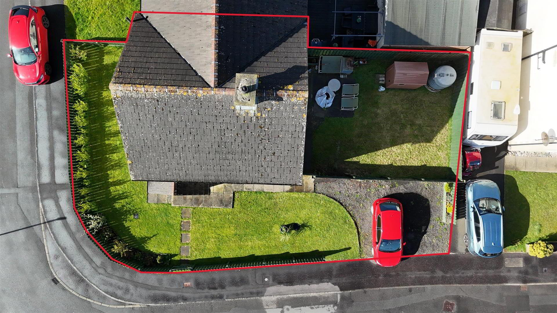 - Stoned drive with side by side parking for two cars. Garden to front and side in lawn and paved pathway.