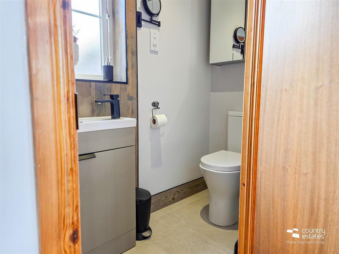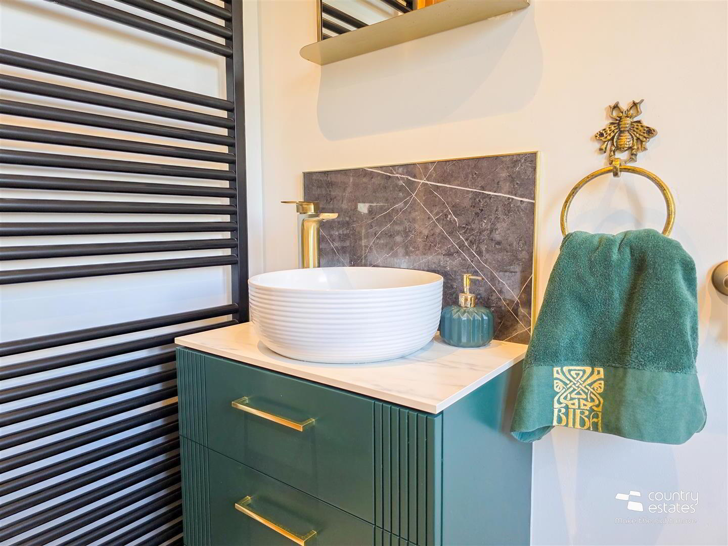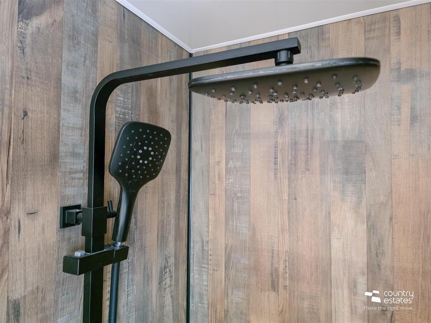 - Comprising shower cubicle with thermostatically controlled drench style shower and hand shower attachment, a vanity wash hand basin and a button flush WC. Tiled floor.