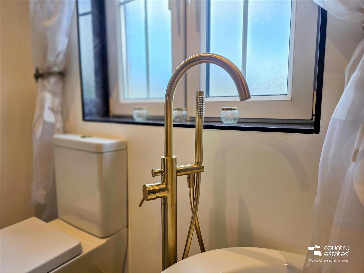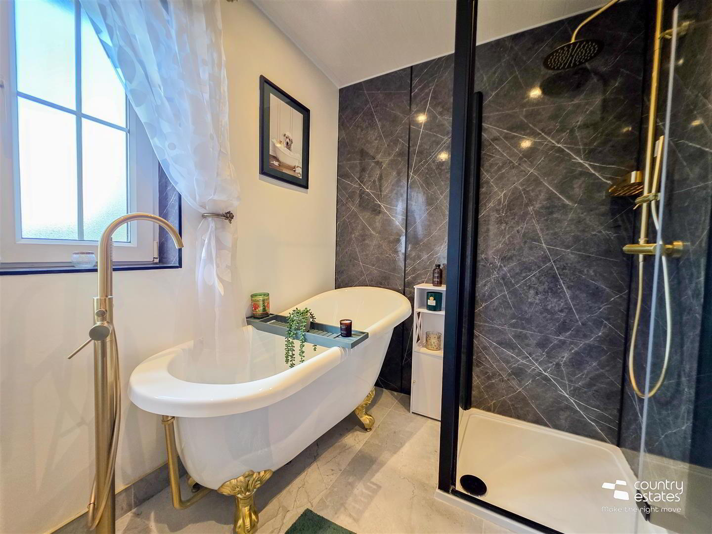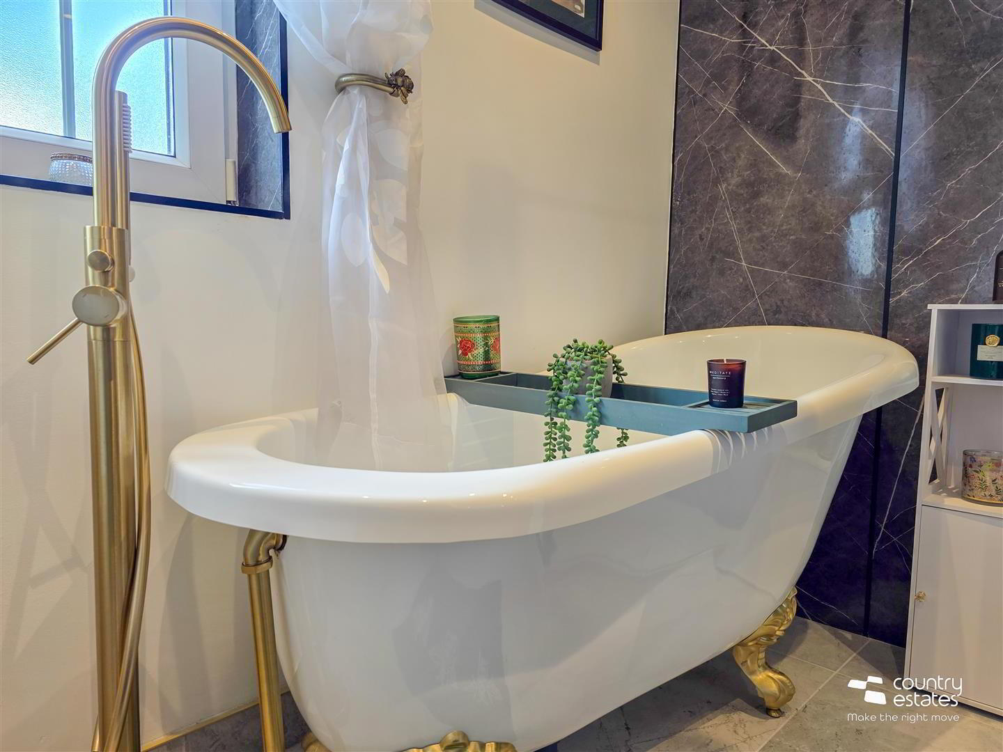 - Comprising Free standing claw foot bath with floor mounted tap and hand shower attachment, PVC panelled shower cubicle with thermostatically controlled drench style shower and hand shower attachment, vanity unit with top mounted wash hand basin and monobloc tap and a button flush WC. Tiled floor. Recessed down lighting.