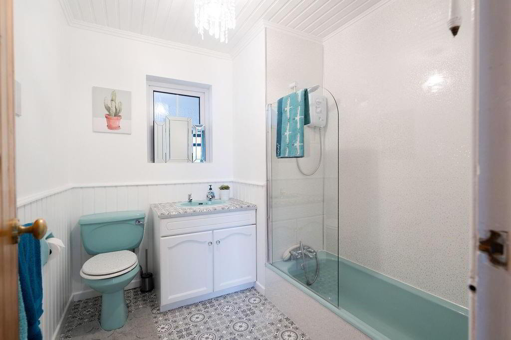 - Three piece suite comprising a sunken bath with "Triton TBO" thermostatic shower over with partially glazed screen and PVC wall panelling. Wall mounted wash hand basin with stainless steel hot and cold taps and storage below. Low flush WC. Single radiator.
