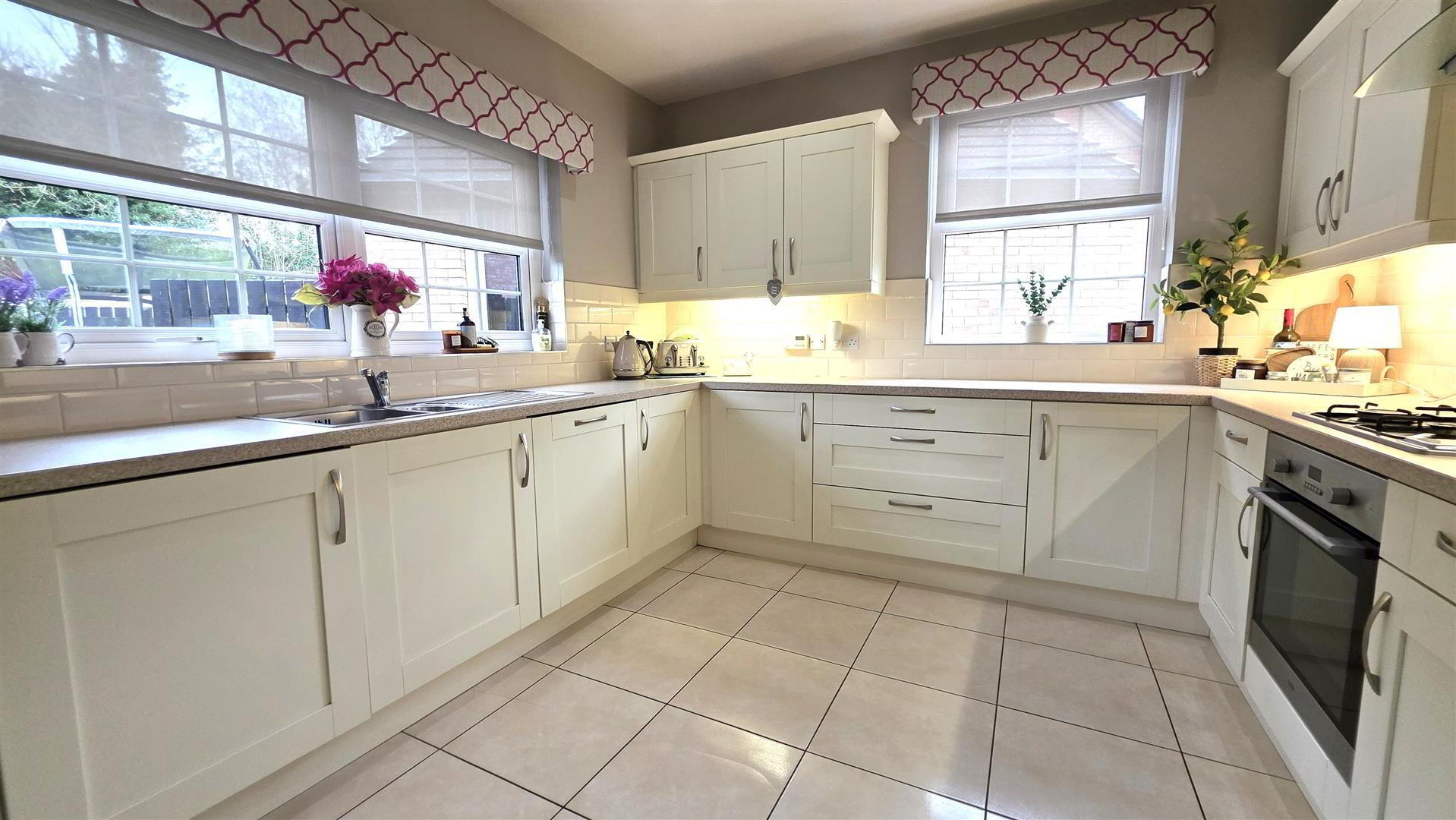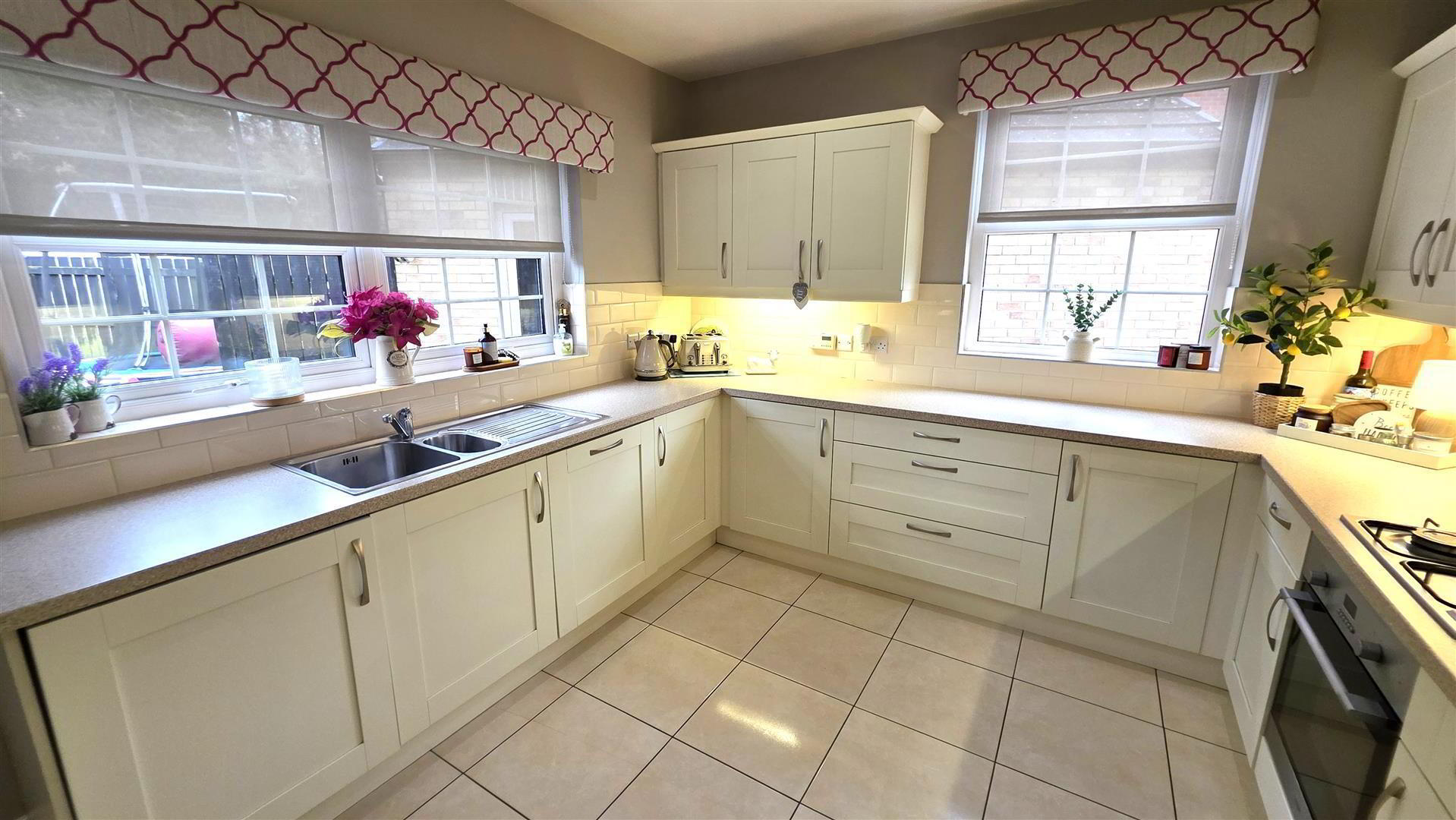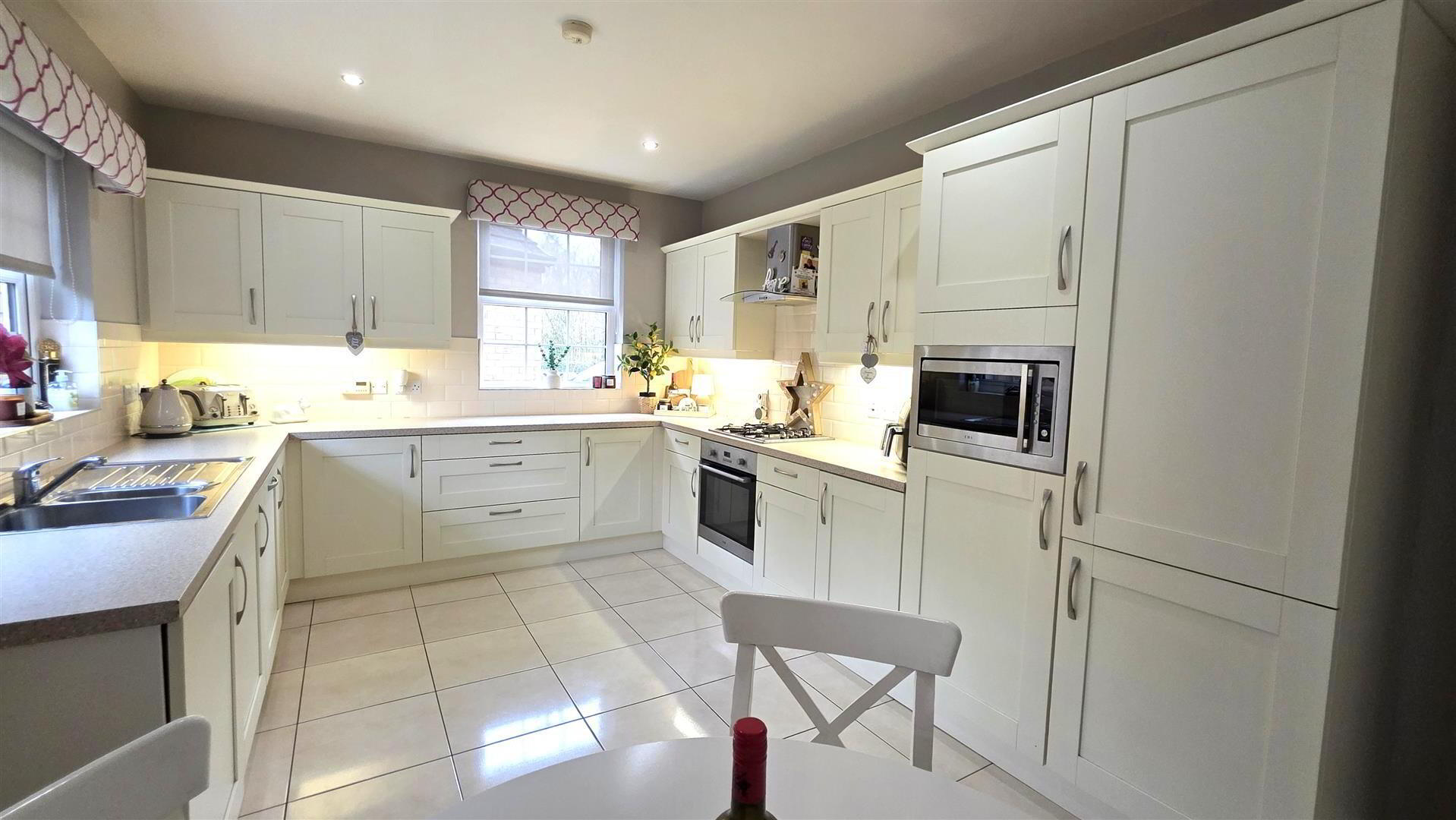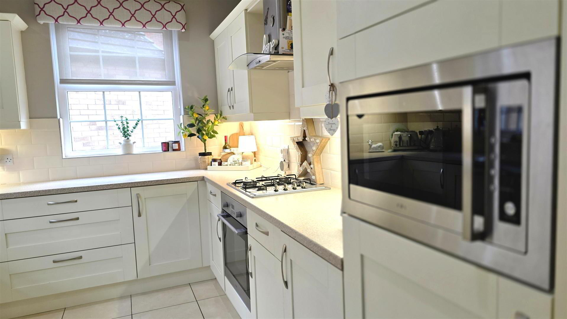 - Full range of cream coloured Shaker style high and low level units with chrome handles and complimentary work surfaces. One and a half bowl single drainer stainless steel sink unit and mixer taps. Integrated 4 ring gas hob with feature stainless steel and glass over head extractor fan. Low level combination oven and grill. Integrated microwave, fridge, freezer, dishwasher and washing machine. Partially tiled walls to work surface. Fully tiled floor. Low voltage down lights. Double radiator. PVC double glazed French doors to rear.