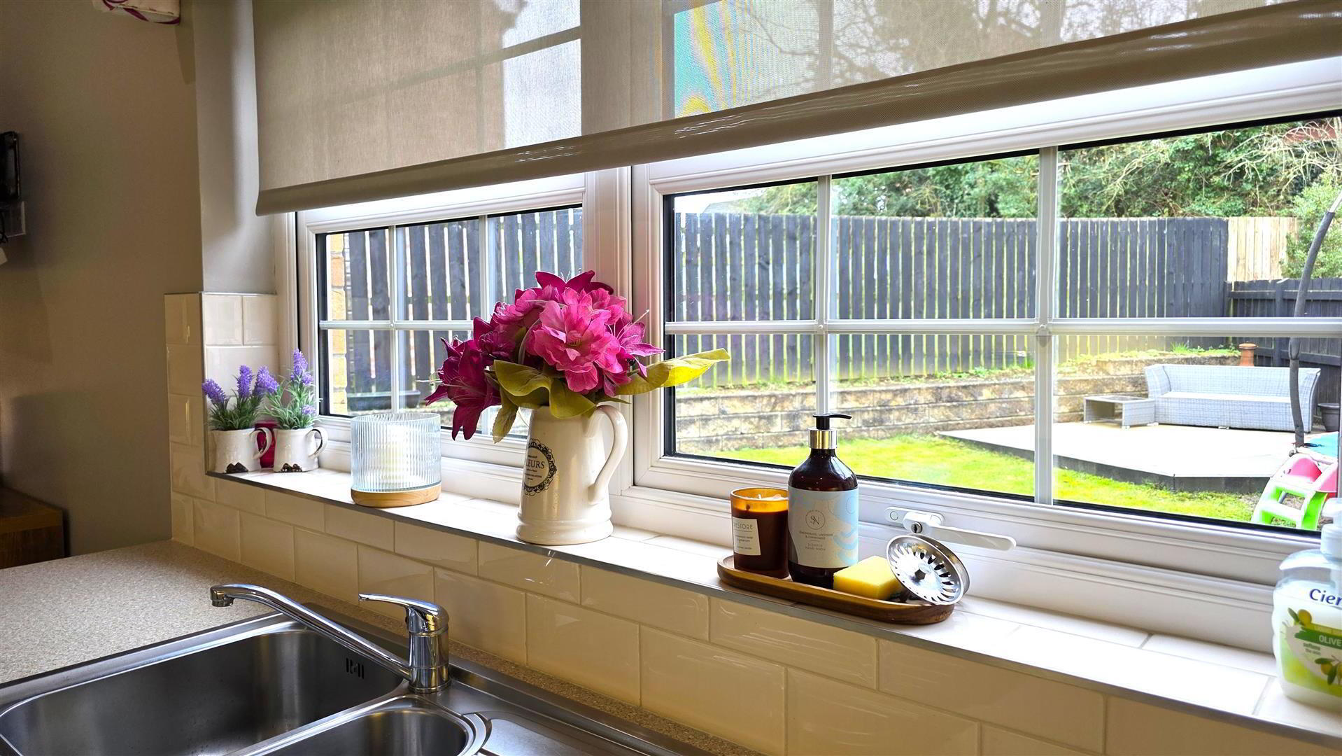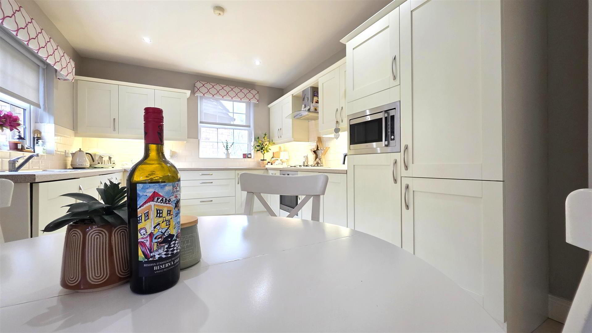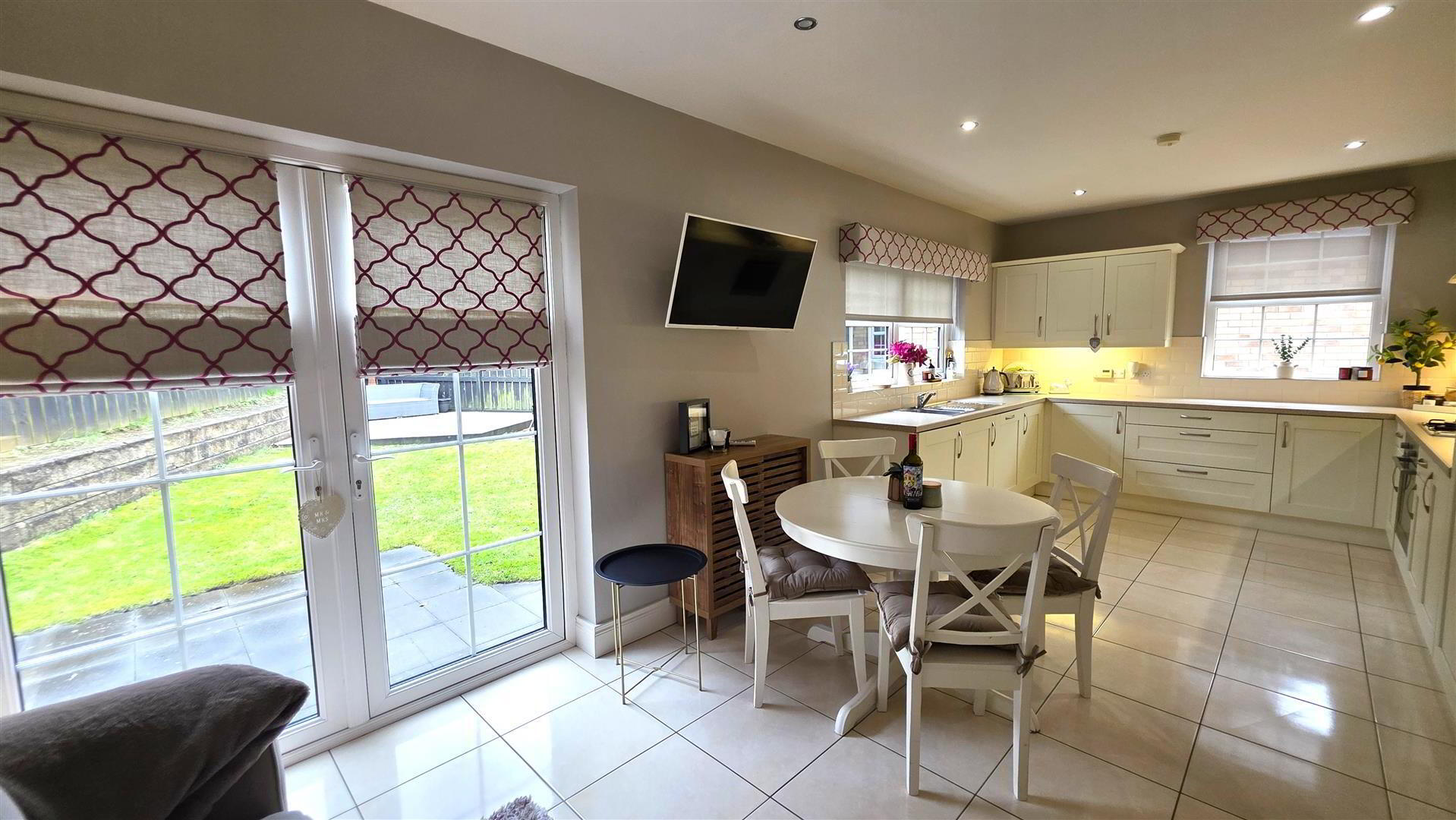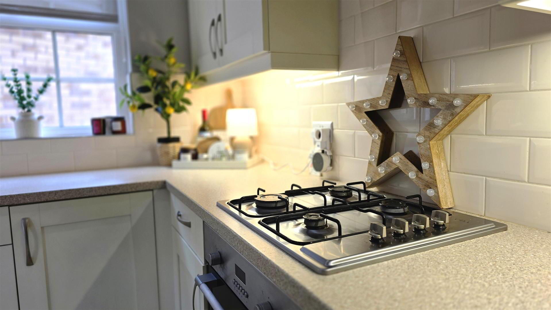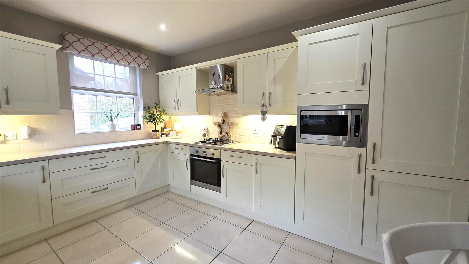 - Full range of cream coloured Shaker style high and low level units with chrome handles and complimentary work surfaces. One and a half bowl single drainer stainless steel sink unit and mixer taps. Integrated 4 ring gas hob with feature stainless steel and glass over head extractor fan. Low level combination oven and grill. Integrated microwave, fridge, freezer, dishwasher and washing machine. Partially tiled walls to work surface. Fully tiled floor. Low voltage down lights. Double radiator. PVC double glazed French doors to rear.