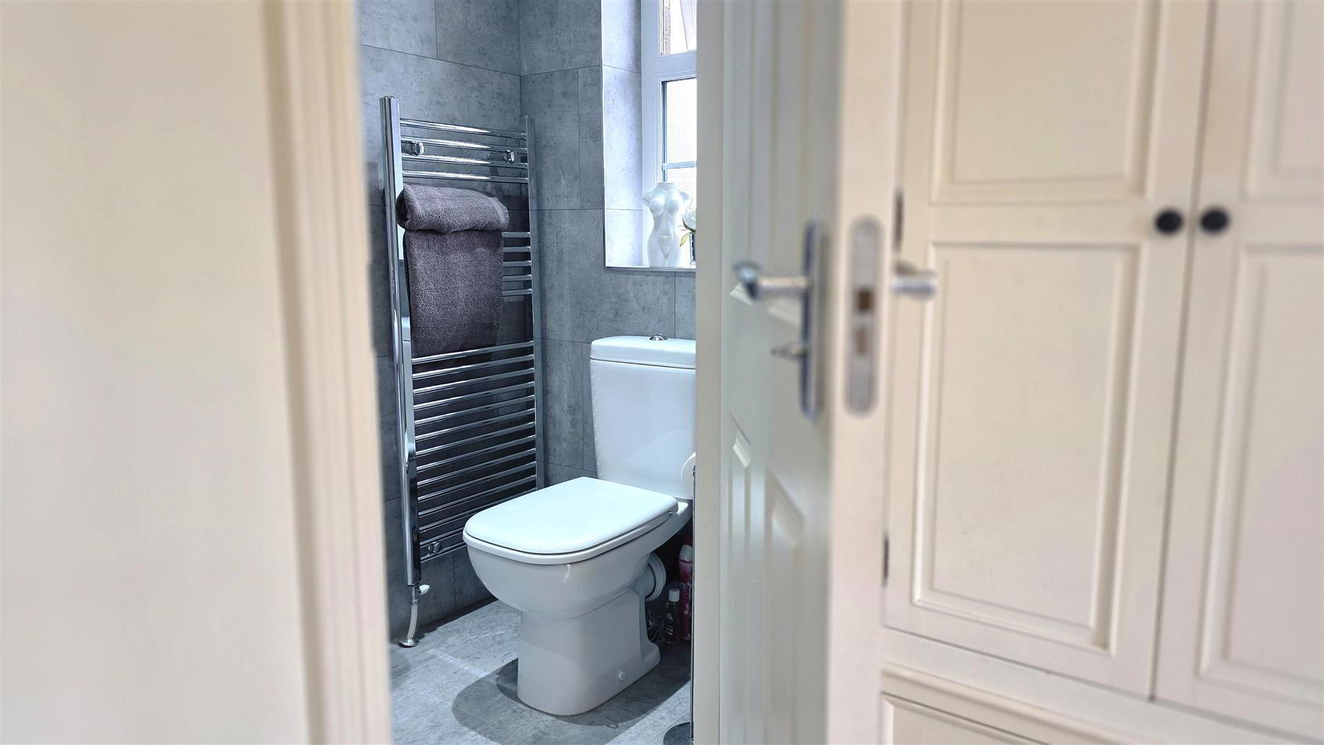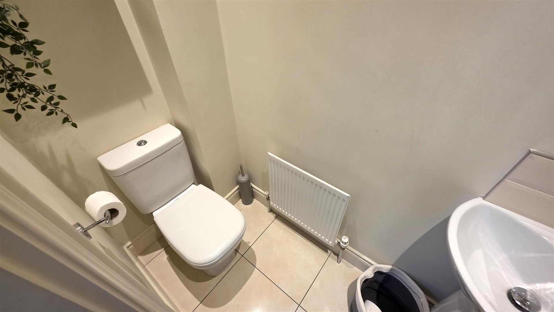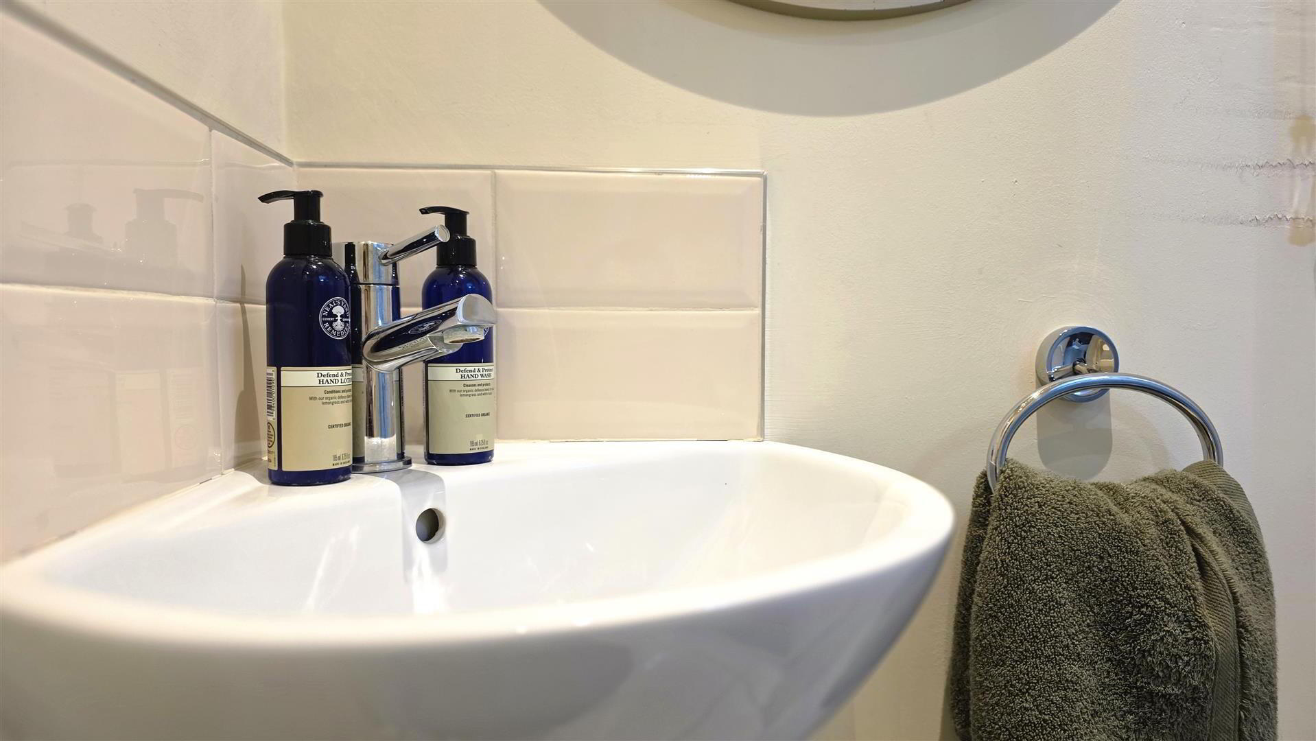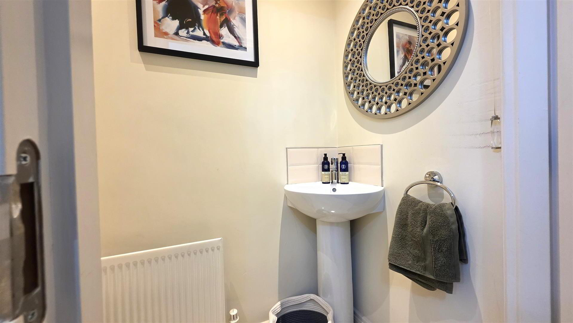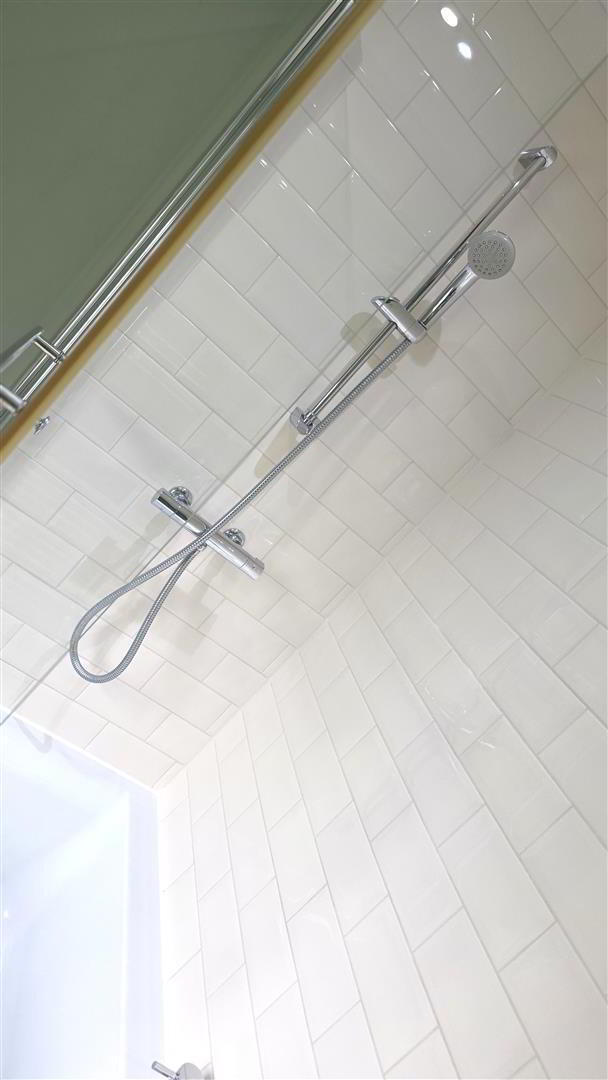 - Modern white suite comprising push button low flush W/C and corner pedestal wash hand basin with mixer taps and tiled splash back. Fully tiled floor. Extractor fan. Low voltage down lights. Single radiator.