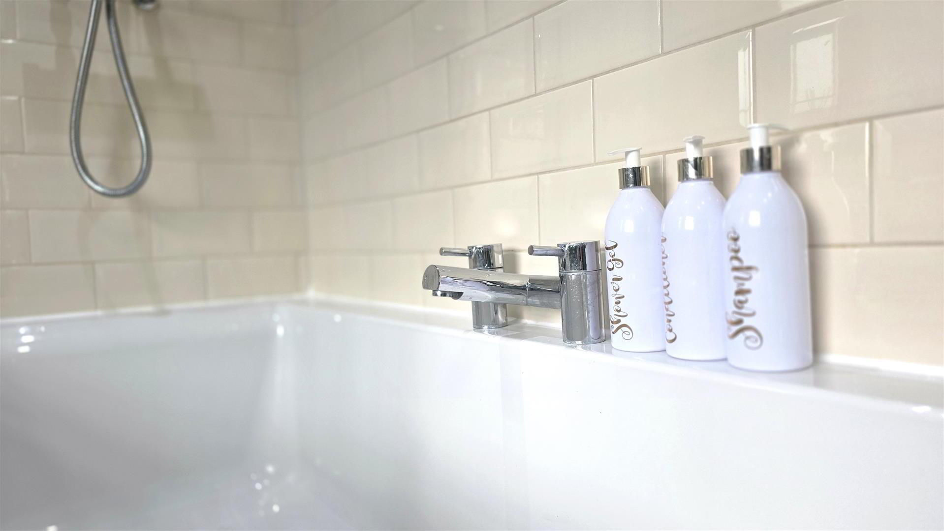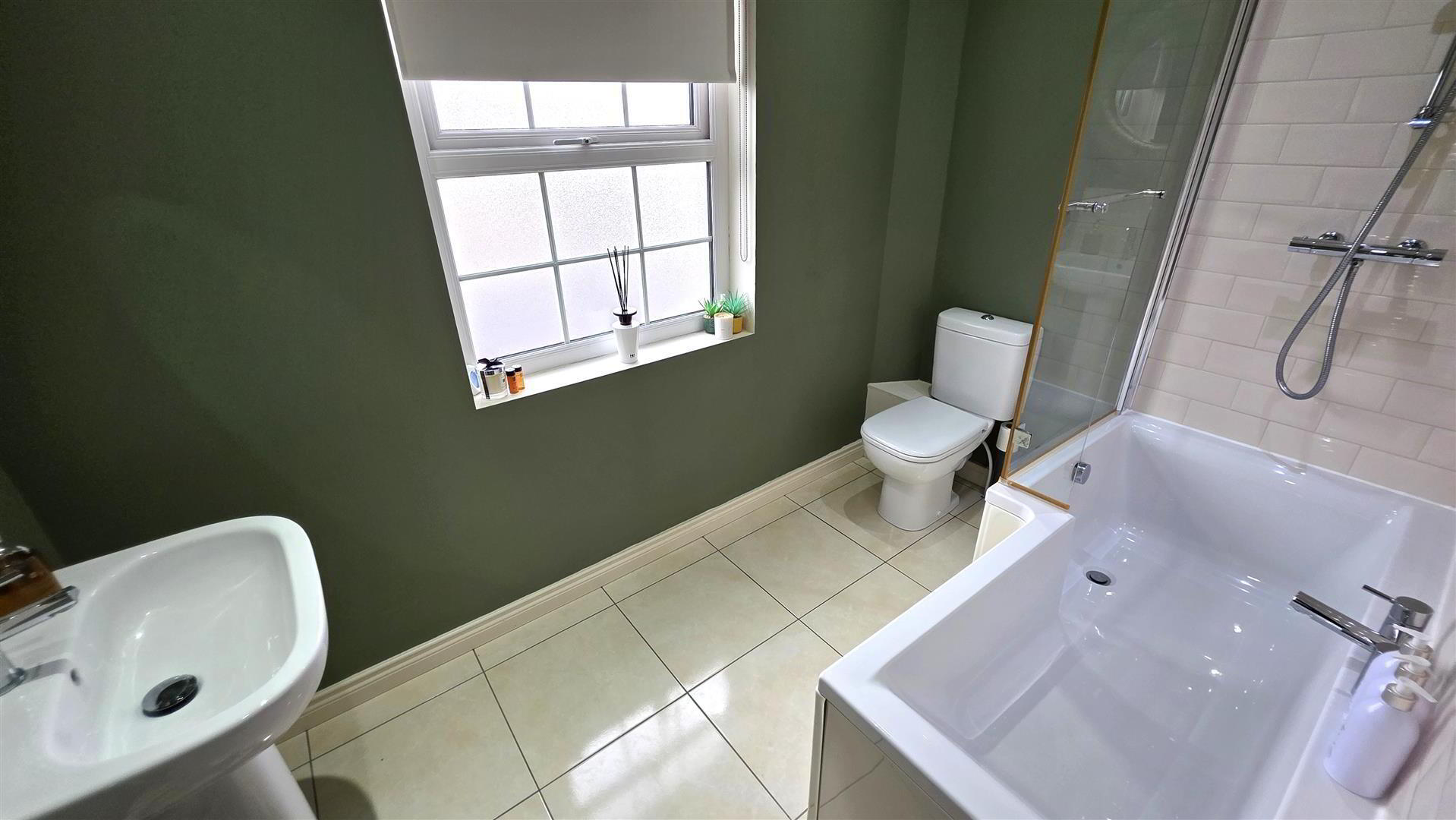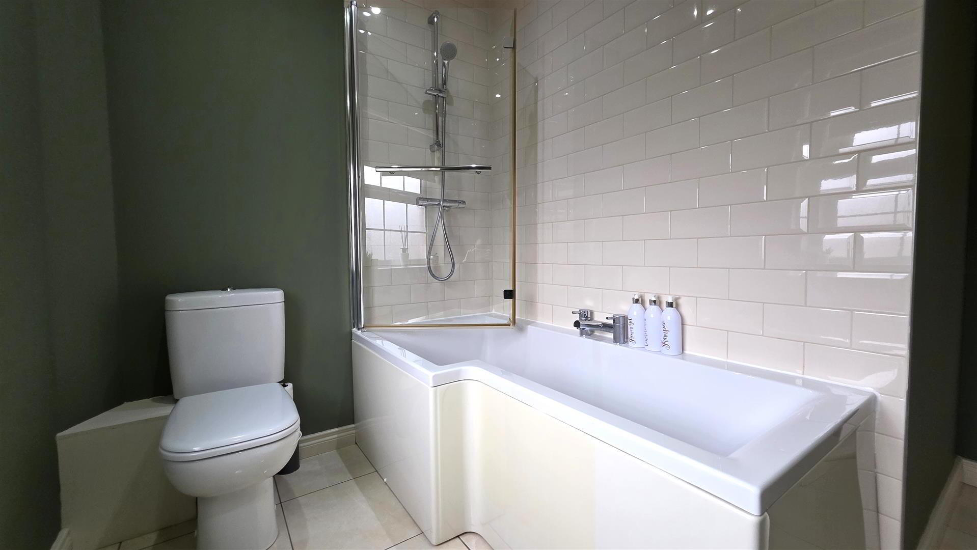 - Modern white suite comprising double ended shower bath with offset taps and thermostatic shower unit. Glazed screen. Push button low flush W/C and pedestal wash hand basin with monobloc mixer taps and tied splashback. Chrome heated towel rail. Feature cream coloured "metro" style tiled walls to bath area. Fully tiled floor. Extractor fan. Low voltage down lights.