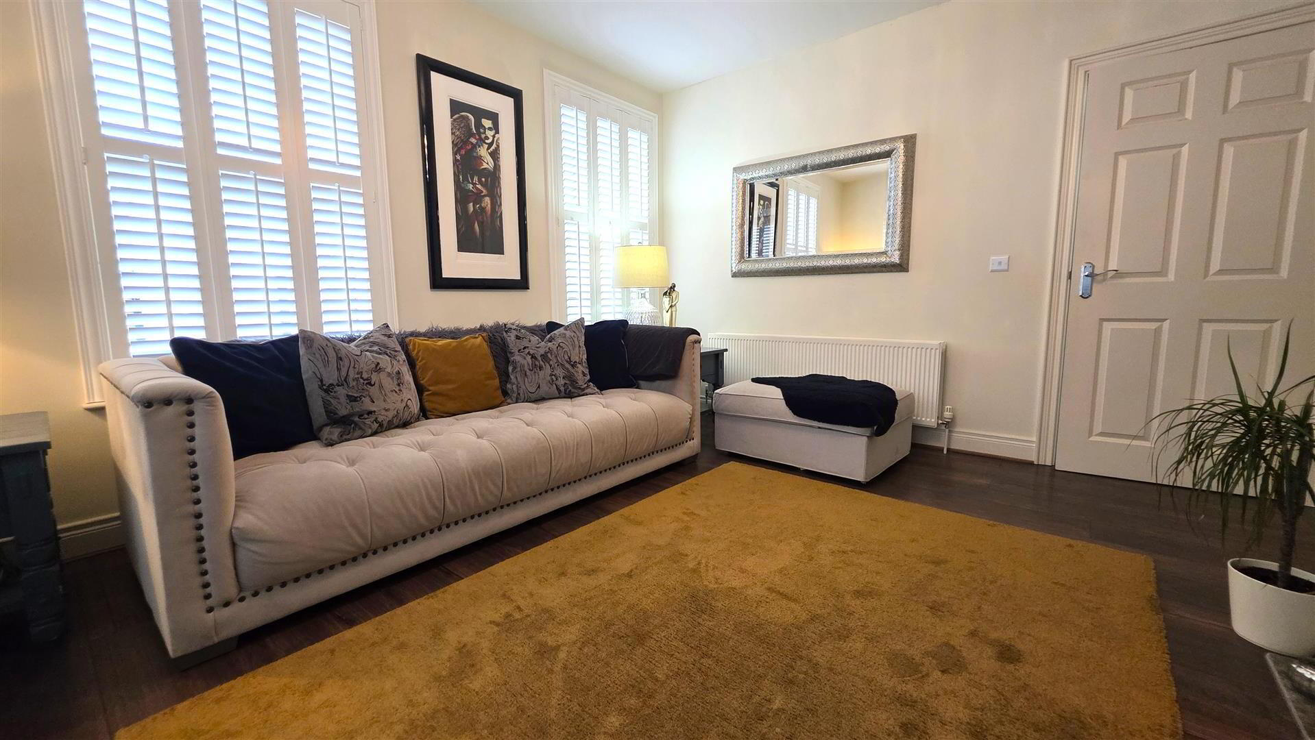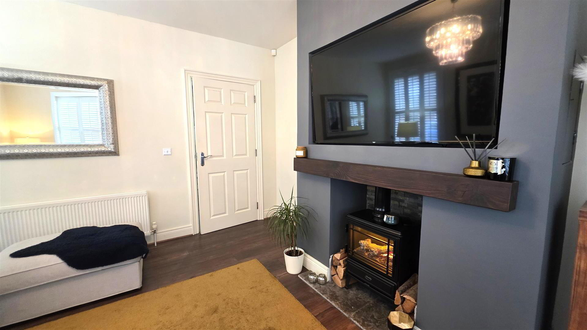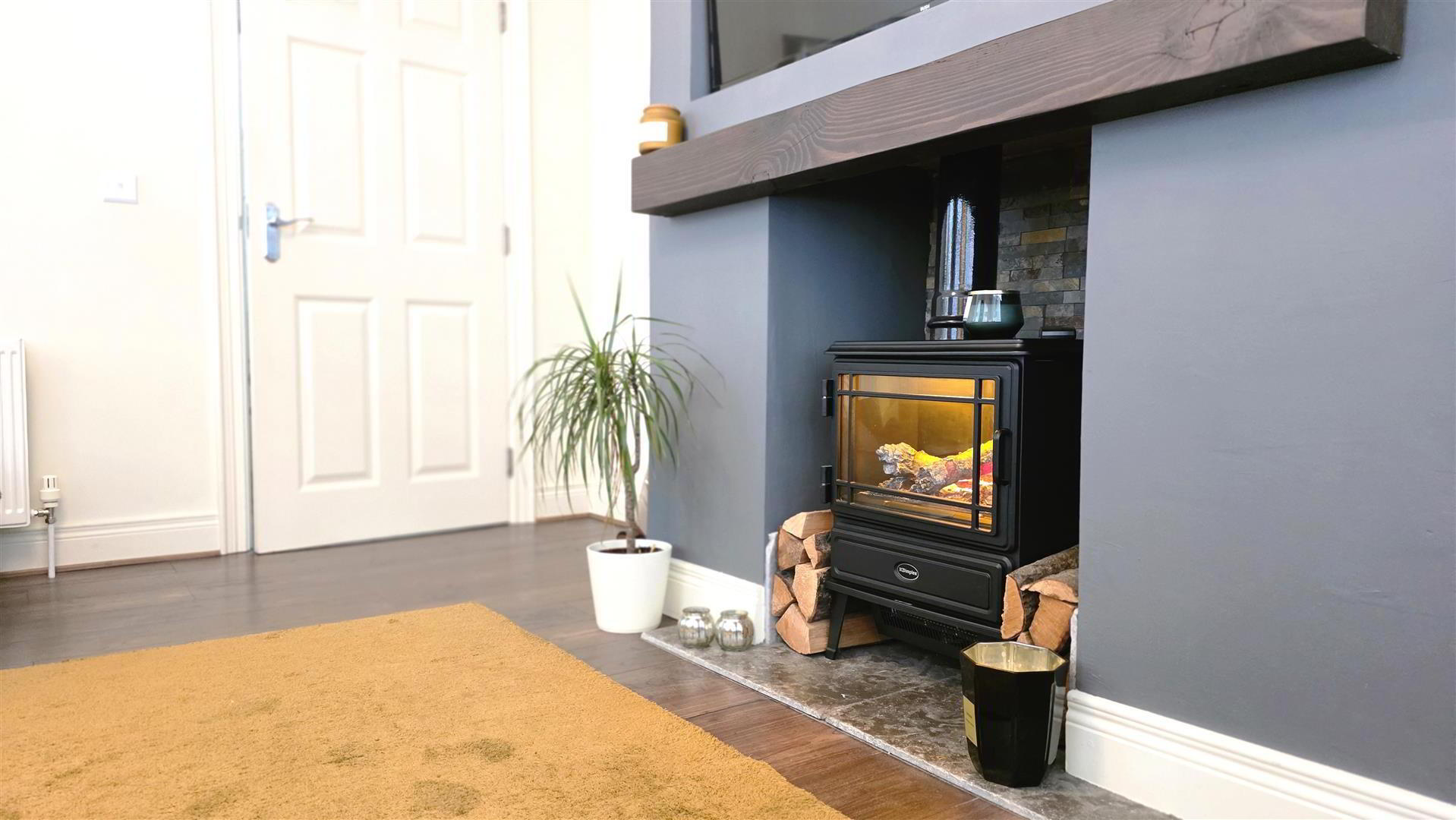 - (into bay). Media wall with space for 60" TV, walnut coloured mantle and inset space for electric stove. Slate hearth. Walnut wood laminate flooring. Dual aspect windows. Double radiator.