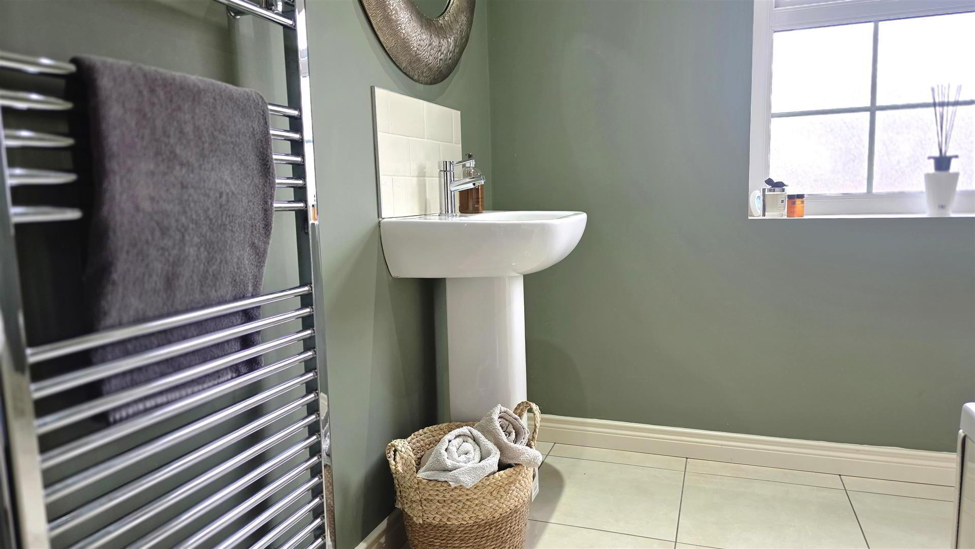 - Modern white suite comprising push button low flush W/C, pedestal wash hand basin with monobloc mixer taps and composite wall tiling to shower cubicle with thermostatic unit and sliding cubicle door. Composite tiled floor. Polished chrome heated towel rail. Low voltage down lights. Extractor fan.