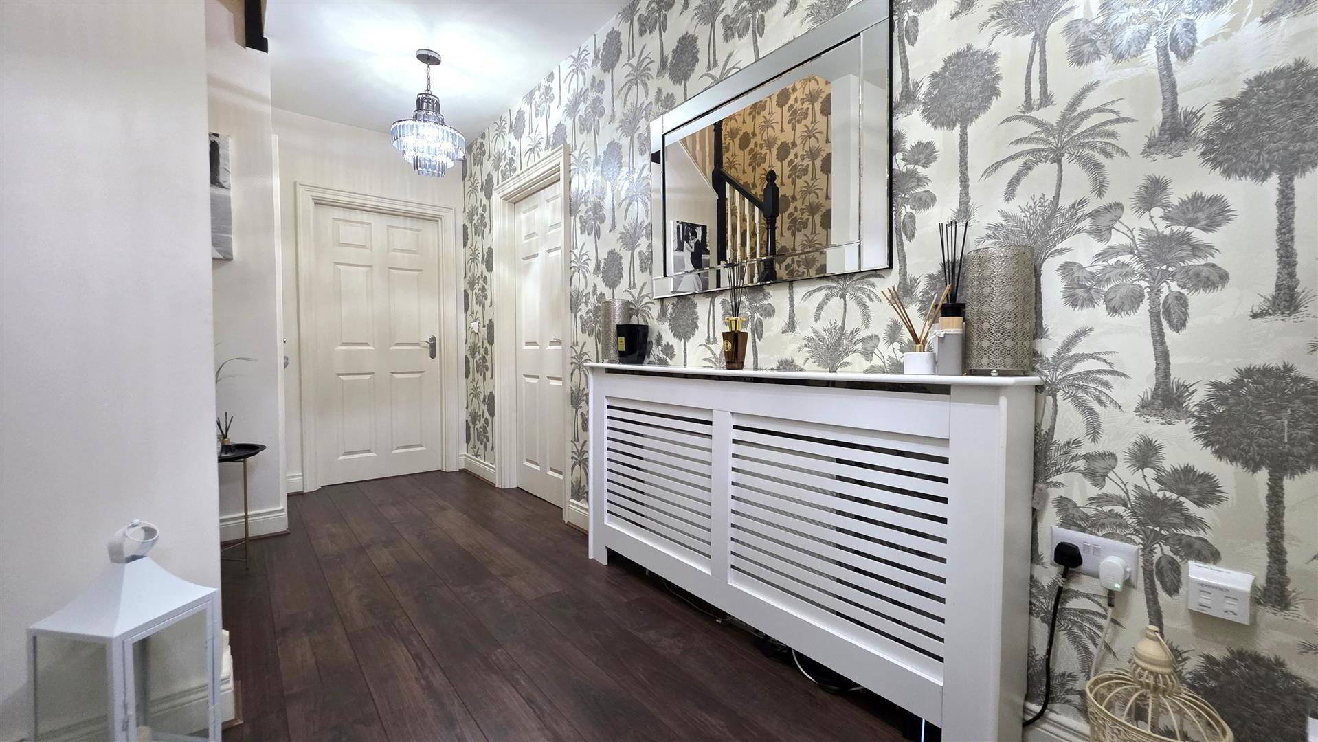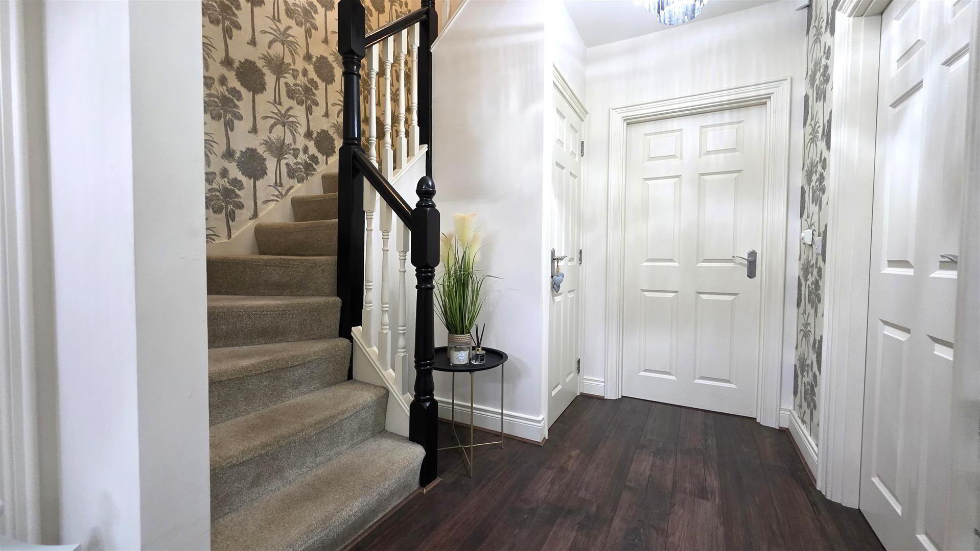 - Partially tiled floor. Staircase to first floor with painted moulded hand rail and contrasting white turned balustrading. Walnut wood laminate floor. Understair storage. Double radiator.
