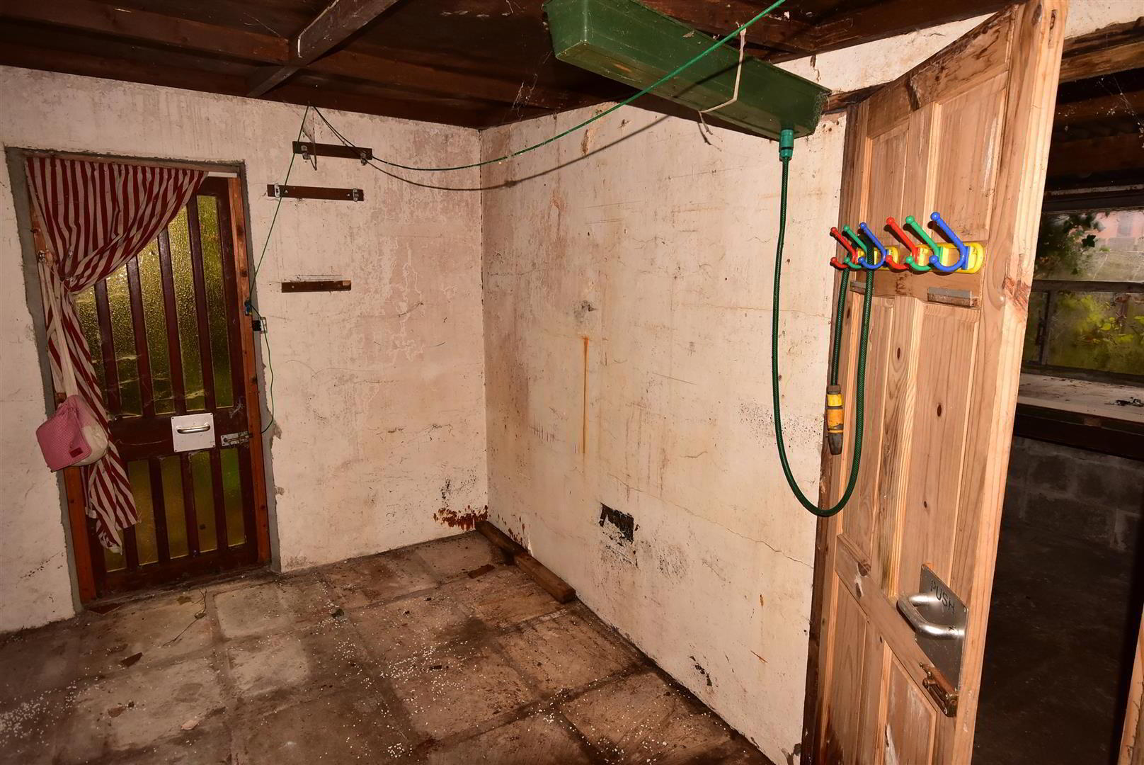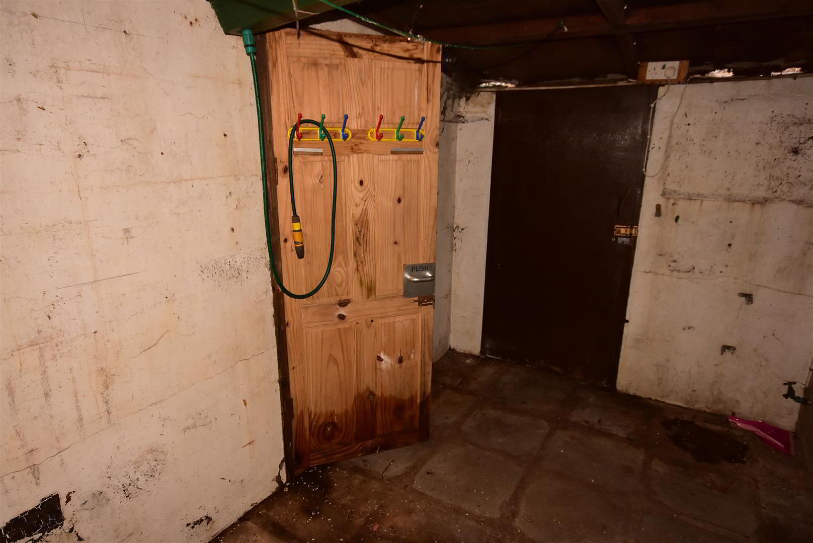 - Flagged floor. Door to either side. Access to;