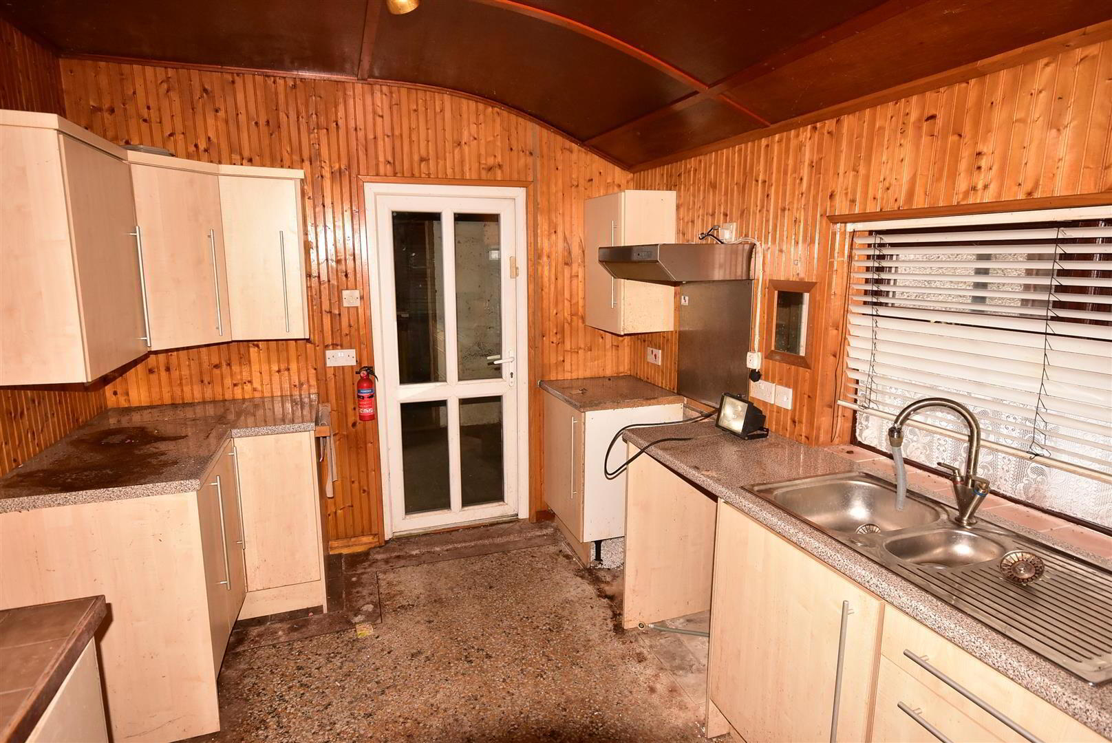 - Feature curved wooden ceiling. Full range of very basic high and low level units with glazed displays. One and a quarter bowel single drainer stainless steel sink unit and mixer taps. Space for cooker and fridge / freezer. Plumbed for washing machine. Terrazzo floor. Dual aspect windows. PVC double glazed door to;