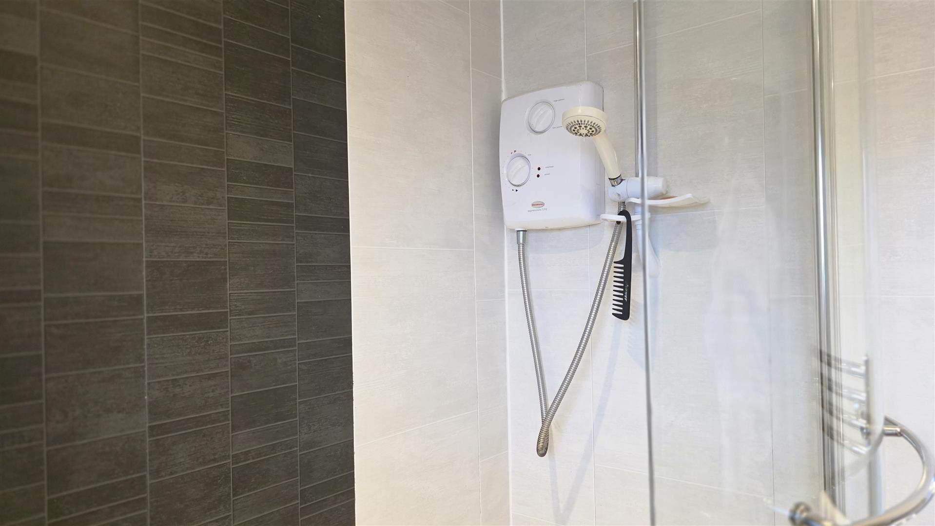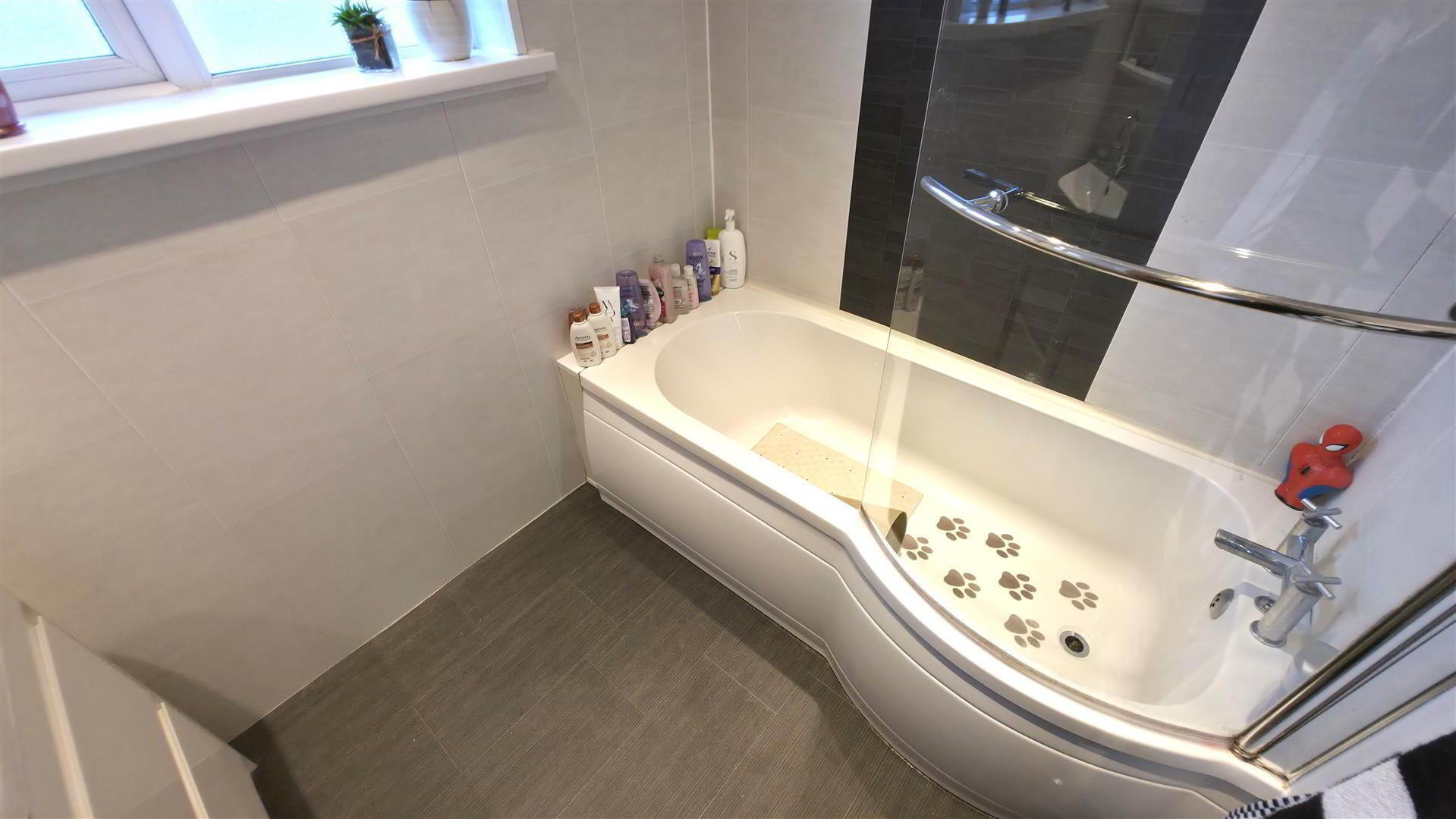 - Modern white bathroom suite comprising panel bath with red ring expressions electric shower over, Chrome mixer tap and partially glazed screen. Vanity sink unit with chrome mixer top and storage below. Low voltage downlighting. Chrome towel radiator.