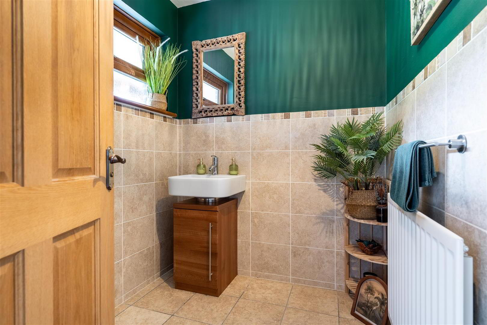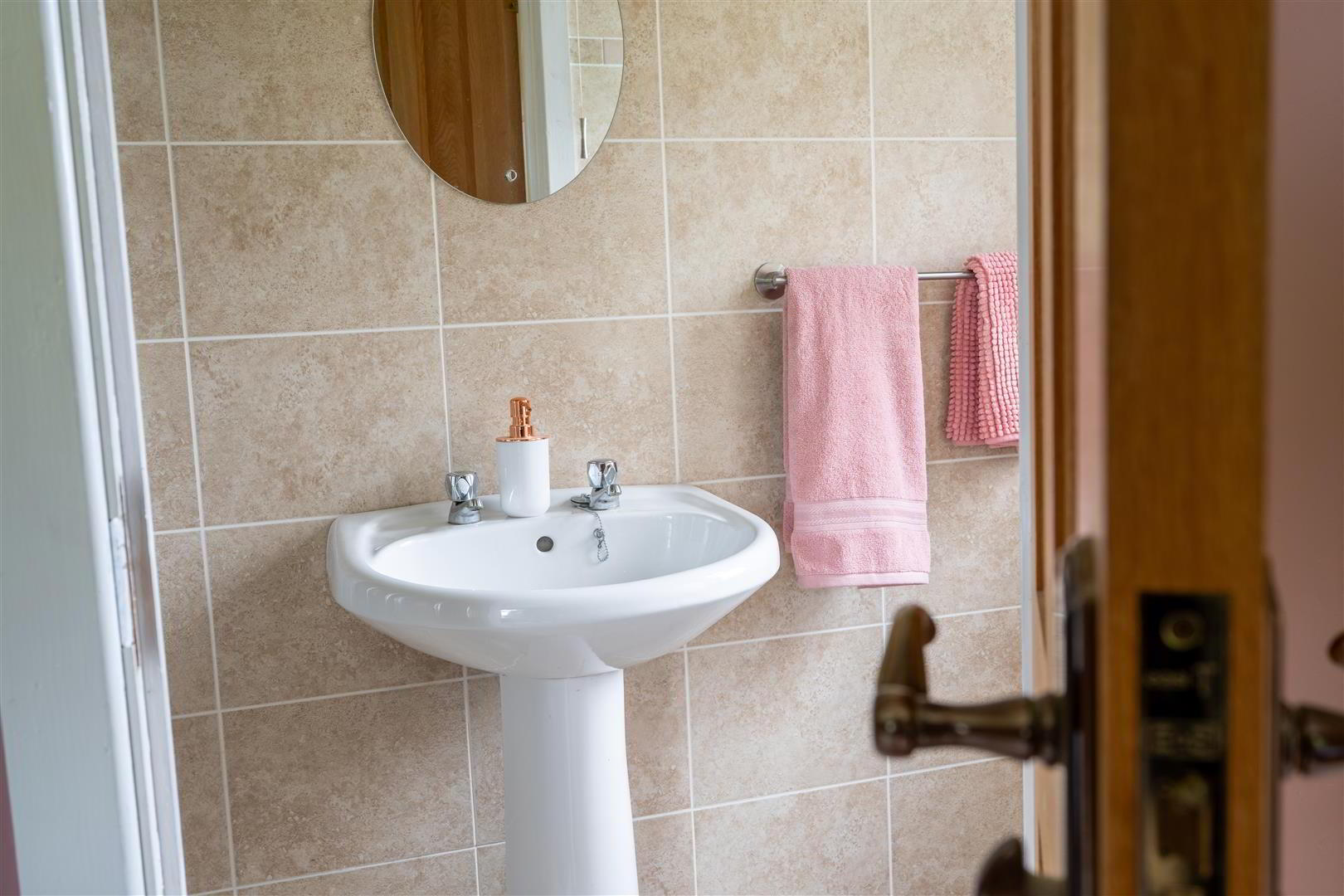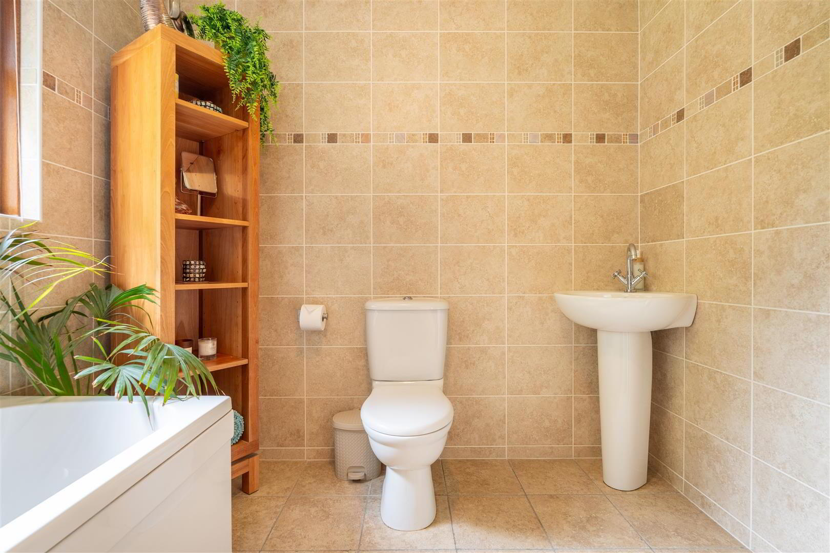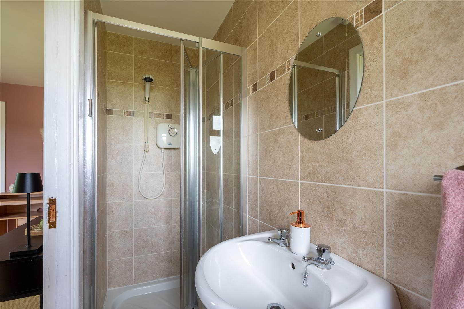 Modern white suite comprising push button low flush W/C and pedestal wash hand basin with feature tap. Fully tiled corner quadrant shower cubicle with thermostatic shower unit and glazed double doors. Fully tiled walls and floor. Gable side window. Single radiator.