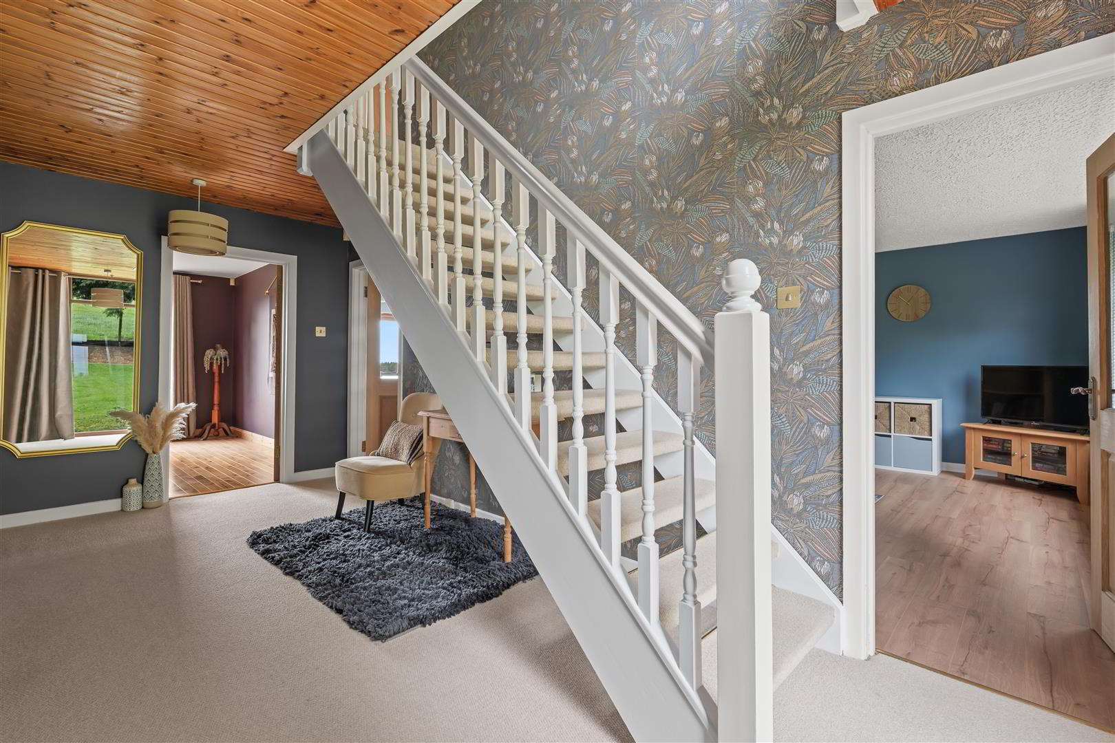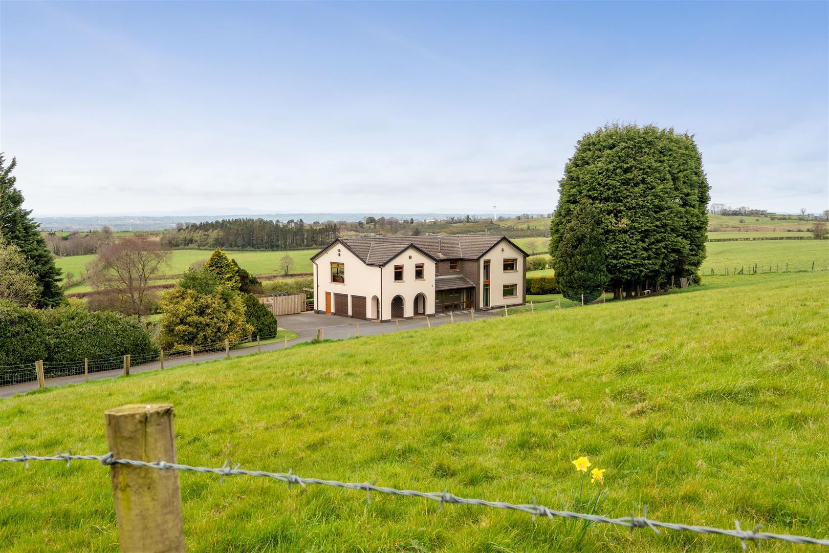 This is an incredibly rare opportunity to purchase a superb five bedroom detached house occupying a stunning mature site extending to just over one acre of mature gardens approached via a sweeping tarmac driveway to generous parking and access to double integral garage. With a very unique covered and part glazed entrance porch providing access to the spacious and welcoming entrance hall serving most of the main reception rooms together with the kitchen, adjoining snug, large utility room and integral garage. The ground floor lounge benefits from large format PVC double glazed French doors opening onto the generous patio area and timber decking. The kitchen with informal dining area boasts a full range of "Pearwood" high and low level units highlighted by contrasting polished granite worktops to the centre island, raised breakfast bar and feature curved units on the window wall. With a more informal living area and separate dining room making this the ideal home for entertaining the main lounge can be found on the first floor taking full advantage of the stunning views through triple aspect picture windows over the surrounding countryside towards Lough Neagh and providing glorious sunsets over the Sperrin Mountains. Further enhanced with an open fire finished in polished marble and granite together with the warmth of the woodstrip ceiling this large reception room measuring 31'3 x 18'10 has the capacity to be reconfigured to create a dance studio, gym, cinema, snooker room or superb principal bedroom with additional ensuite and casual sitting.