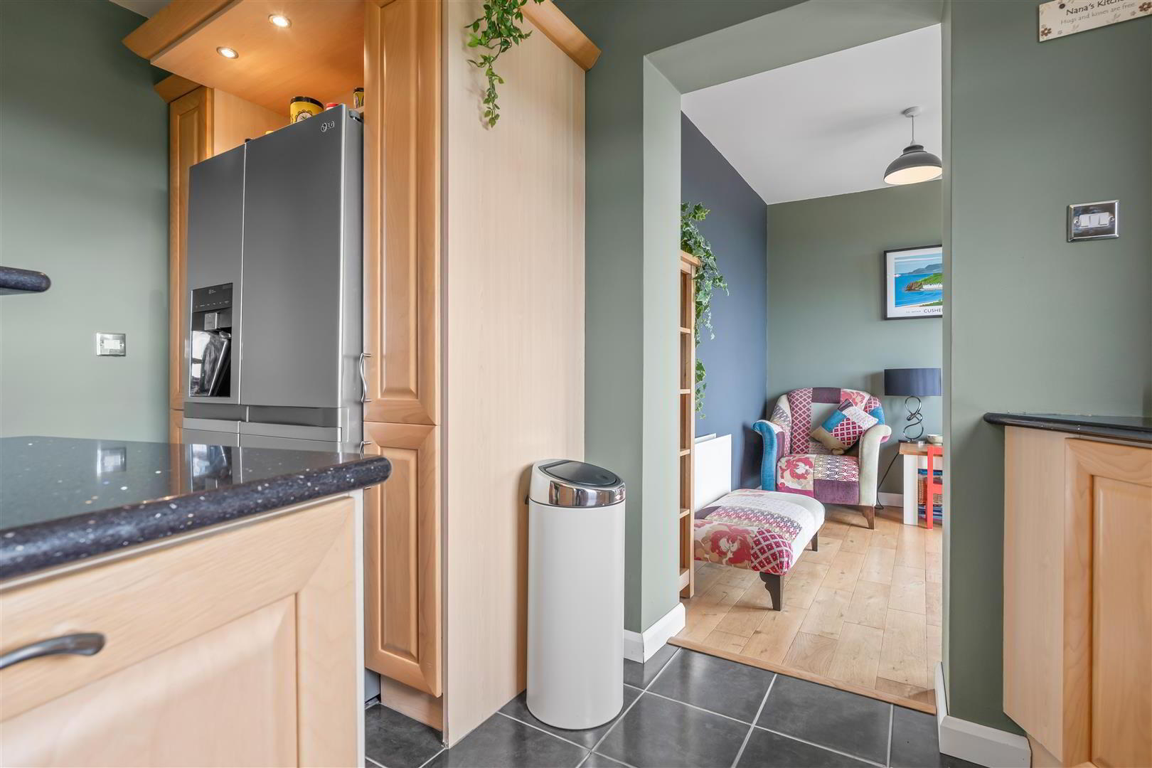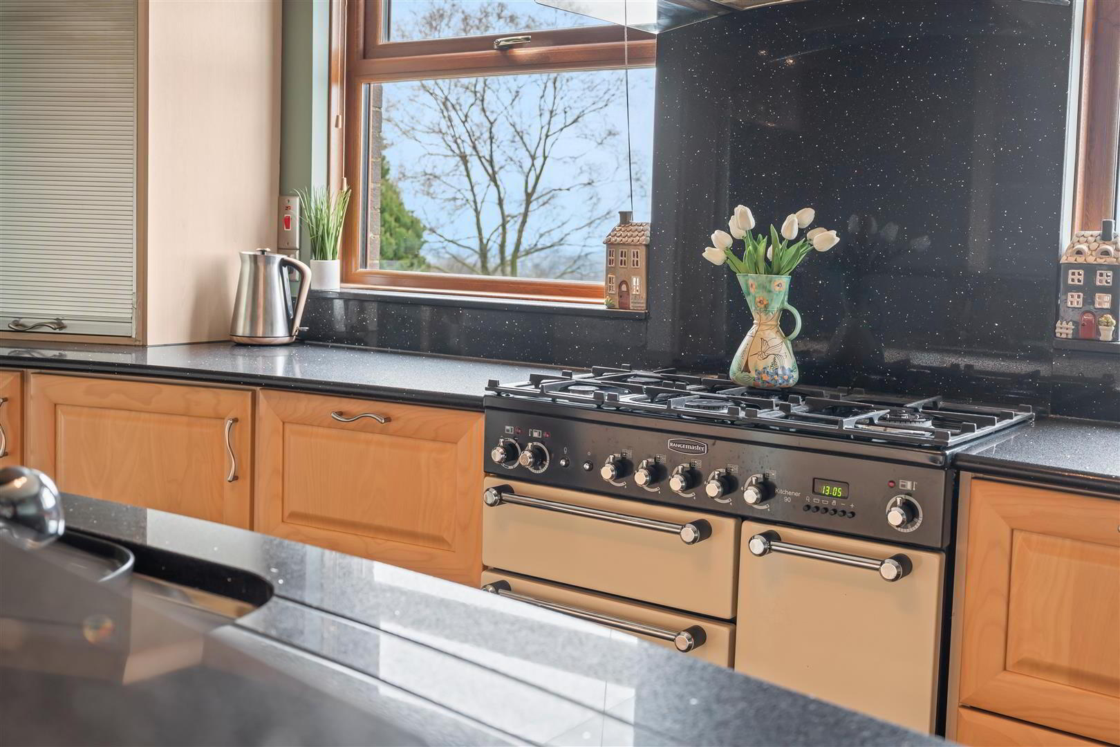 Full range of coloured "Shaker" style high and low level units with polished chrome handles and contrasting butchers block work surfaces. Single drainer stainless steel sink unit and mixer tap. Mid level double oven. Plumbed for washing machine and space for dryer. Tiled effect wood laminate floor. Single radiator. Door to integrated boiler house and insulated copper cylinder with "Willis" type immersion heater.