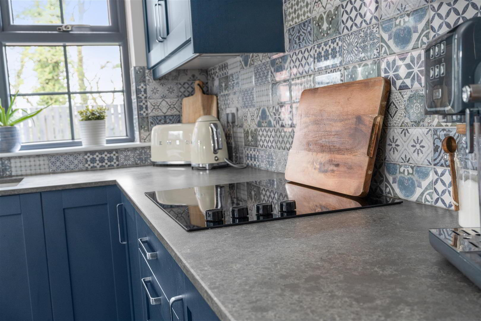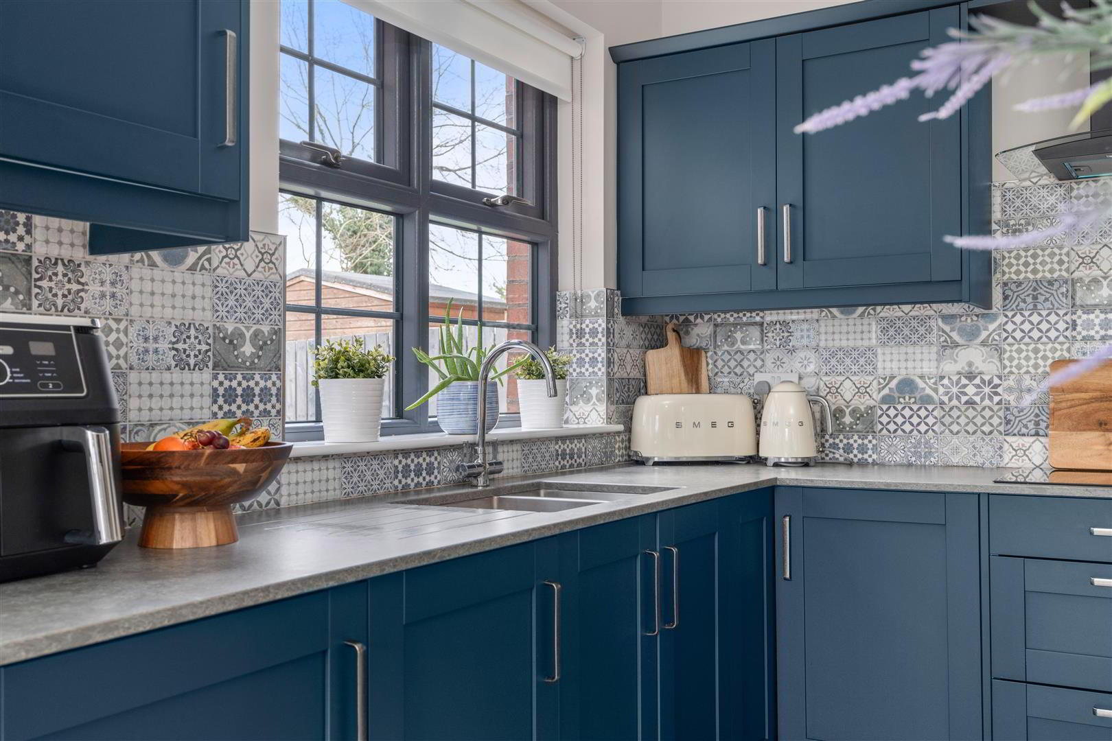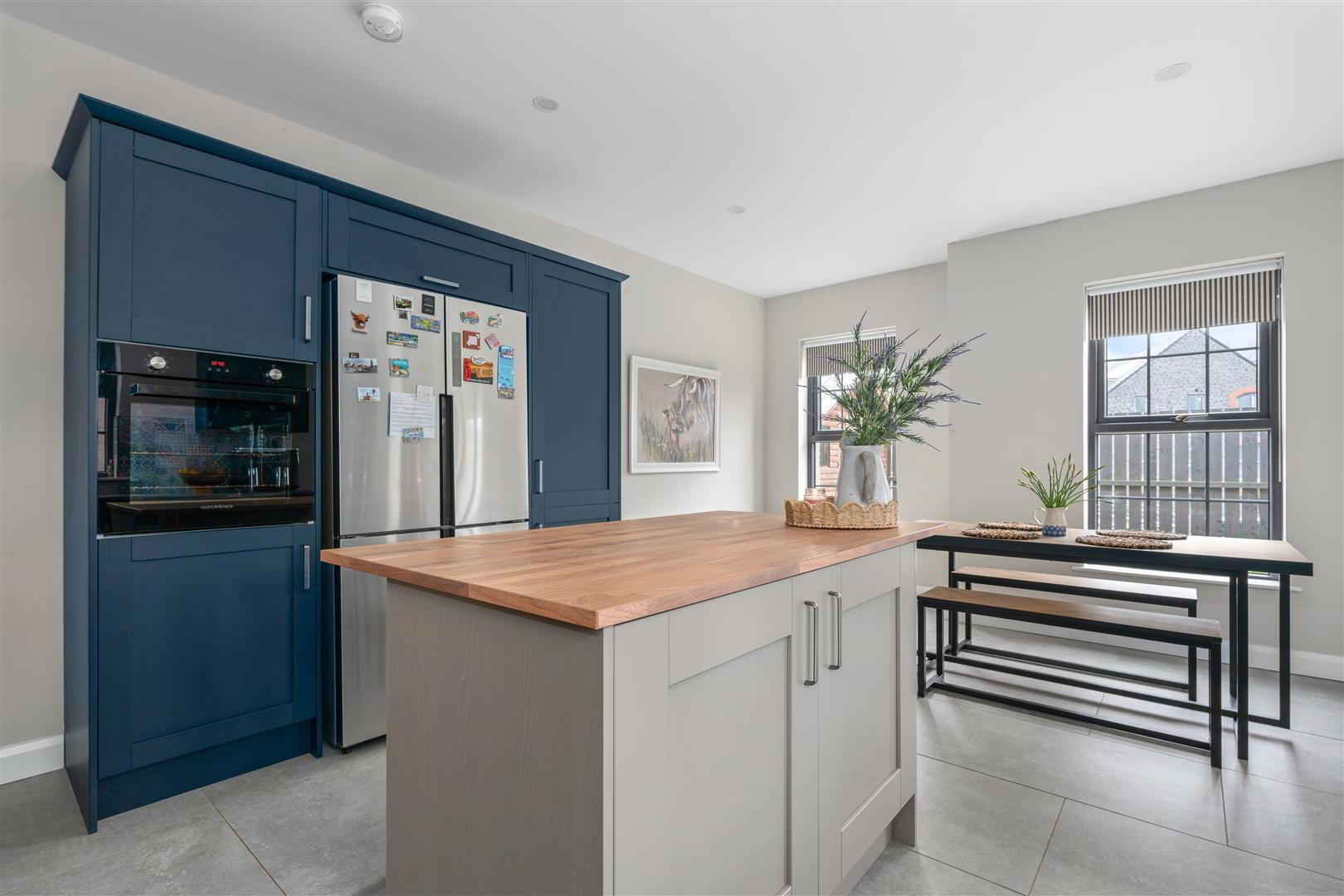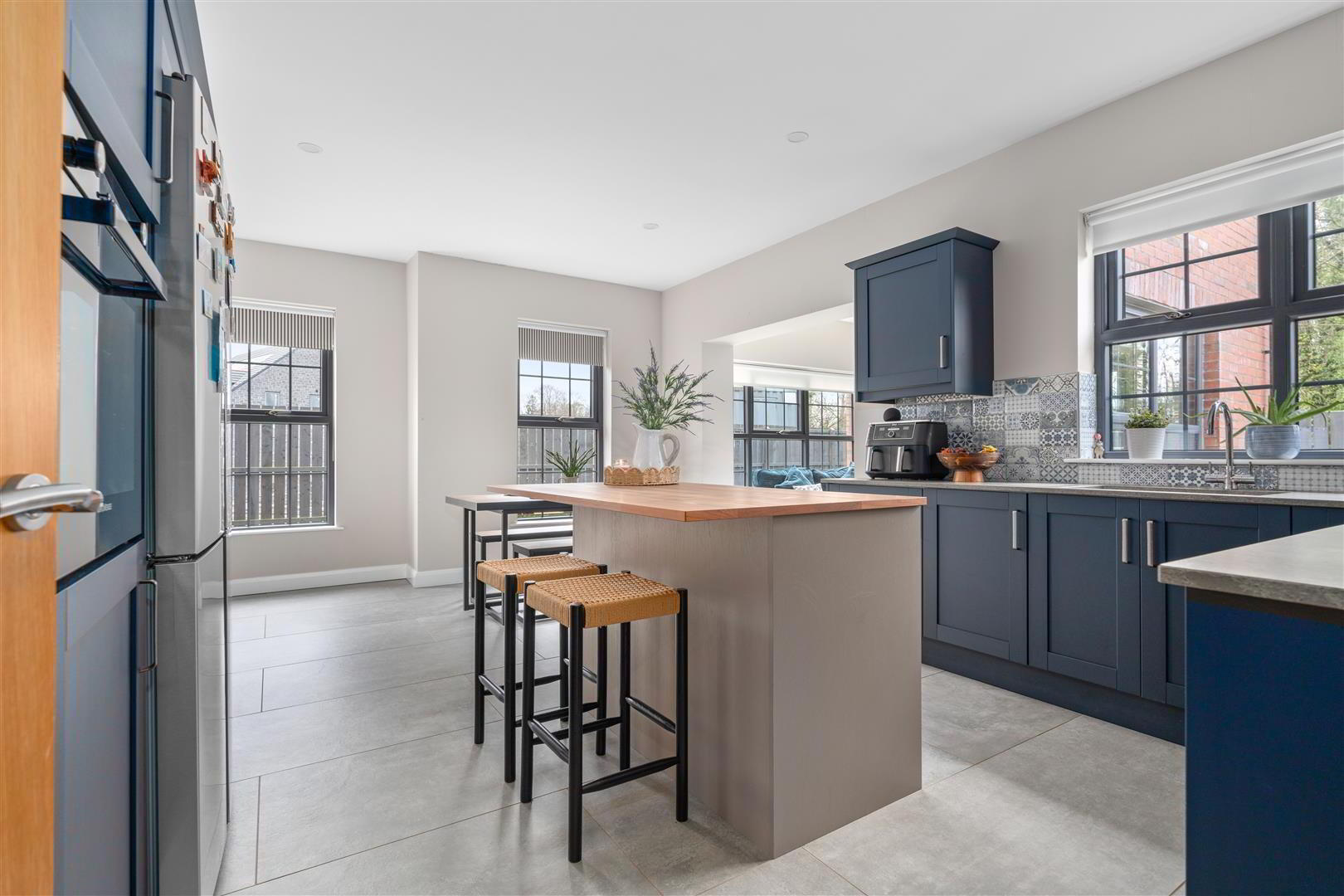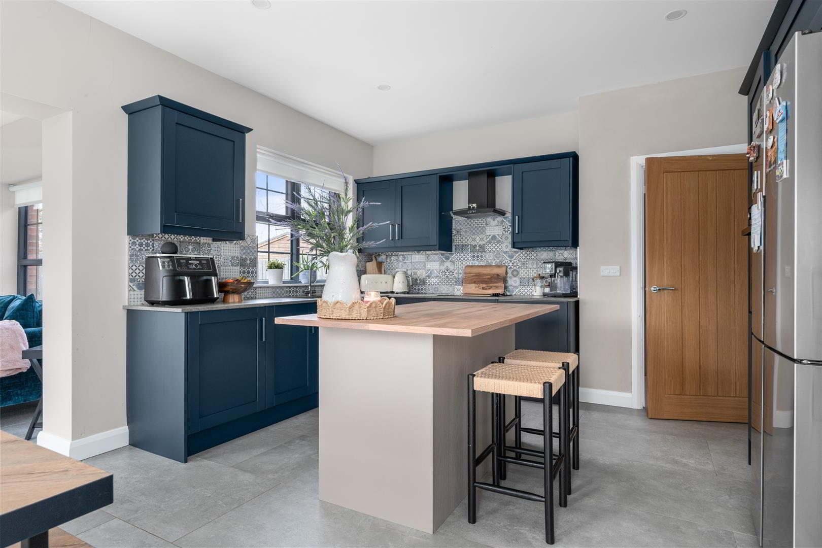 • Fully fitted range of blue 'Shaker' style high and low level kitchen units with complimentary granite worktops / Kitchen island with contrasting kitchen units / Ceramic tiled flooring