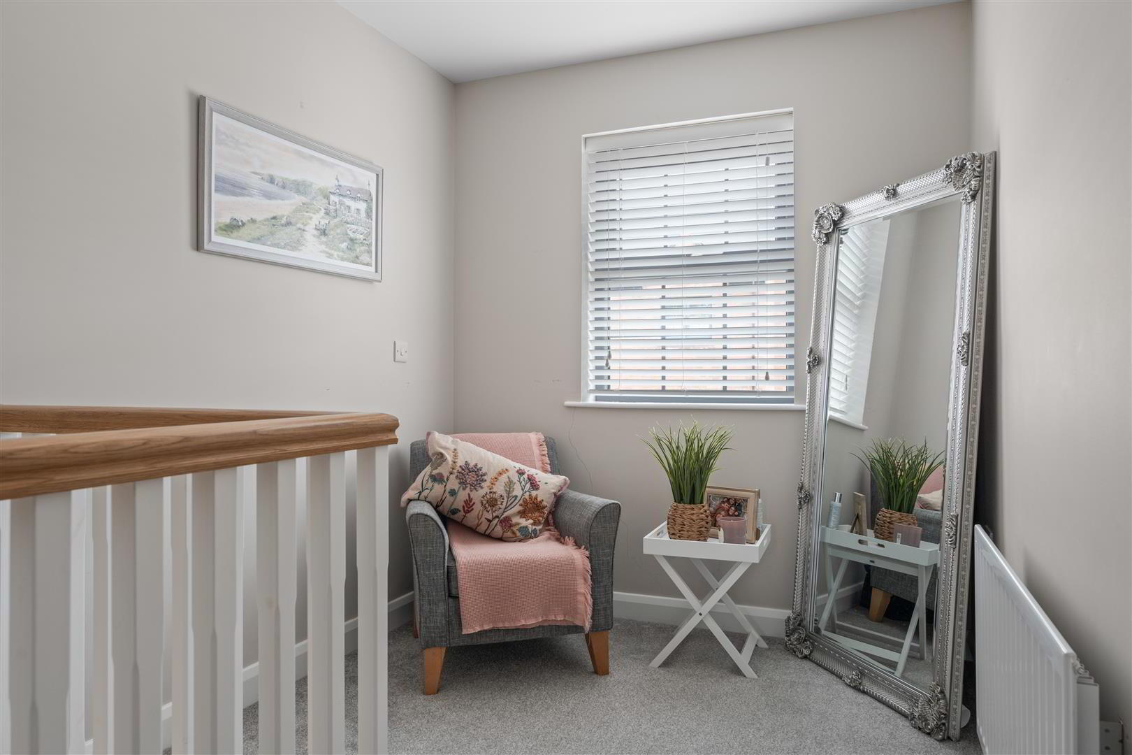 Comprising sixty by one hundred and twenty floor tiling. Staircase to first floor with oak moulded handrail, redwood painted spindles and newel post. Understairs storage cupboard. Double radiator.