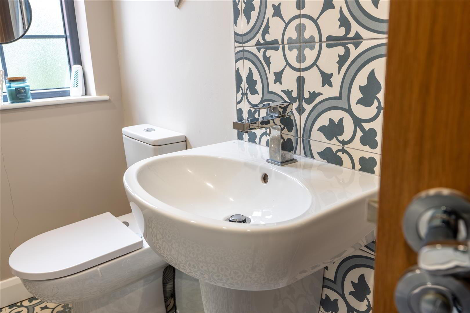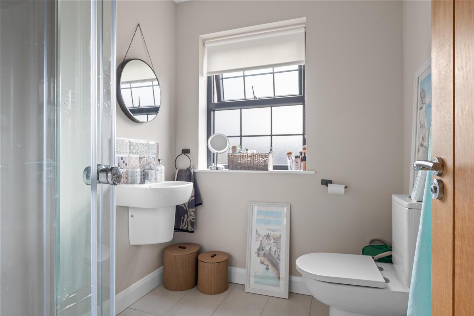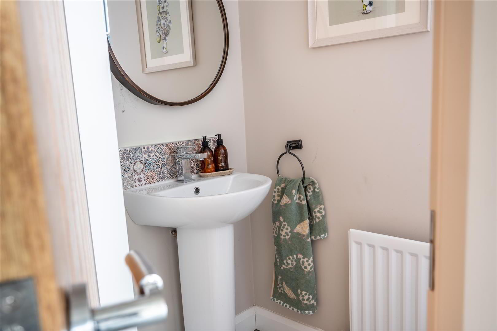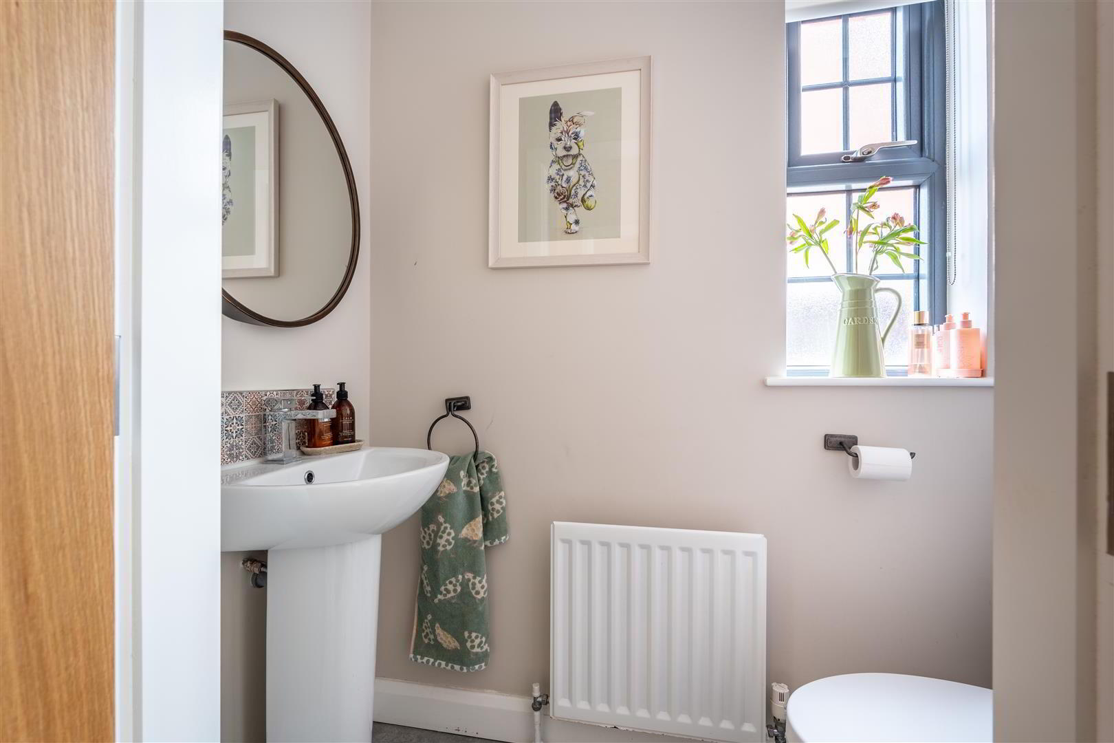 Modern white suite comprising a pedestal wash hand basin with monobloc chrome mixer tap and decorative tiled splashback. Low flush push button WC. Sixty by one twenty floor tiling. Extractor fan. Single radiator.