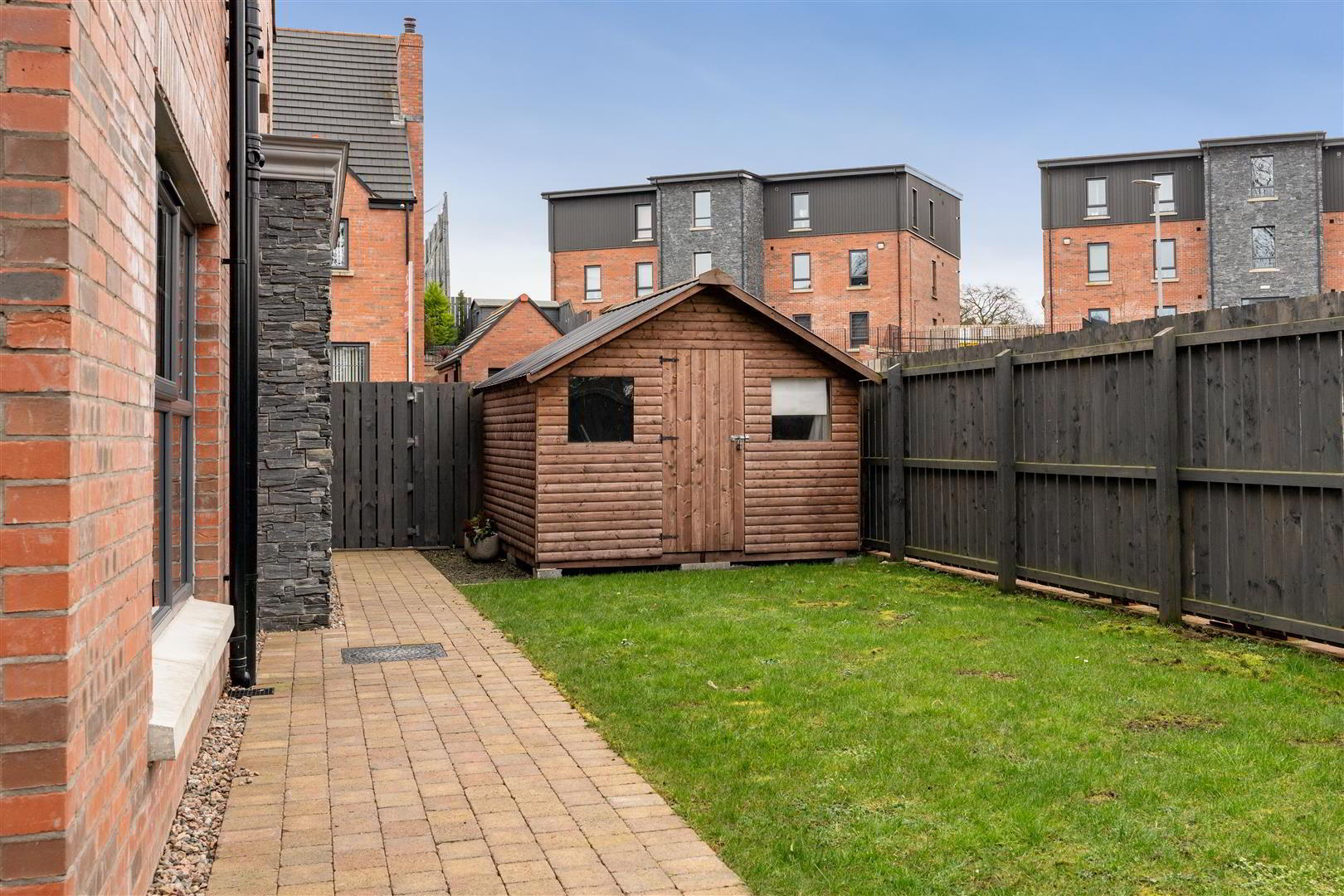 Fully enclosed rear and side garden offering exceptional privacy and superb sun orientation. Six foot timber fencing and pedestrian gate to front on either side. Brick paved patio and brick Pavia pathway bordering rear of house. Neat lawn. Outside tap, outside lighting and outside power. Ducting and wiring in place to provide power to timber shed which can be negotiated.